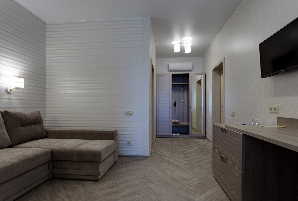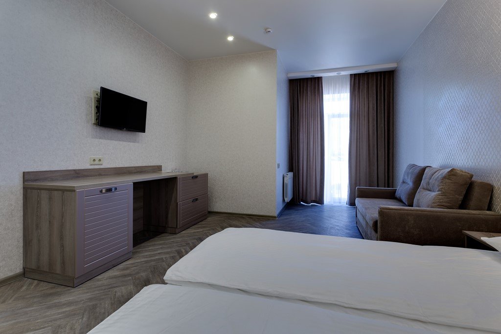 Комфортабельный светлый двухкомнатный номер, состоящий из двух номеров Standart new, объединенных межкомнатной дверью. Номера на первом и втором этажах с балконом и без балконов.