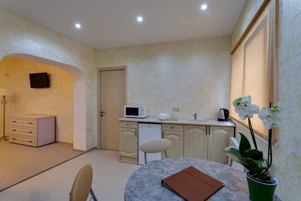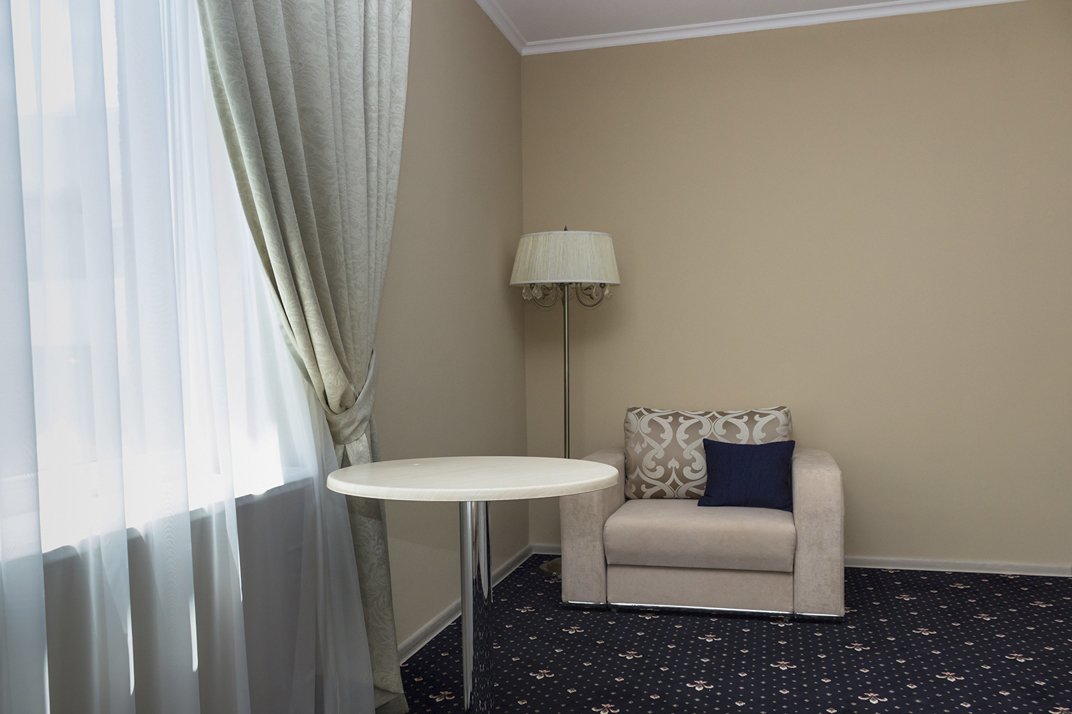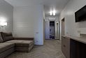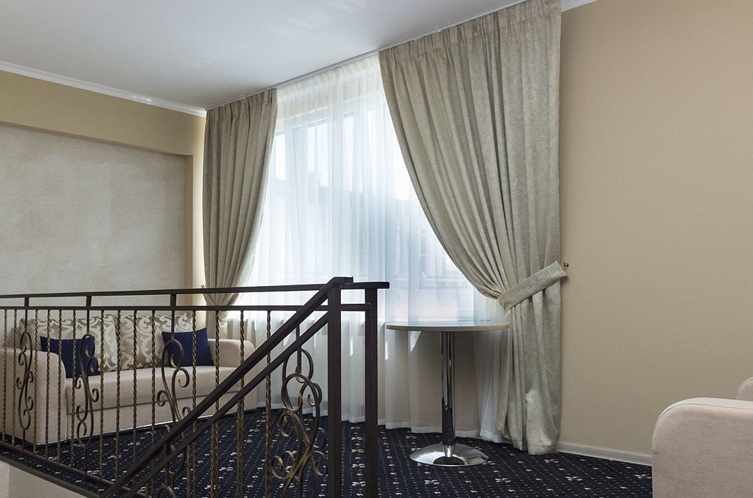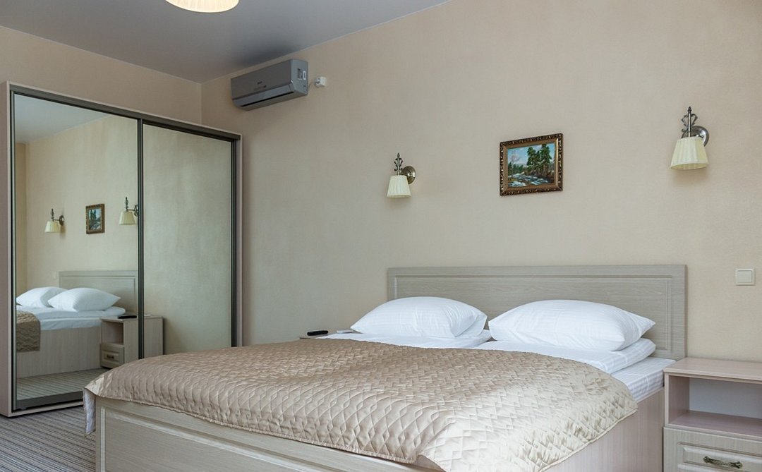 Большой комфортабельный двухуровневый номер с обеденной зоной. В номере: гардероб, кондиционер, телевизор, холодильник, стол, сейф, микроволновая печь, электрический чайник. Санузел с душем, фен, комплект полотенец.