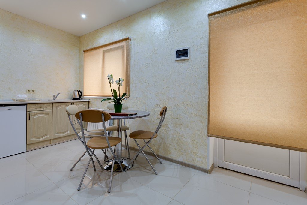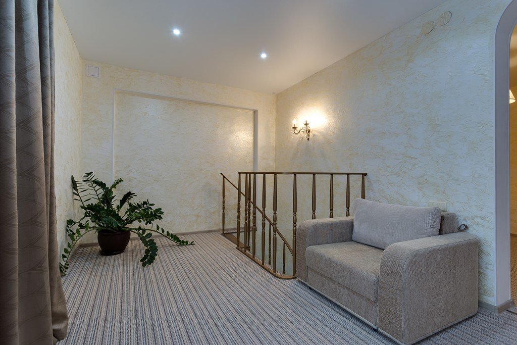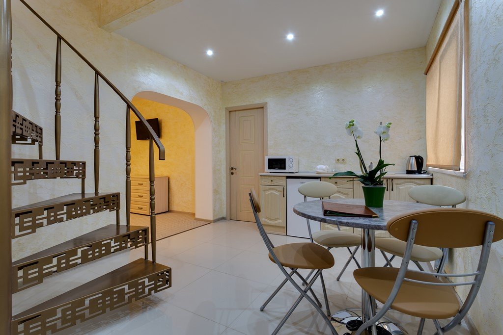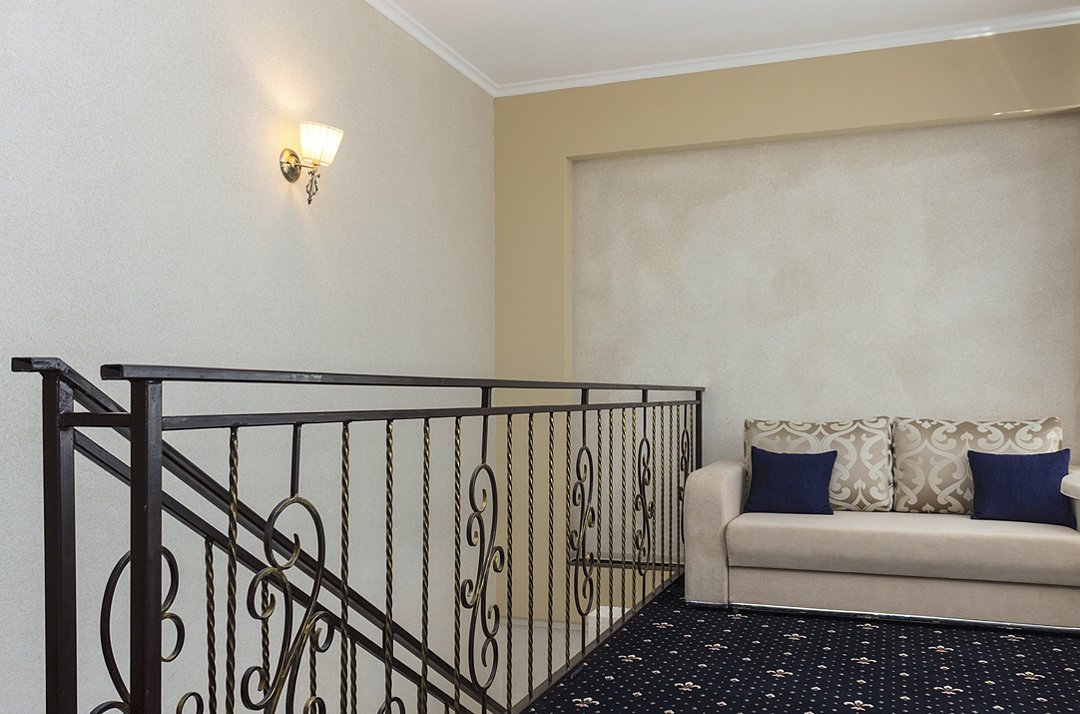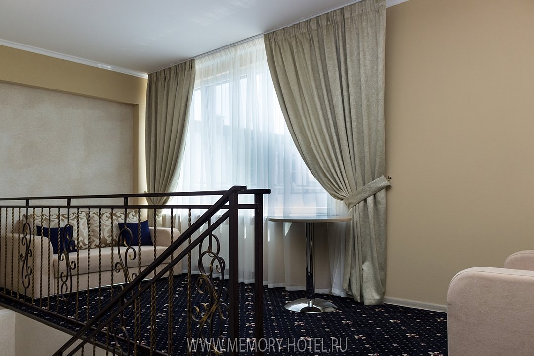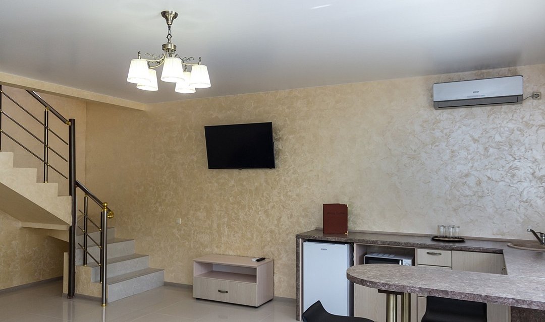 Большой комфортабельный двухуровневый номер с винтовой лестницей и обеденной зоной. В номере гардероб, кондиционер, телевизор, холодильник, стол, сейф, микроволновая печь, электрический чайник, санузел с душем, фен, комплект полотенец.