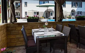 Кухня: европейская кухняПитание организовано в кафе, где гости могут попробовать традиционную европейскую и домашнюю кухню, а также вегетарианские блюда. В меню представлены комплексные завтраки, обеды, заказные ужины и блюда, приготовленные на мангале.
