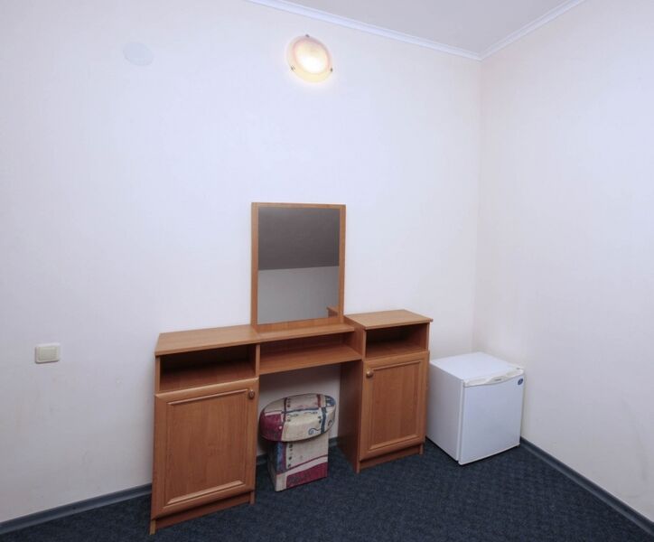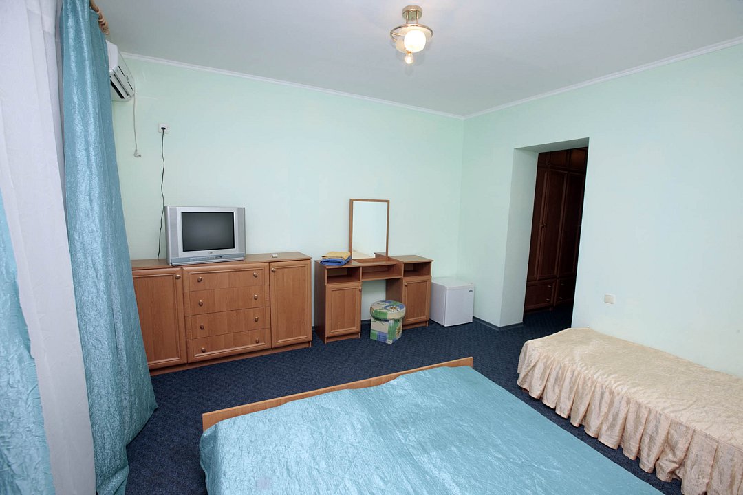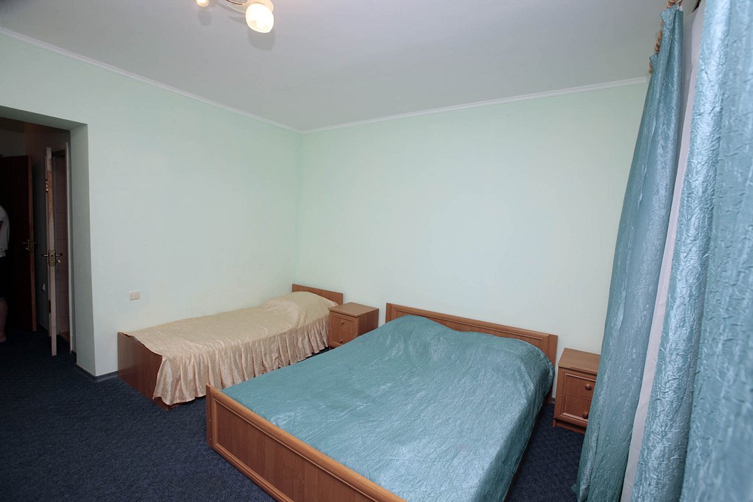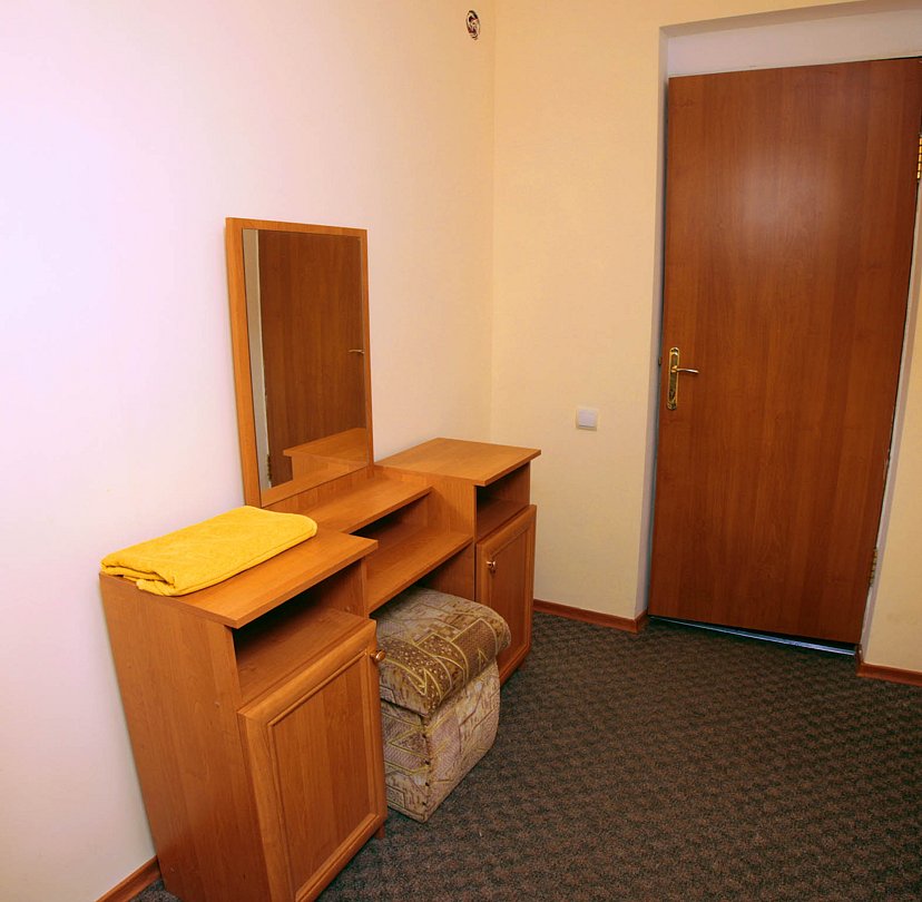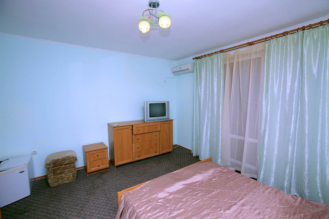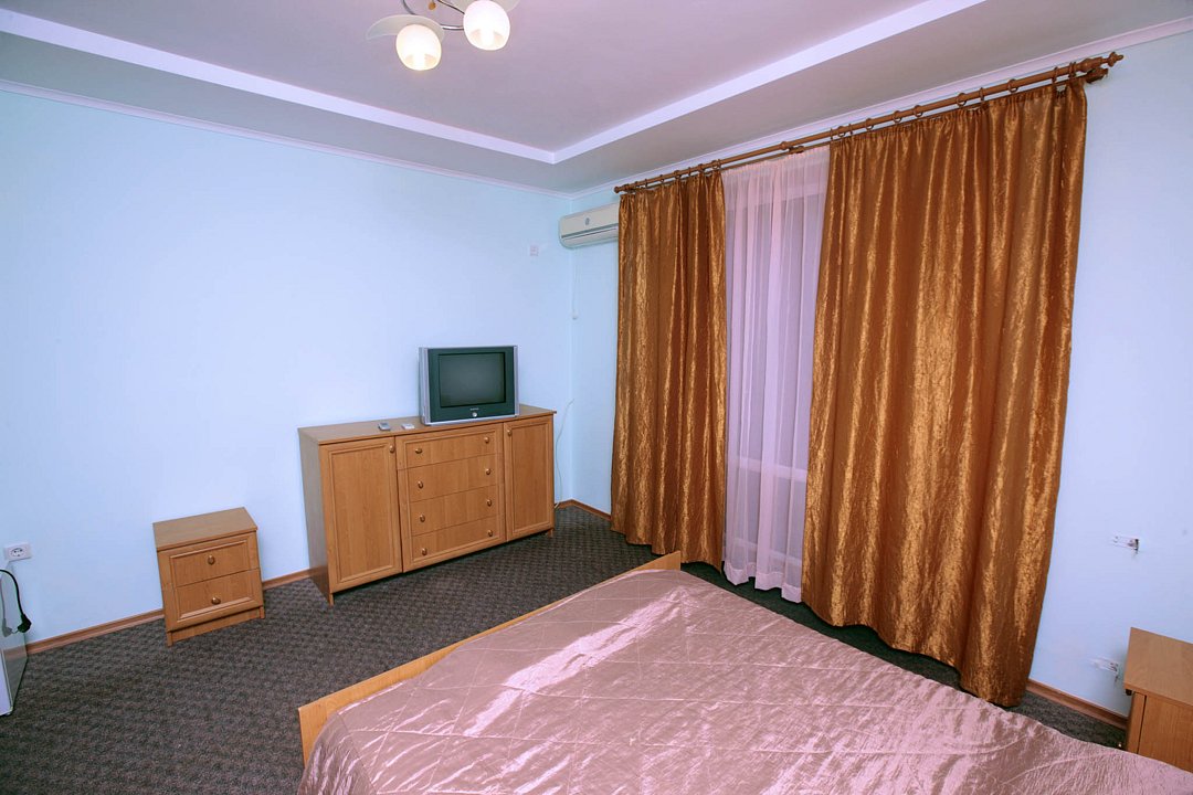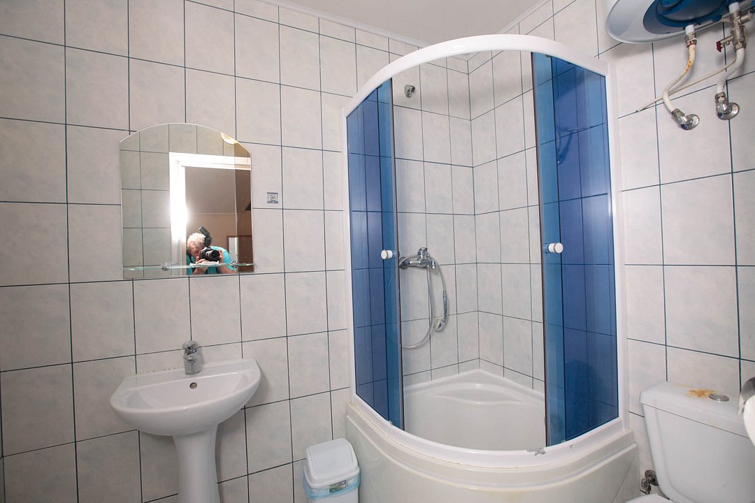 Номер брали простой, одна большая кровать, прикроватные тумбочки, трюмо, большущий шкаф для одежды и комод, на котором стоял телевизор старого образца. Мебель не новая, но ее много и вместительная. К телевизору присоединена цифровая приставка, проверили – работает, показывает 5 каналов. Ванная комната обычная, душевая кабина не модульная, просто поддон и створки. Что приятно – стоит водонагреватель, вода горячая была всегда. Выдали по 2 полотенца – большое и маленькое. Фен мы попросили – дали маленький. Из минусов – нет плечиков для одежды (так и не дали), всего одна розетка в комнате (стоит тройник), очень тусклый свет, негде сушить белье (использовали ручки на шкафах и дверцы). Брали только завтраки, они замечательные! Всегда разные блюда. Выбора нет, приносят то, что приготовили. Например, один день – рисовая каша, очень вкусная, яичница, свежие овощи, всегда хлеб и чай/кофе; в другой день – творожная запеканка, омлет с колбасой, и т.д. Сытно и вкусно.