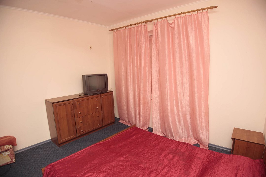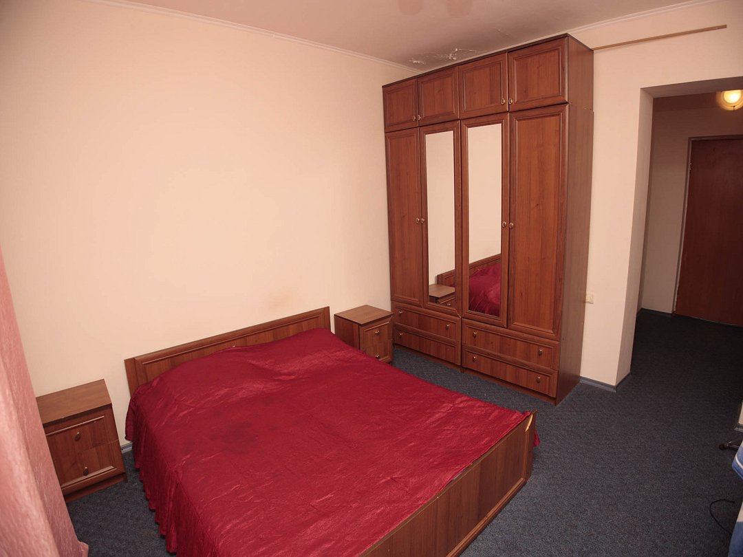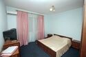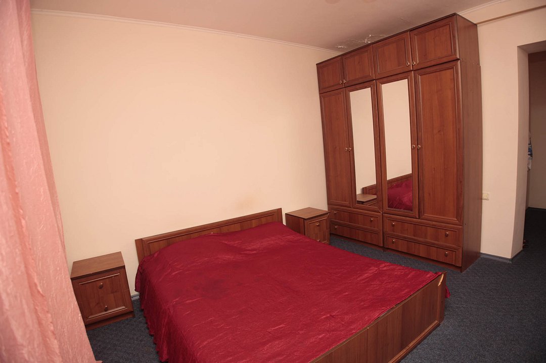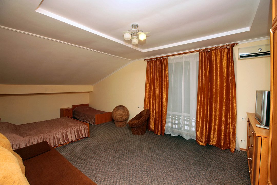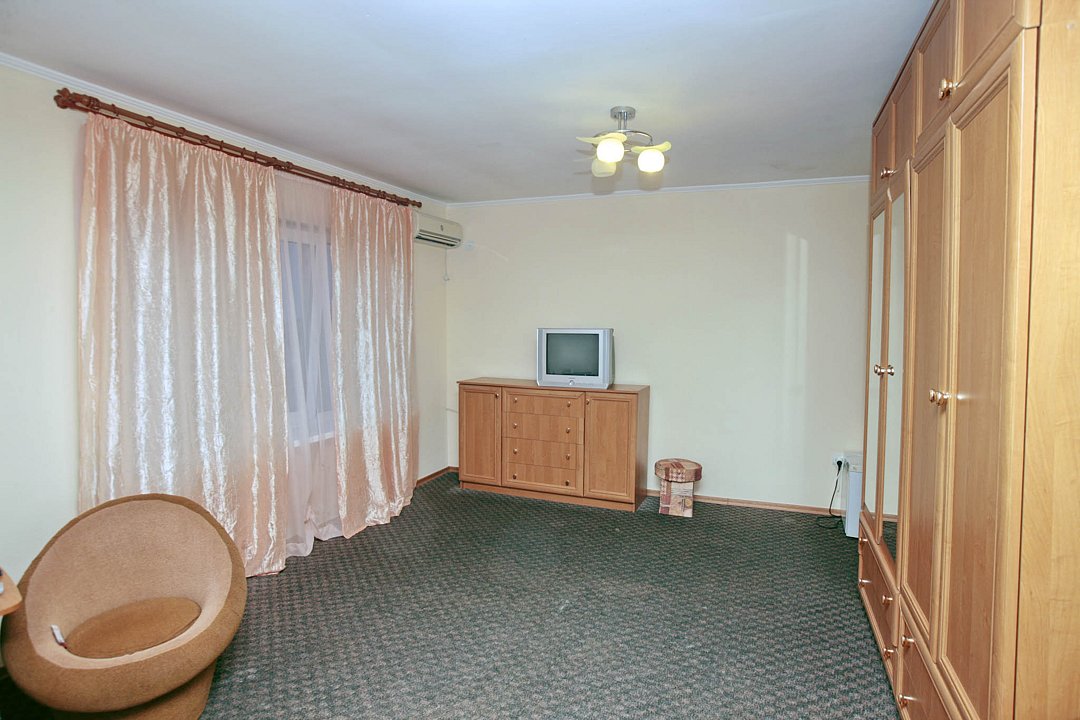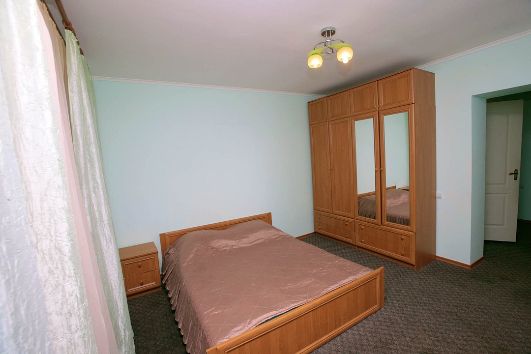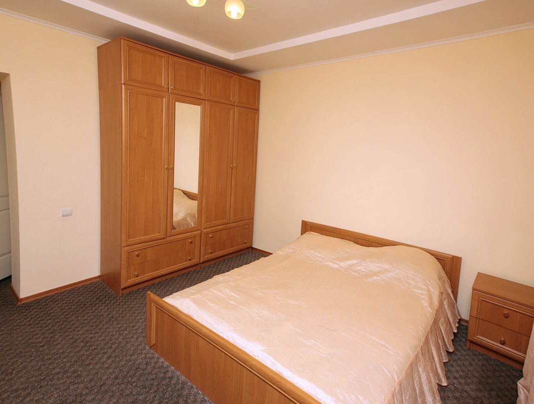 Номер брали простой, одна большая кровать, прикроватные тумбочки, трюмо, большущий шкаф для одежды и комод, на котором стоял телевизор старого образца. Мебель не новая, но ее много и вместительная. К телевизору присоединена цифровая приставка, проверили – работает, показывает 5 каналов. Ванная комната обычная, душевая кабина не модульная, просто поддон и створки. Что приятно – стоит водонагреватель, вода горячая была всегда. Выдали по 2 полотенца – большое и маленькое. Фен мы попросили – дали маленький. Из минусов – нет плечиков для одежды (так и не дали), всего одна розетка в комнате (стоит тройник), очень тусклый свет, негде сушить белье (использовали ручки на шкафах и дверцы). Брали только завтраки, они замечательные! Всегда разные блюда. Выбора нет, приносят то, что приготовили. Например, один день – рисовая каша, очень вкусная, яичница, свежие овощи, всегда хлеб и чай/кофе; в другой день – творожная запеканка, омлет с колбасой, и т.д. Сытно и вкусно.