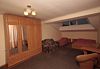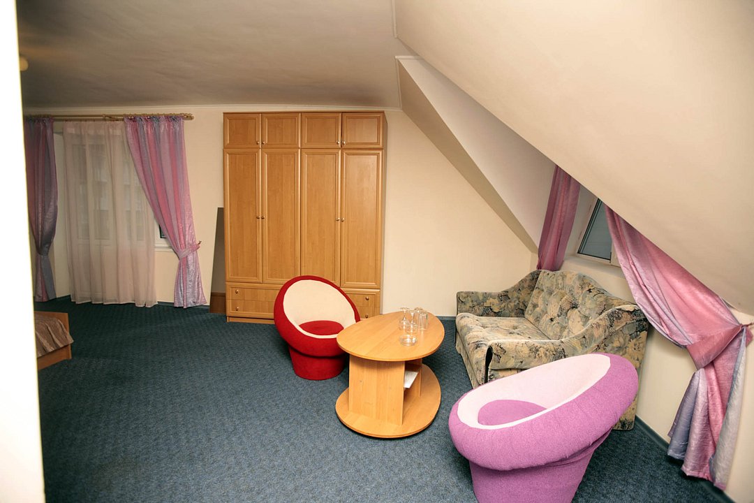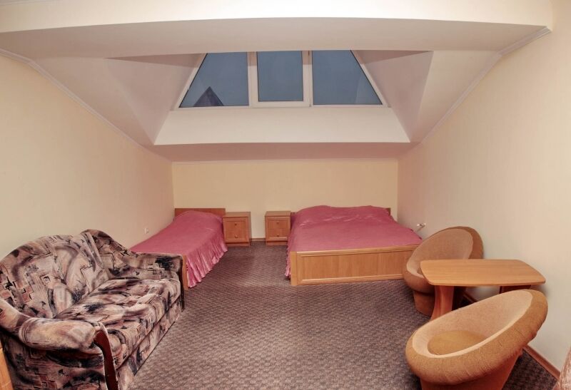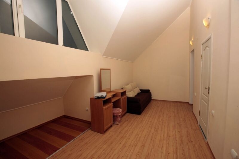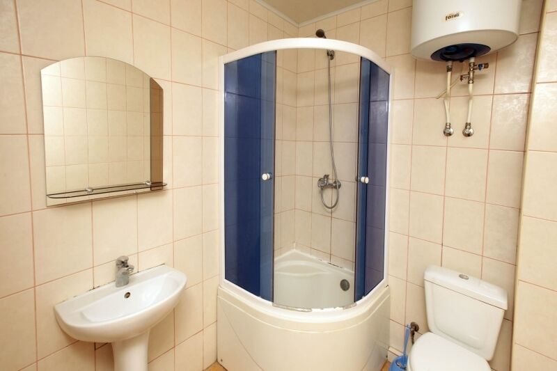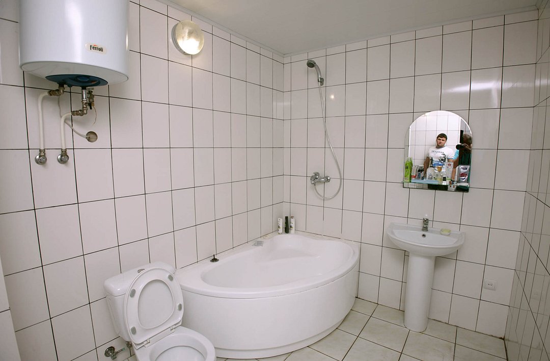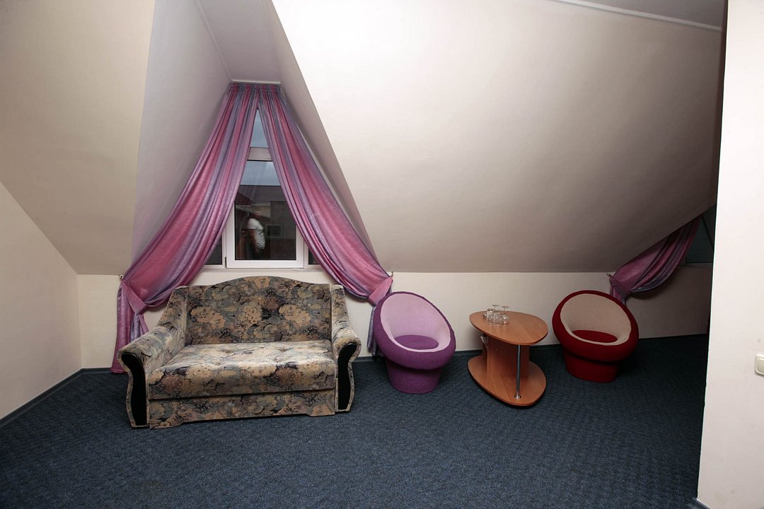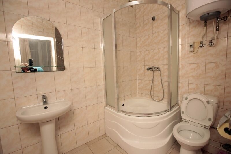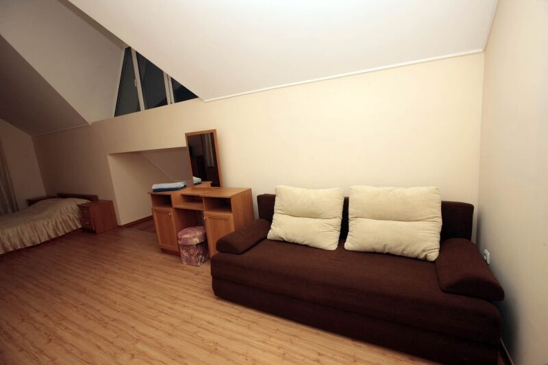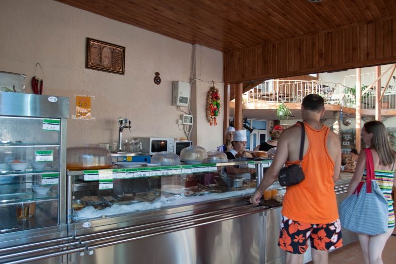 Номер брали простой, одна большая кровать, прикроватные тумбочки, трюмо, большущий шкаф для одежды и комод, на котором стоял телевизор старого образца. Мебель не новая, но ее много и вместительная. К телевизору присоединена цифровая приставка, проверили – работает, показывает 5 каналов. Ванная комната обычная, душевая кабина не модульная, просто поддон и створки. Что приятно – стоит водонагреватель, вода горячая была всегда. Выдали по 2 полотенца – большое и маленькое. Фен мы попросили – дали маленький. Из минусов – нет плечиков для одежды (так и не дали), всего одна розетка в комнате (стоит тройник), очень тусклый свет, негде сушить белье (использовали ручки на шкафах и дверцы). Брали только завтраки, они замечательные! Всегда разные блюда. Выбора нет, приносят то, что приготовили. Например, один день – рисовая каша, очень вкусная, яичница, свежие овощи, всегда хлеб и чай/кофе; в другой день – творожная запеканка, омлет с колбасой, и т.д. Сытно и вкусно.