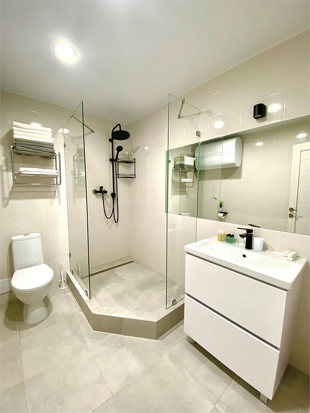 Удобства на пляже: душ, санузелПесчаный пляж