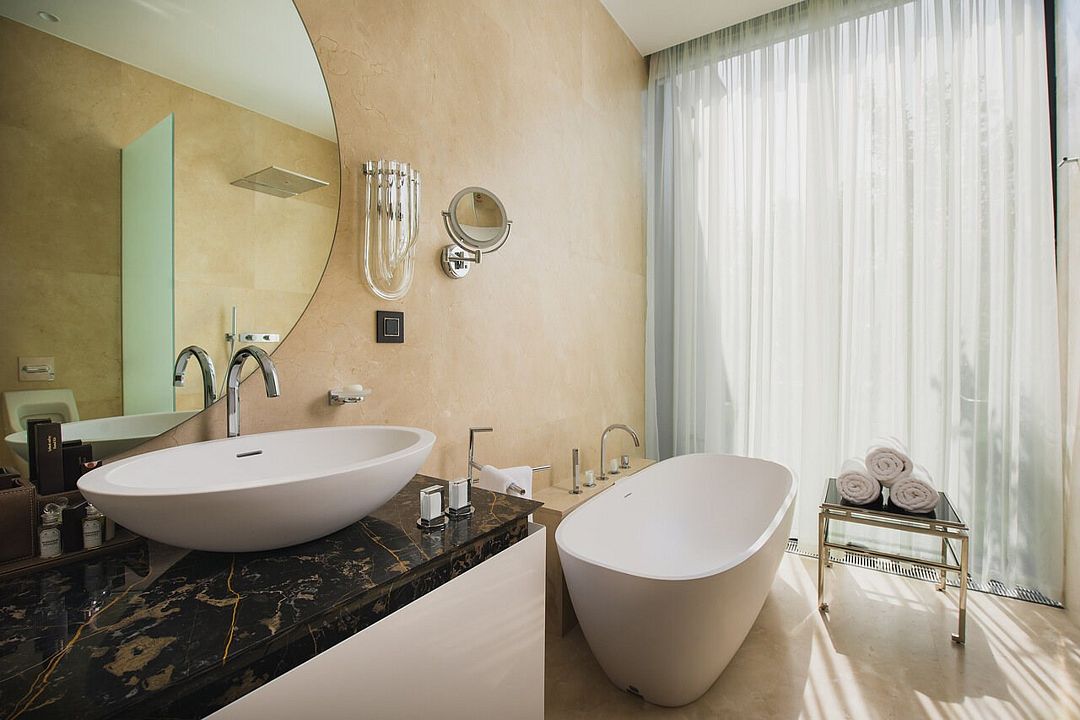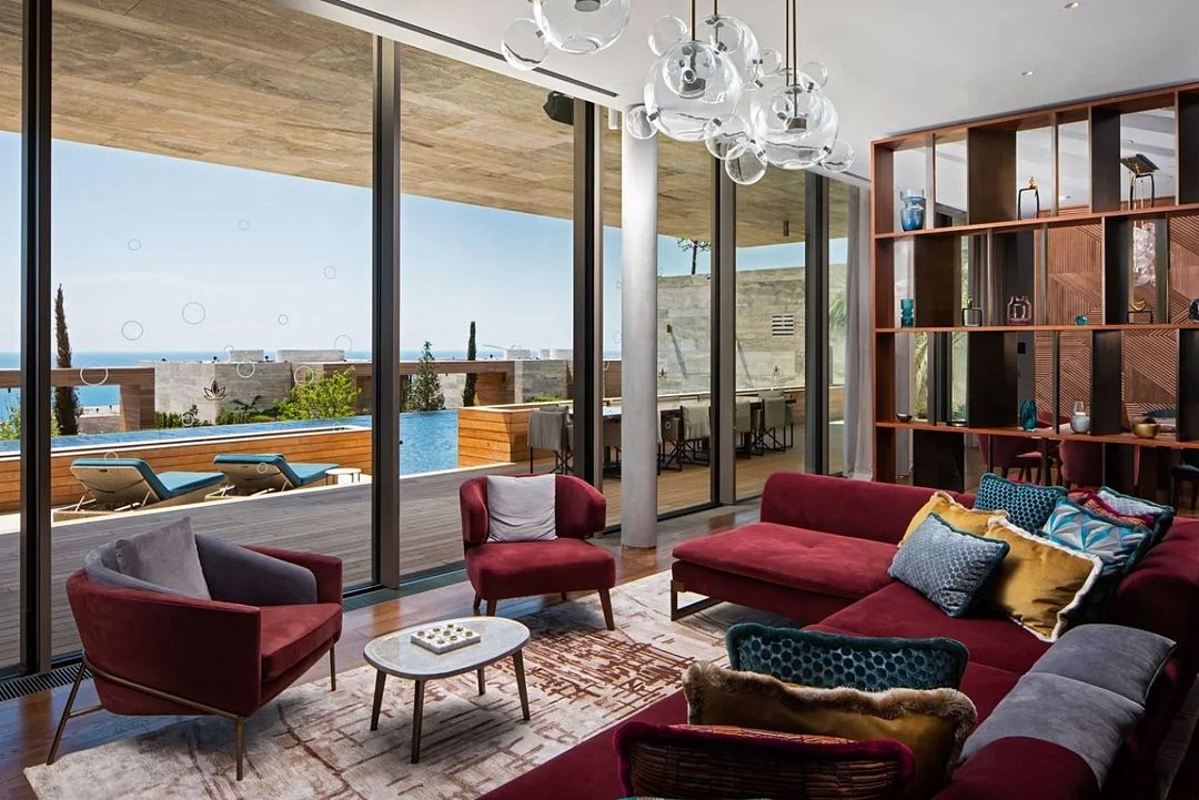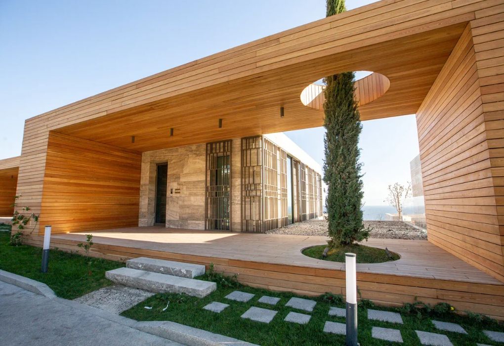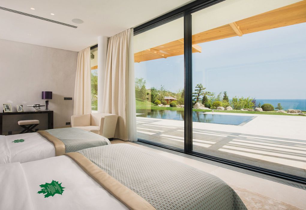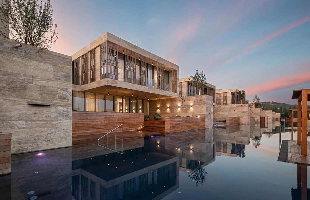 Комплекс возвышается на благоустроенной территории с роскошным парком. Известный английский архитектор Норман Фостер, проектировавший санаторий, придал главному зданию комплекса вид цветка с четырьмя лепестками-корпусами. Возле этого корпуса расположены еще 14 вилл. Оригинальное архитектурное решение гармонирует с местным пейзажем – горами и морем.