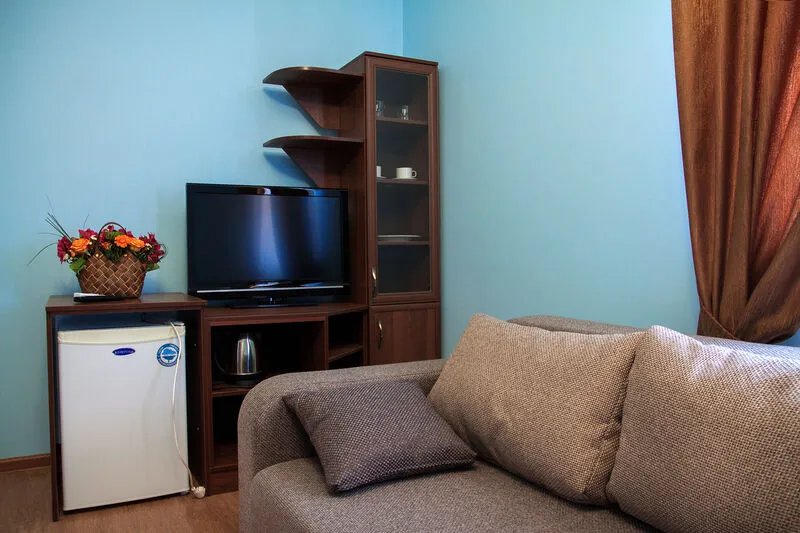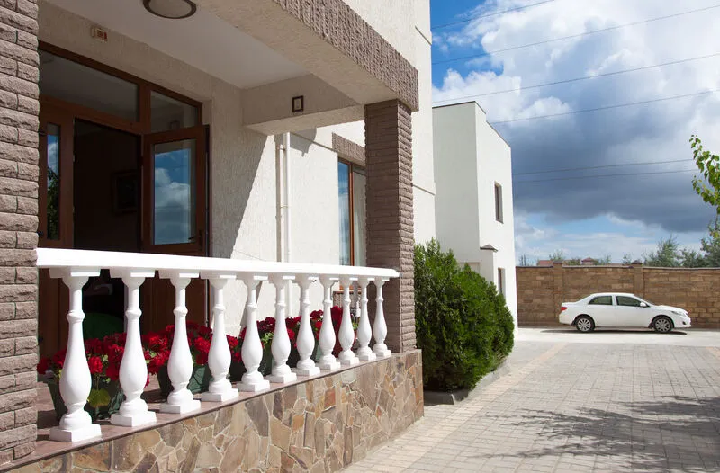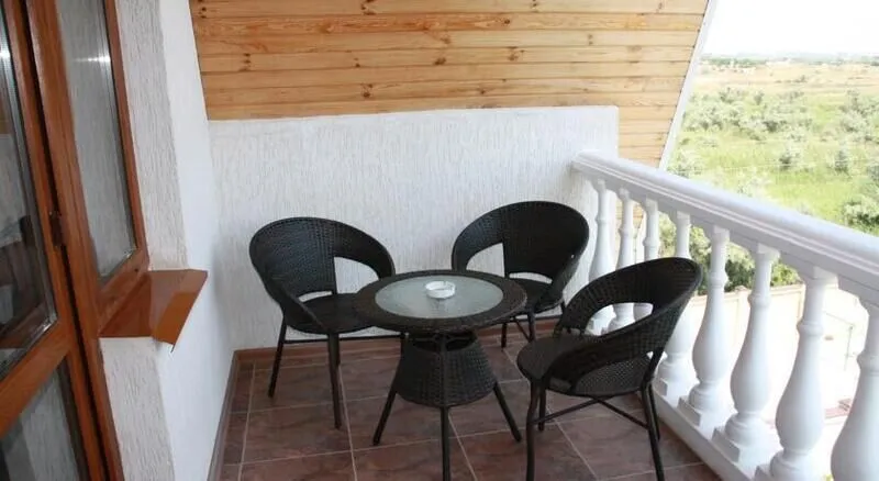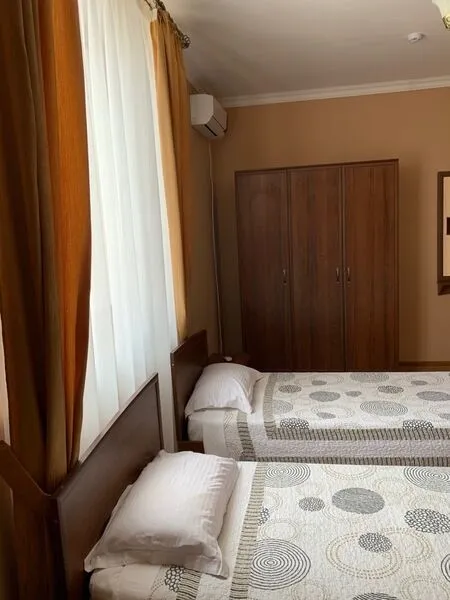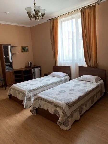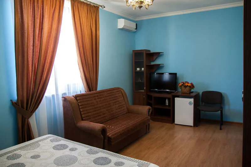 Путешествие с семьейОтличный отель для семейного отдыхаНебольшой частный отель в Саки порадовал хорошим ремонтом, новой мебелью, кондиционером и интернетом, спутниковым телевидением, домашней кухней, заботливым отношением и бюджетными ценами. Есть бассейн, сауна, от моря метров 300, через базу отдыха Прибой. Пляж общественный, но чистый, песчаный, широкий. Питались здесь же, все свежее, готовят вкусно. При желании можно договорится чтобы встретили, но в общем-то от аэропорта недалеко, около 50 км. наверное. Для путешествующих на машине есть парковка. Территория ухоженная, небольшая, все зелено, в цветах. Детям есть где побегать.