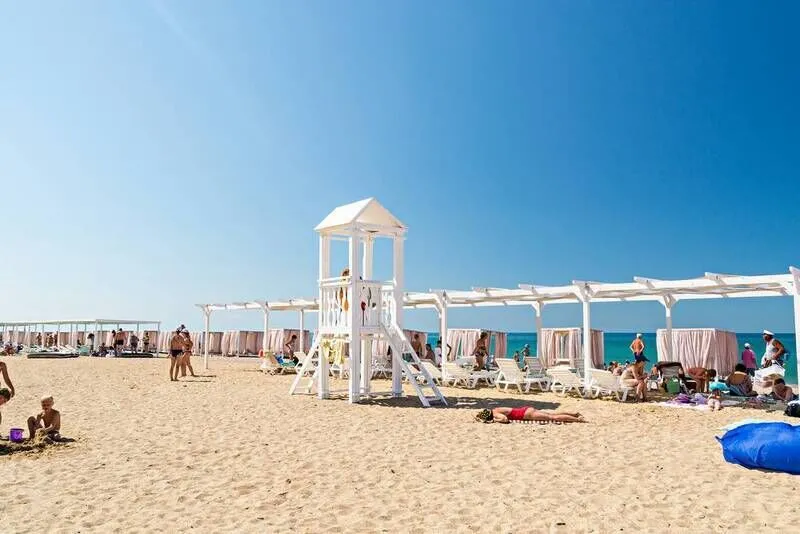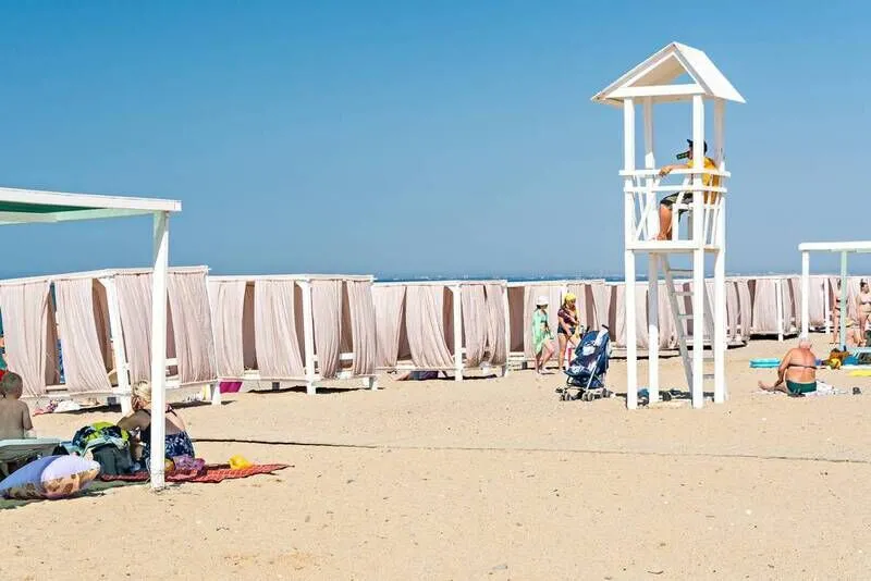 Широкий песчаный пляж располагается в 2-3 минутах ходьбы. Пляж оборудован навесами, раздевалками, душем. Магазины, продуктовый рынок, кафе , столовые и развлечения для детей в шаговой доступности от отеля.