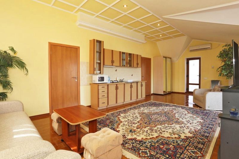 2-х комнатный номер, рассчитанный на 4 человека. Одна из комнат – гостиная с оборудованной мини-кухней, вторая – спальня. В гостиной имеется: раскладной диван с двумя креслами, телевизор, кондиционер, сейф, беспроводной доступ к интернету, обеденный стол. Мини-кухня оборудована: индукционной плитой, микроволновой печью, холодильником, электрочайником, раковиной, необходимым набором посуды. В спальне есть: двуспальная кровать с прикроватными тумбочками, шкаф для вещей, москитная сетка. Санузел состоит из душа, унитаза и раковины, есть фен и полотенца. Предоставляется сушка для вещей. В холодное время года работает отопление и подогрев пола.Спальные места
