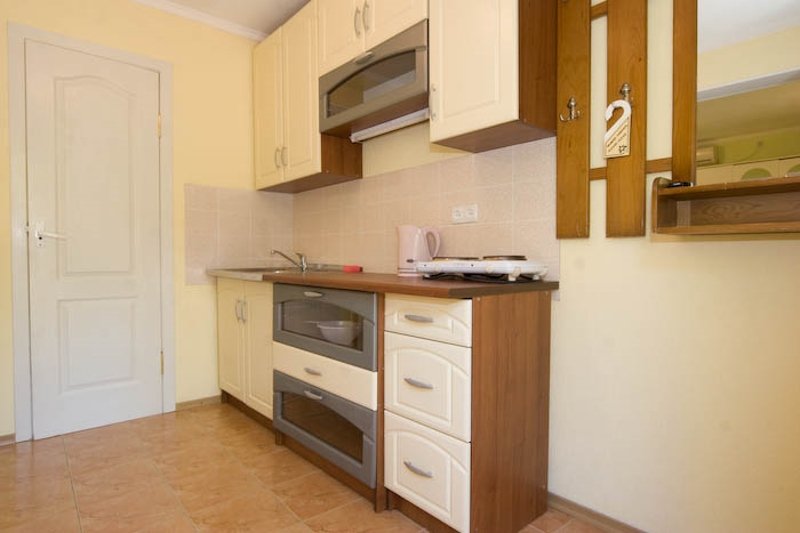 Номер обустроен компактно и уютно: двуспальная кровать с прикроватными тумбочками, раскладной диван, телевизор, сейф, кондиционер, беспроводной доступ к интернету, шкаф для вещей, письменный стол, сушка для вещей, москитная сетка. Комната совмещена с небольшой функциональной кухней, где есть микроволновая печь, электрический чайник, холодильник, индукционная плита, раковина и набор посуды. Санузел состоит из душа, умывальника и унитаза, есть фен и полотенца. В номере имеется балкон с летней мебелью. В холодное время года работает отопление и подогрев пола.Спальные места