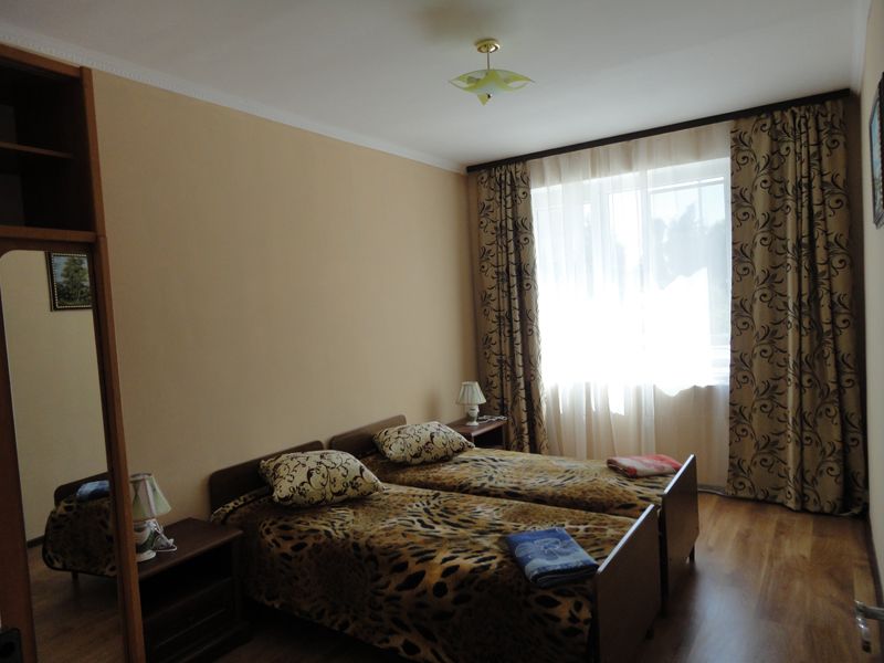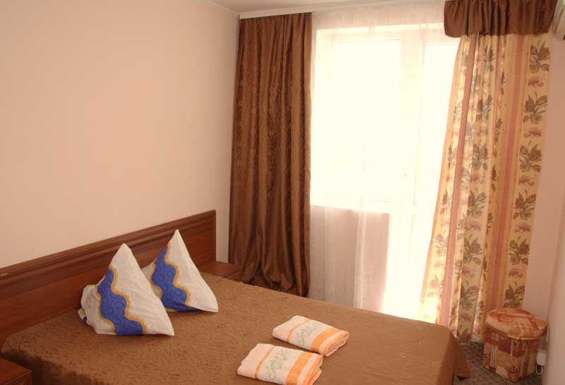 Однокомнатный номер, 2-е односпальные кровати (по желанию можно сдвинуть), холодильник, TV, балкон, душ, санузел, площадь - 15 кв.м.