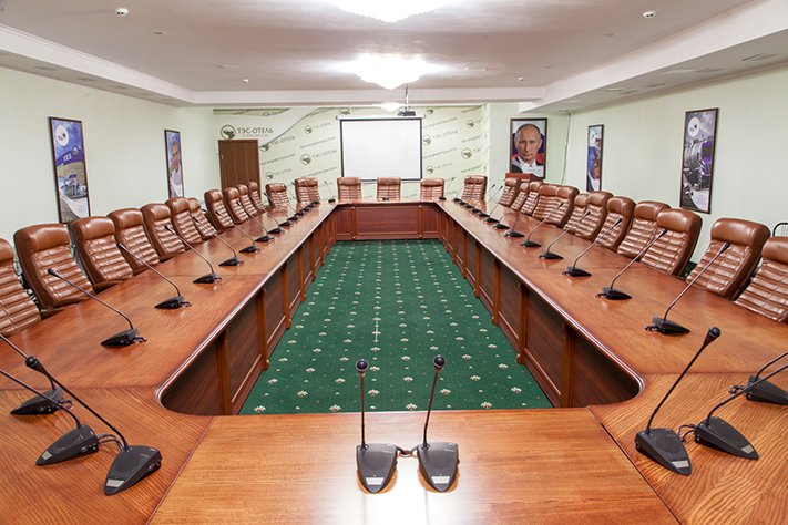 • оснащен аудио оборудованием, мониторами, экранами, проектором;