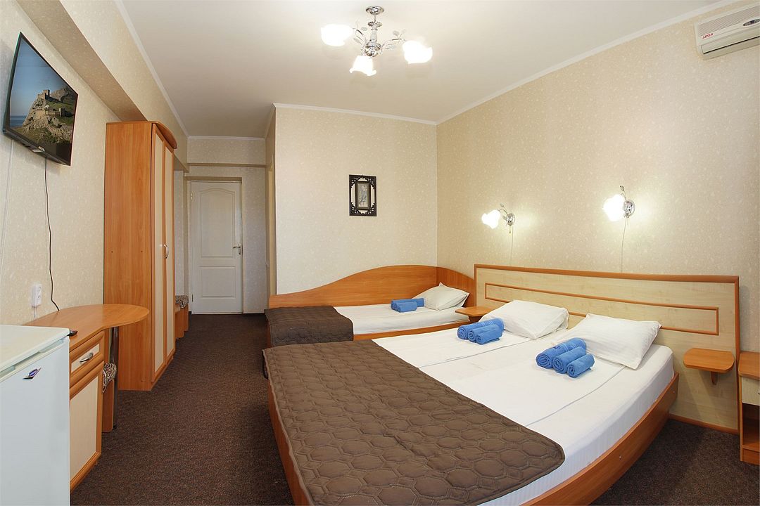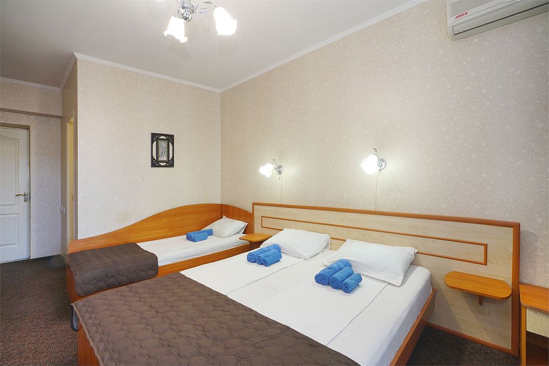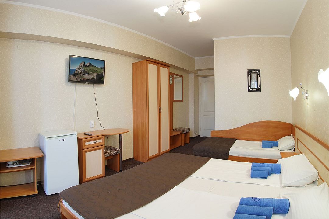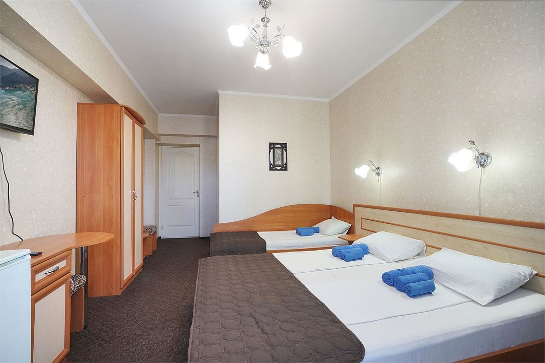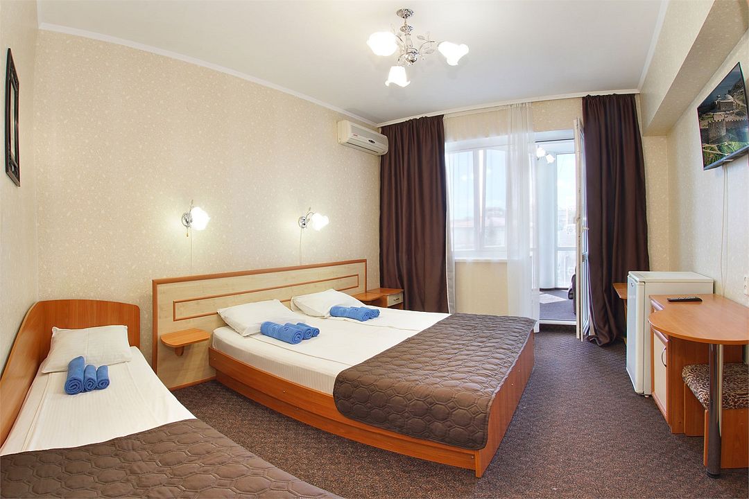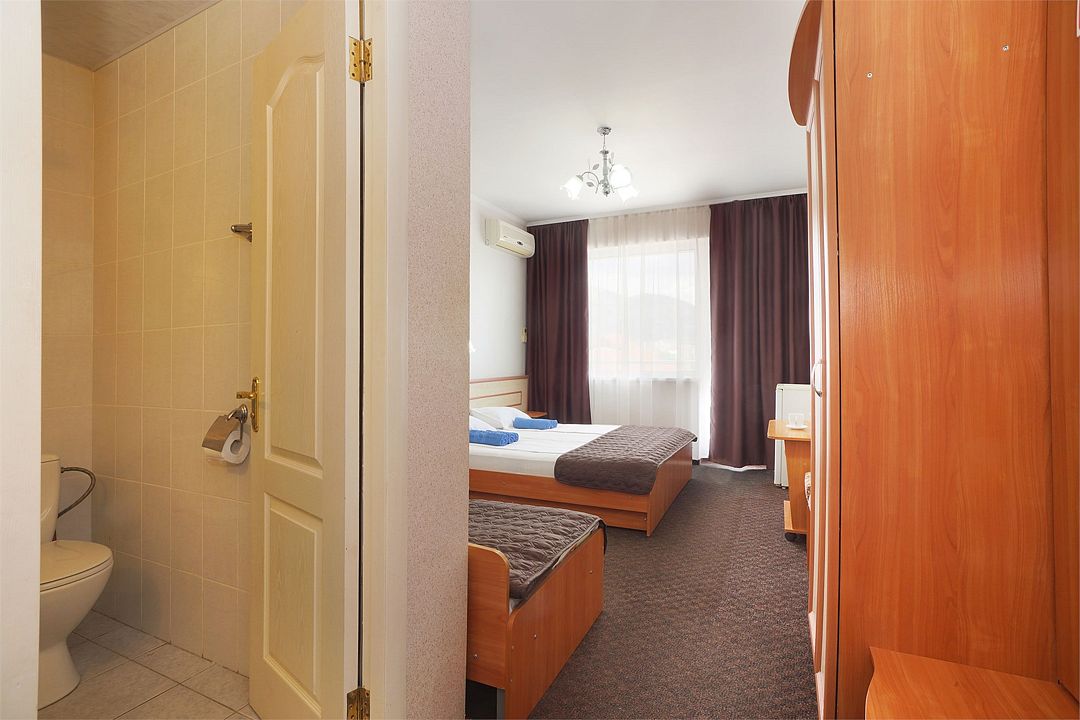 Однокомнатный номер общей площадью 18 кв.м., оформленный в традиционном стиле. В номере есть все необходимое для комфортного проживания: двуспальная кровать и односпальная (или три односпальные) с удобным матрасом, балкон, шкаф для хранения одежды, прикроватные тумбы, холодильник, ЖК-телевизор, сплит-система, собственная ванная комната с душевой кабиной и туалетными принадлежностями, набор для приготовления чая/кофе. Вид из номера на город и горы. Номера расположены на 3, 4 и 5 этажах.Услуги и удобства