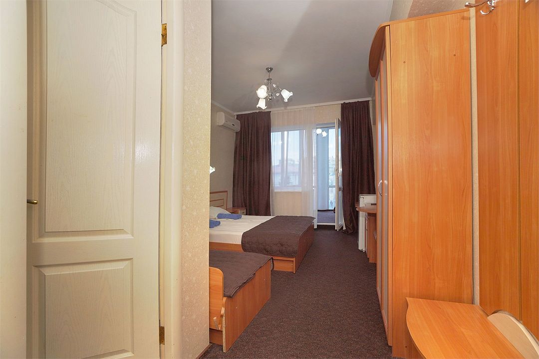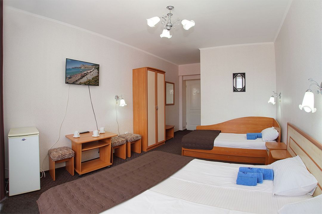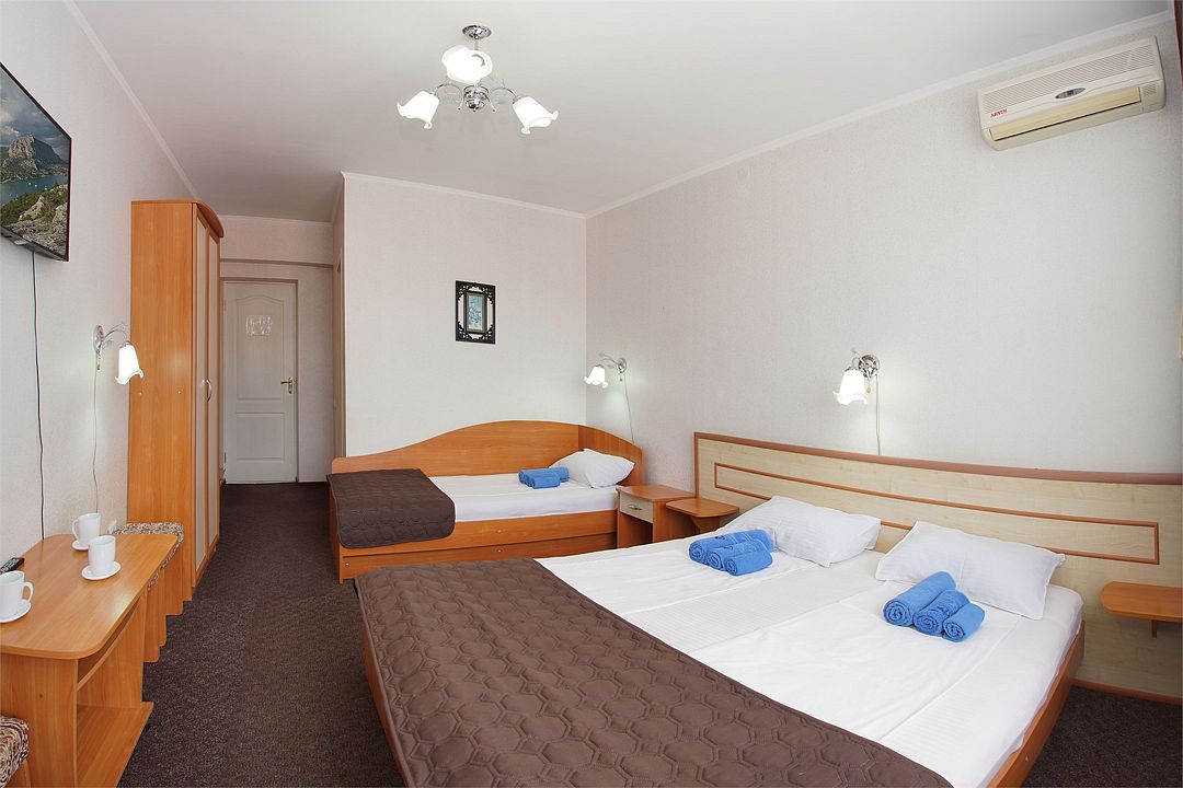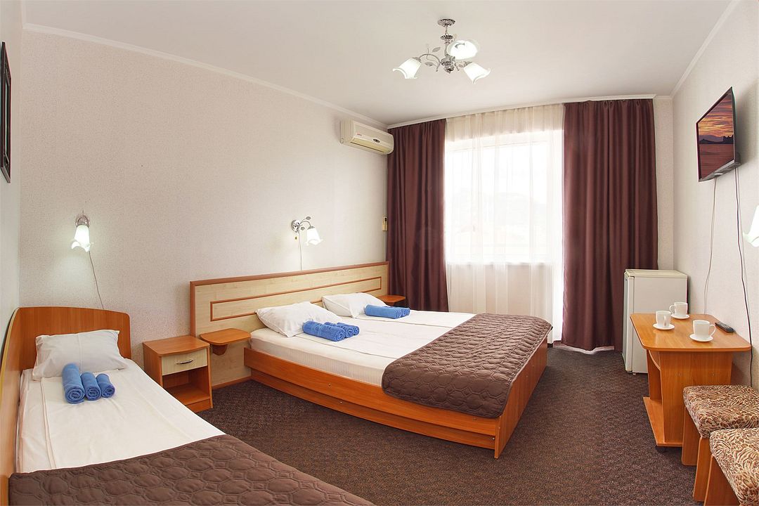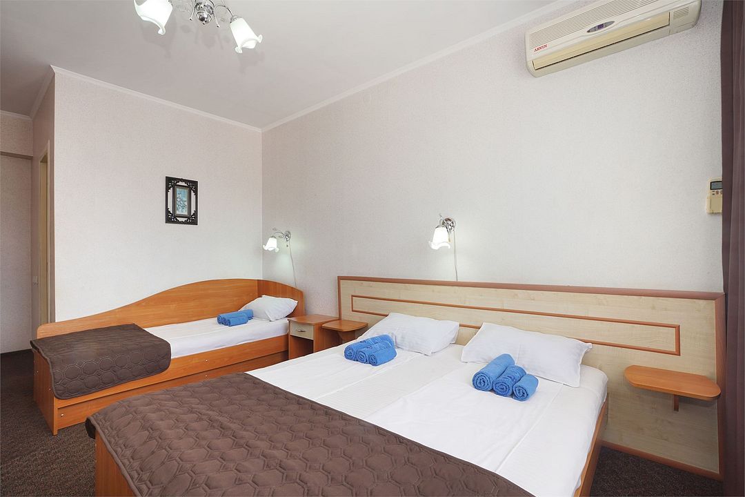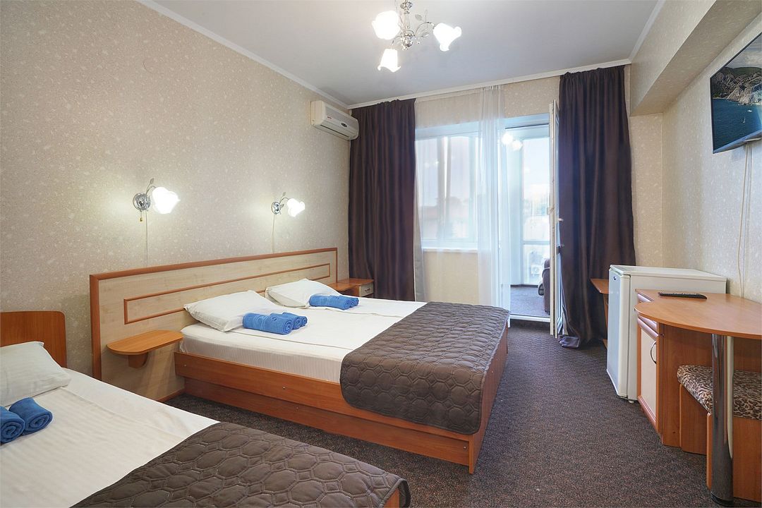 Однокомнатный номер общей площадью 18 кв.м., оформленный в традиционном стиле. В номере есть все необходимое для комфортного проживания: двуспальная кровать и односпальная (или три односпальные) с удобным матрасом, балкон, шкаф для хранения одежды, прикроватные тумбы, холодильник, ЖК-телевизор, сплит-система, собственная ванная комната с душевой кабиной и туалетными принадлежностями, набор для приготовления чая/кофе. Вид из номера на город и горы. Номера расположены на 3, 4 и 5 этажах.Услуги и удобства