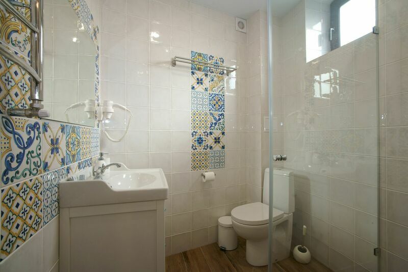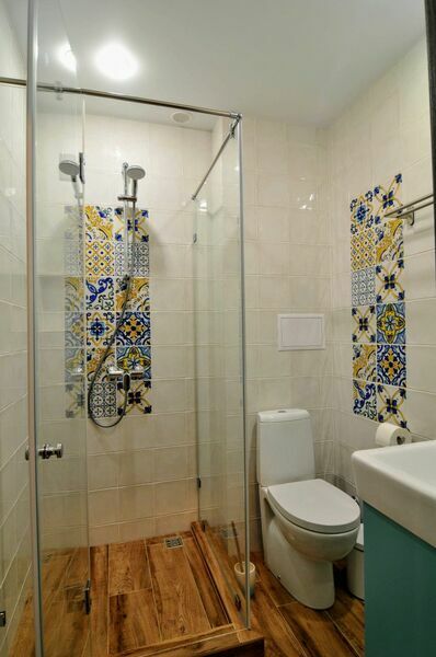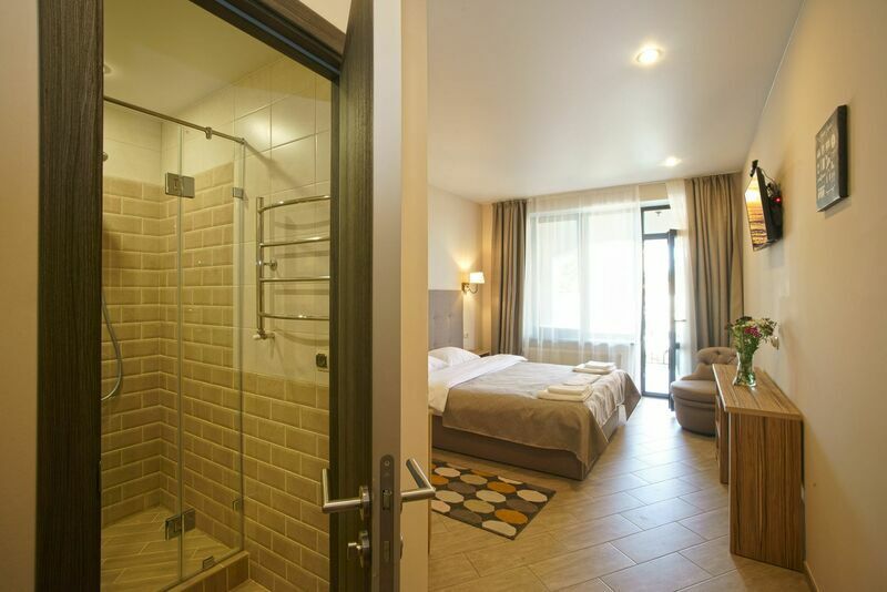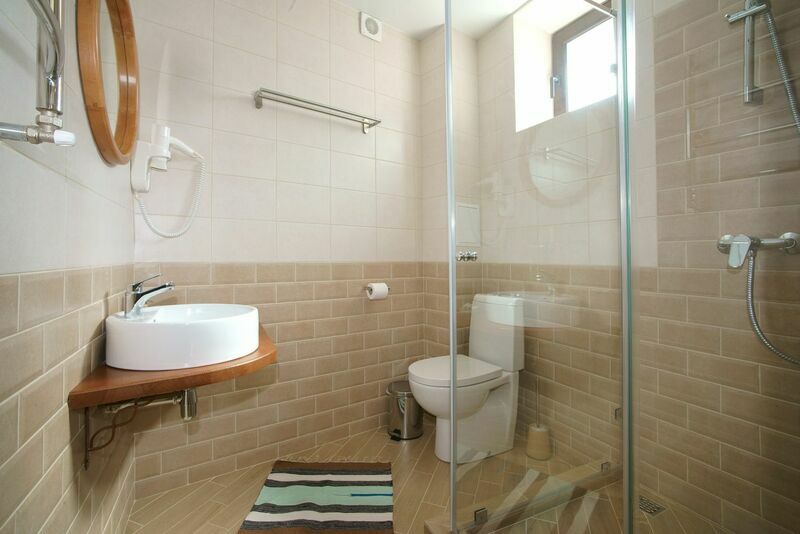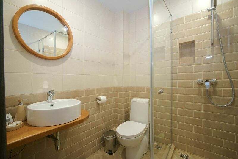 В номере чистый, современный санузел с хорошей душевой кабиной.