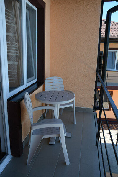шкаф, тумбочки, стулья, кровать односпальная, кровать двуспальная, стол, журнальный столик, балкон, посуда