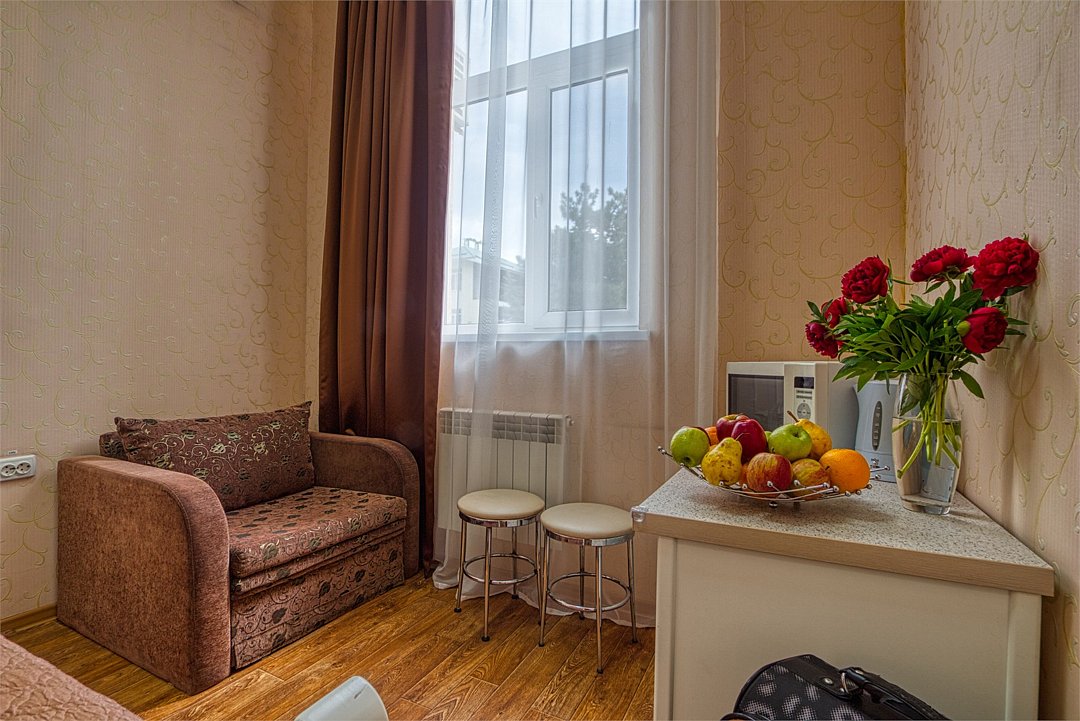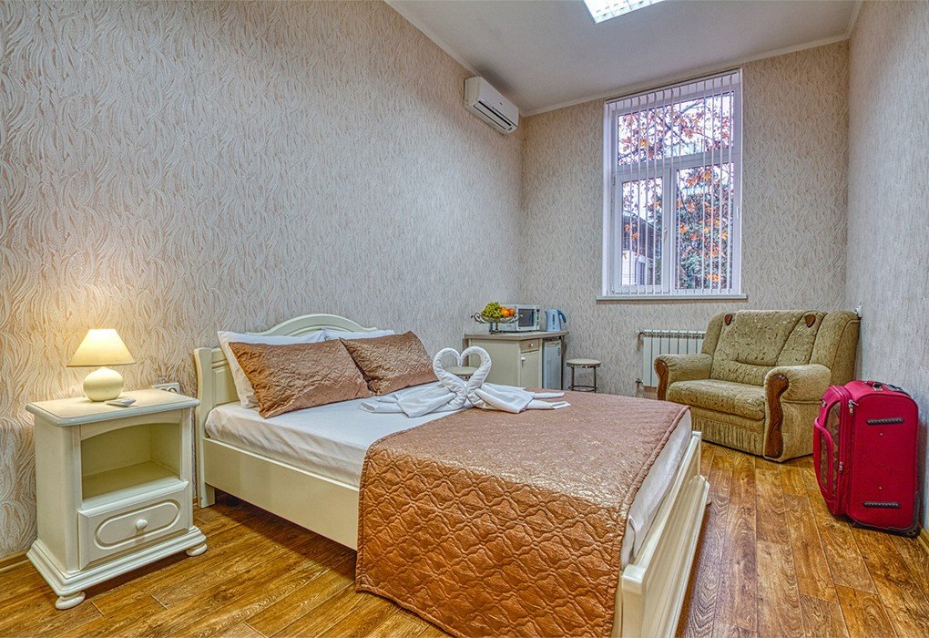 Однокомнатный номер общей площадью 21,5 м², c двуспальной кроватью и дополнительным местом в виде раскладного кресла. Завтрак входит в стоимость проживания. Номер категории «Комфорт» гарантирует качественный отдых как во время бизнес поездок, так и во время путешествия.Услуги и удобства