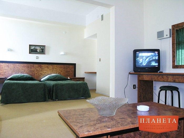 "Планета" - это девятиэтажный современный спальный корпус на 300 мест, оборудован лифтами. Все номера современные, с кондиционерами. Территория пансионата парковая, ухоженная, озеленённая, имеется искусственное озеро с лебедями, ручей.