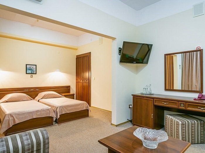 «Полулюкс» представляет собой комфортабельный номер, включающий в себя спальную и гостиную комнаты, есть балкон. Кровати в номере на Ваш выбор одна большая или две раздельные. В номере есть все необходимое для комфортного проживания двух человек.Услуги и удобства
