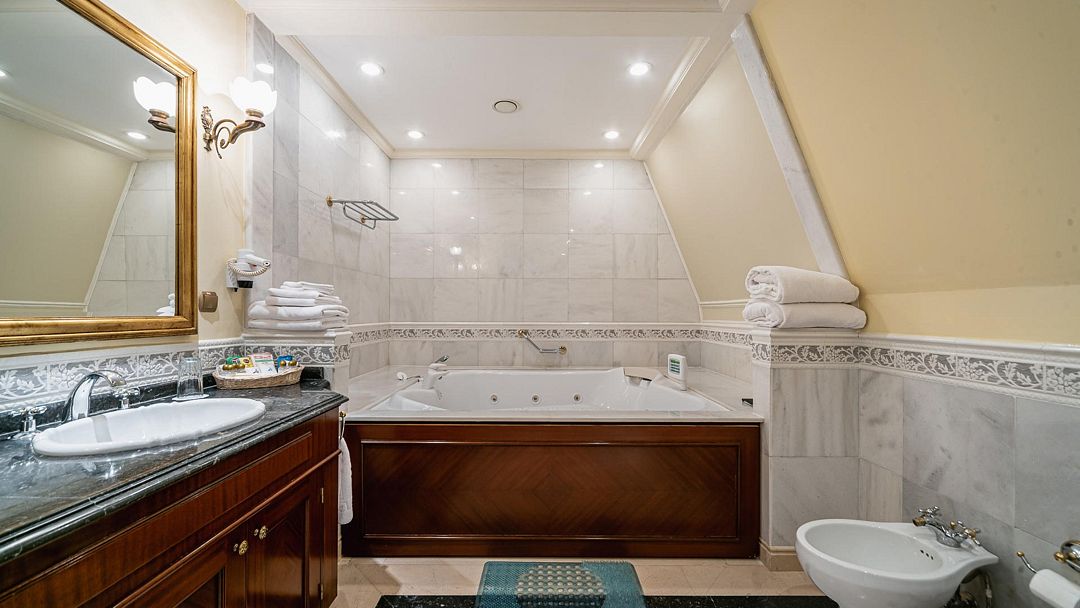 кабельное телевидение, Wi-Fi, телефон, кондиционер, светильник, халаты, банные полотенца, гигиенические средства, балкон с красивым видом, двуспальная кровать, стулья, шкаф для одежды, обеденный стол, зеркало, раковина, мягкая мебель, вид на море, кулер на этаже, кресло, туалетный столик, туалет, телевизор с плоским экраном, мини-холодильник, пуфик, джакузи, без питомцевВ гостиничном номере