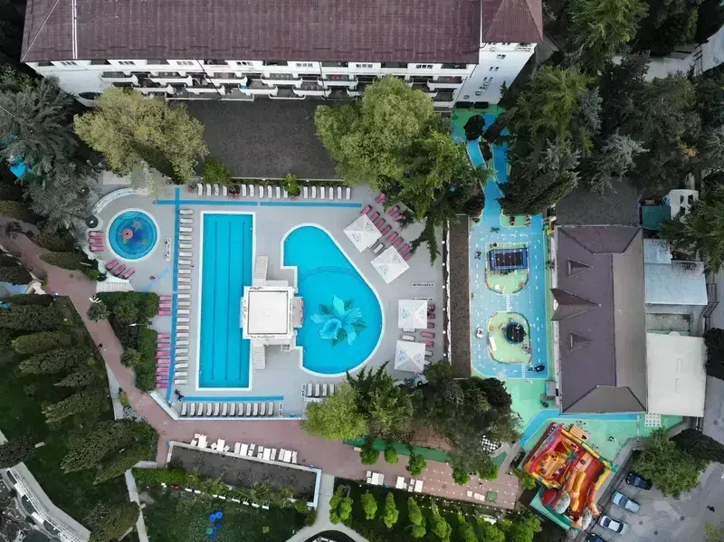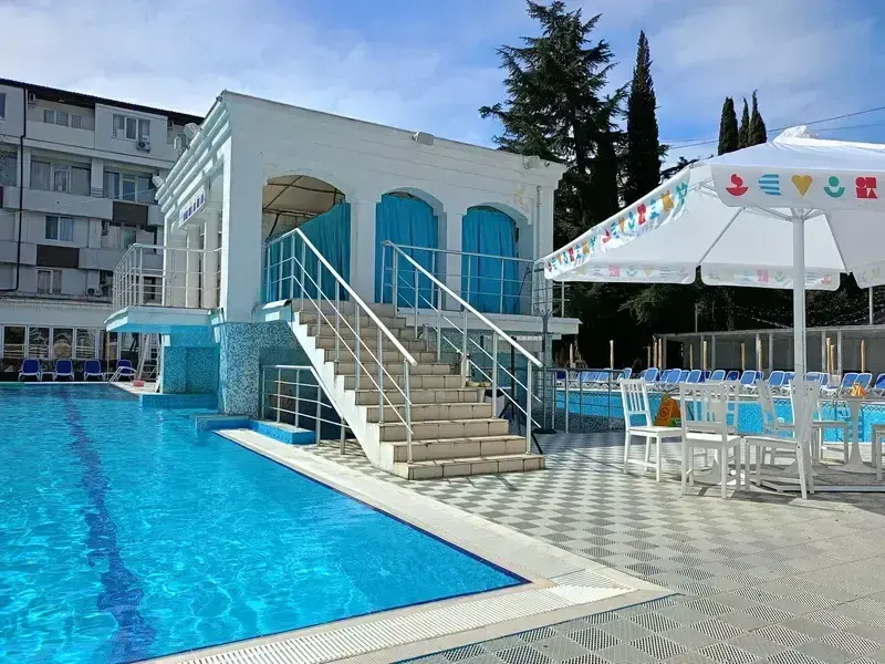 Территория комплекса большая, обустроена с использованием ландшафтного дизайна и утопает в зелени реликтовых хвойных деревьев и экзотических цветов. Здесь вам предложат комфортное размещение в двух гостиничных корпусах с номерами различного интерьера, но неизменно высокого комфорта: стандарт, стандарт плюс, полулюкс, люкс, апартаменты люкс и студио.