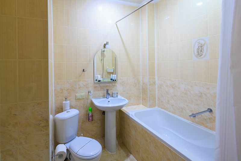Номер — 45 кв.м с удобствами (совмещенный санузел с ванной, тапочки, туалетные принадлежности, фен, 2 халата).
