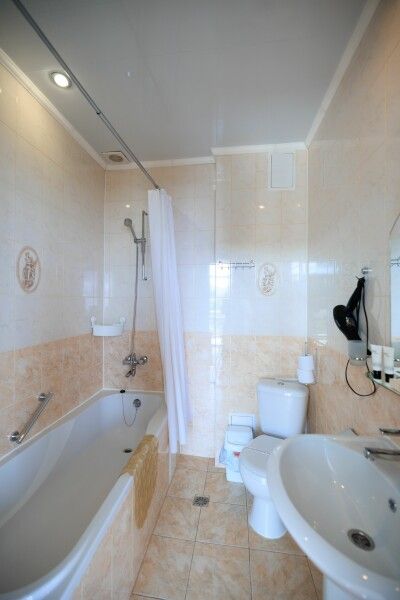 Номер — 31 кв.м с удобствами (совмещенный санузел с ванной, тапочки, туалетные принадлежности, фен, 2 халата).