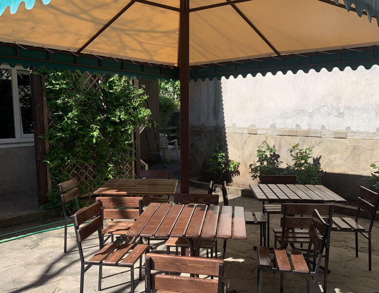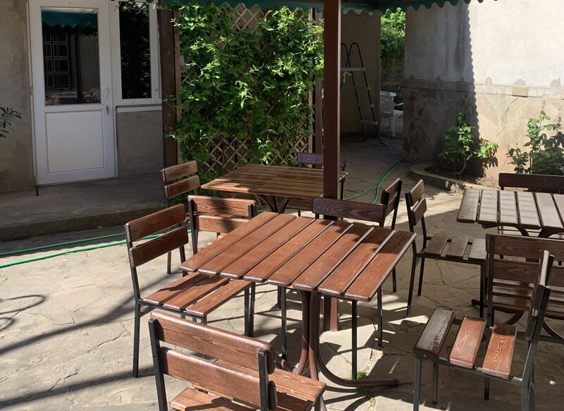 Возле каждого номера небольшая беседка с мебелью - стол , стулья