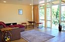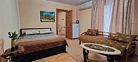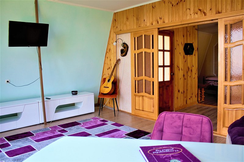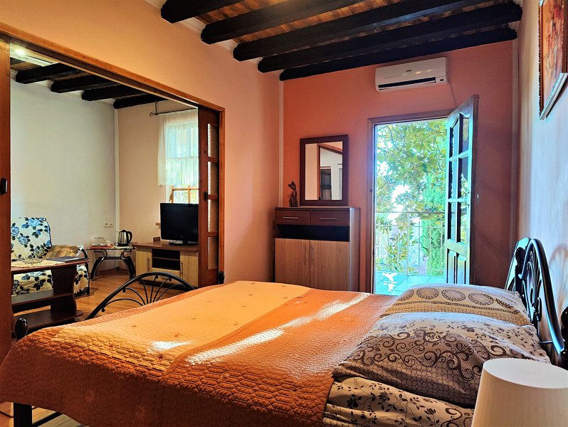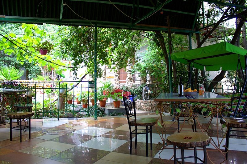 Мы как то привыкли отдыхать в хороших гостиницах, но за такие небольшие денежки у нас в номере было все: кондиционер, телевизор, холодильник, чайник, посуда, как в 5 звездах. И сервис на высоте! Все что не попросишь у персонала все делали и все давали: Посуду, полотенца, утюг, сушилку. Персонал отзывчивый, внимательный, душевный, как к родственникам приехал! Вечером очень приятно было посидеть на веранде в тишине и зарослях винограда с бокалом вина. К нам иногда приходил кот, которого погладишь и он мурлыкает, как заводной. На территории есть крытый бассейн с прозрачной водой, для меня маловат размерчик, а вот детям пожалуй будет рай! Мы не стали брать авто в прокат, когда поняли, что общественный транспорт в Крыму работает не хуже чем в Германии, но на территории есть закрытая парковка. Думаю машины на 4 точно. Предупреждаю, что такси в Крыму не работает поверьте нашему печальному опыту. А какой чудесный сад с многообразием растительности на территории. А цветы! Прям как цветники вокруг Ливадийского дворца. Представляю сколько труда и любви надо вложить в это! Кругом чистота и порядок. Мы возвращались с пляжа и на лестнице я заметил ветром накидало листву, переоделись и пошли за фруктами. 5 минут. Лестница была уже чистая. Я просто подумал! Жене очень нравилось по вечерам сидя на качелях в тишине читать книги. Вспомнил про невыносимые децибелы цикад вечером в Сочи. Сытные завтраки утром с выпечкой чаем и кофе по-турецки это отдельная изюминка Радмира. Я теперь жену упрекаю почему меня так не кормят дома!