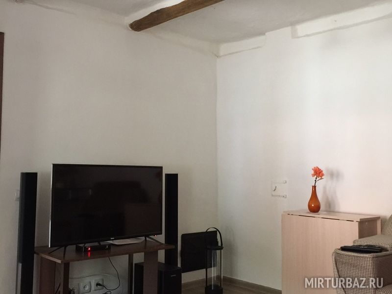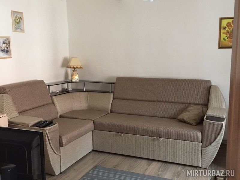 Гостиная: большой угловой диван-кровать, домашний кинотеатр, спутниковое телевидение, шкаф, раскладной стол.