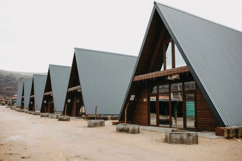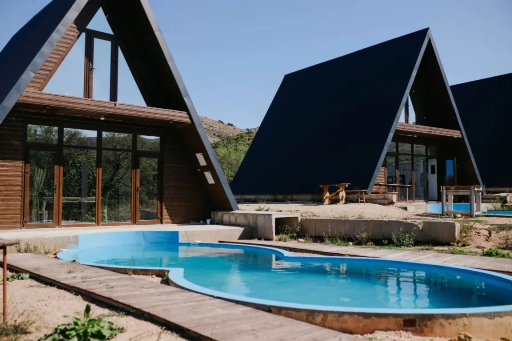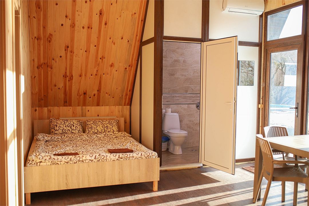 Коттедж в современном стиле "А-фрейм" рассчитан на проживание до 8 взрослых. Имеет две комнаты (разделен межкомнатными дверями), и два отдельных санузла с душем (для каждой комнаты свой санузел). Оснащен кухонным уголком с необходимой бытовой техникой (холодильник, микроволновая печь, электрический чайник). Есть телевизор со Smart TV, кондиционер и отопление. Панорамные окна с видом на горы и Долгоруковскую яйлу.Услуги и удобства