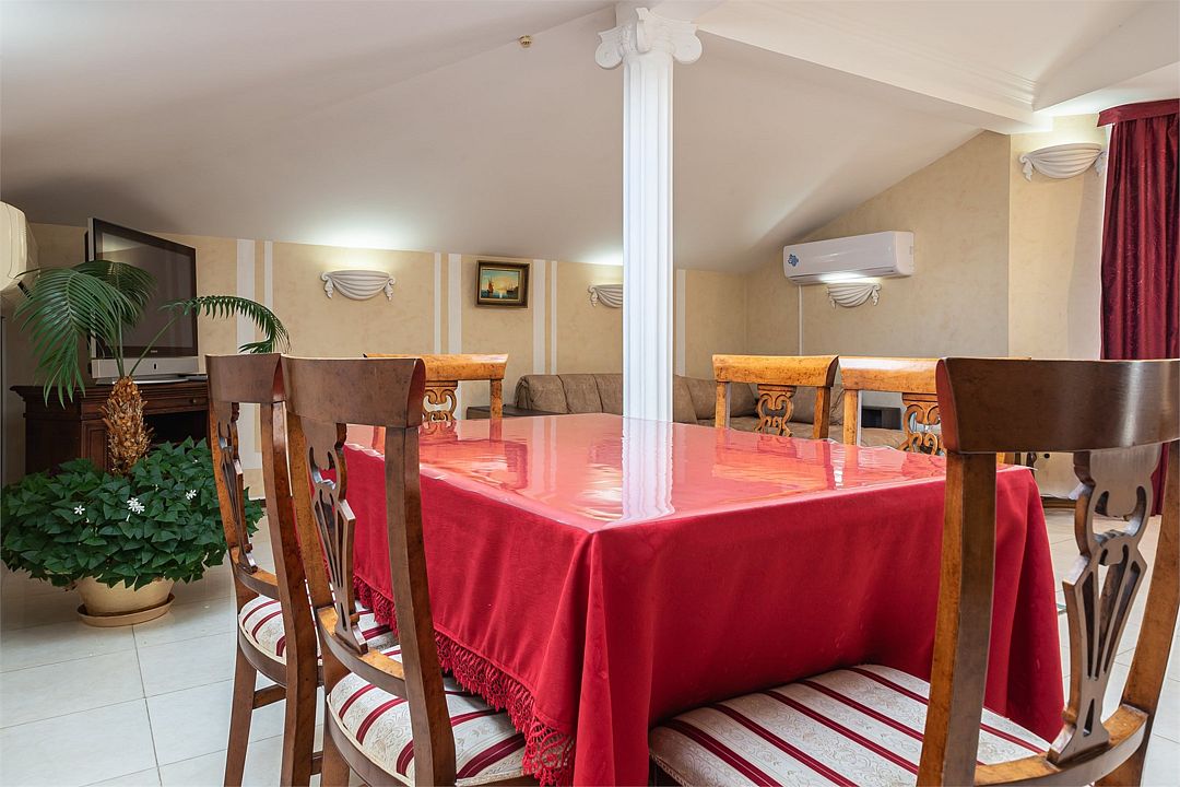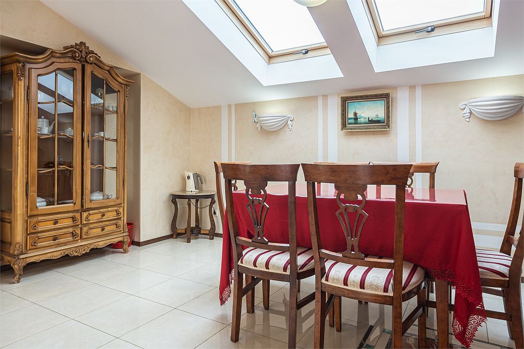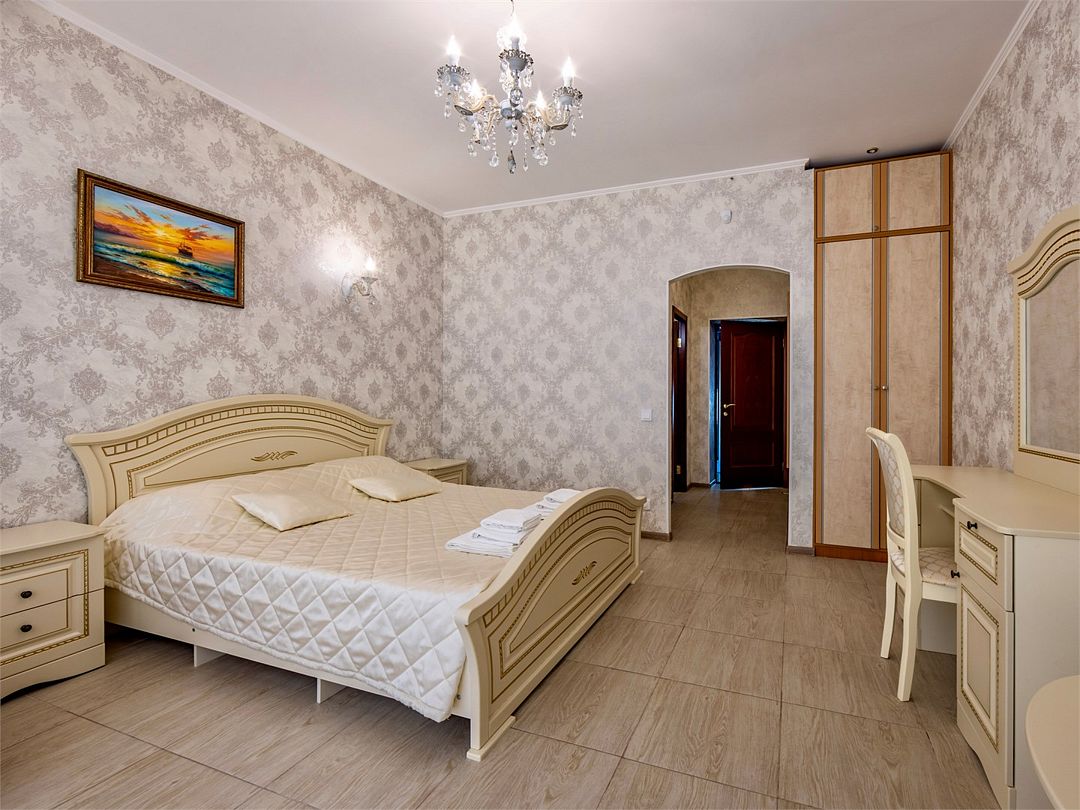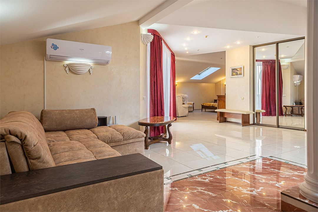 Великолепно оборудованные и отделанные апартаменты, на 5 этаже площадью 80 м.кв. В пентхаусе двуспальная кровать 180х200, большой угловой диван 200х200,раскладной диван 145х200, телевизор,холодильник,сейф,чайник, обеденный стол,микроволновка,гардеробная,горка с посудой для еды,Wi-Fi . Уборная с ванной и окном на потолке для отдыха в ванной и лицезрения звезд. Огромная терасса 32м2 с шикарным видом на море и уголком для отдыха.Номер рассчитан на проживание до 6 человек.Услуги и удобства