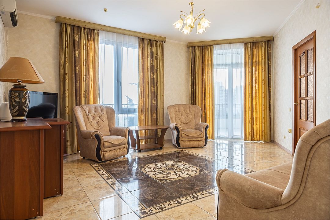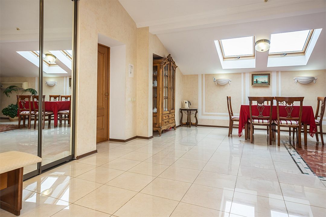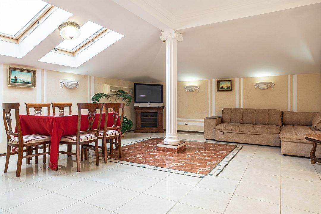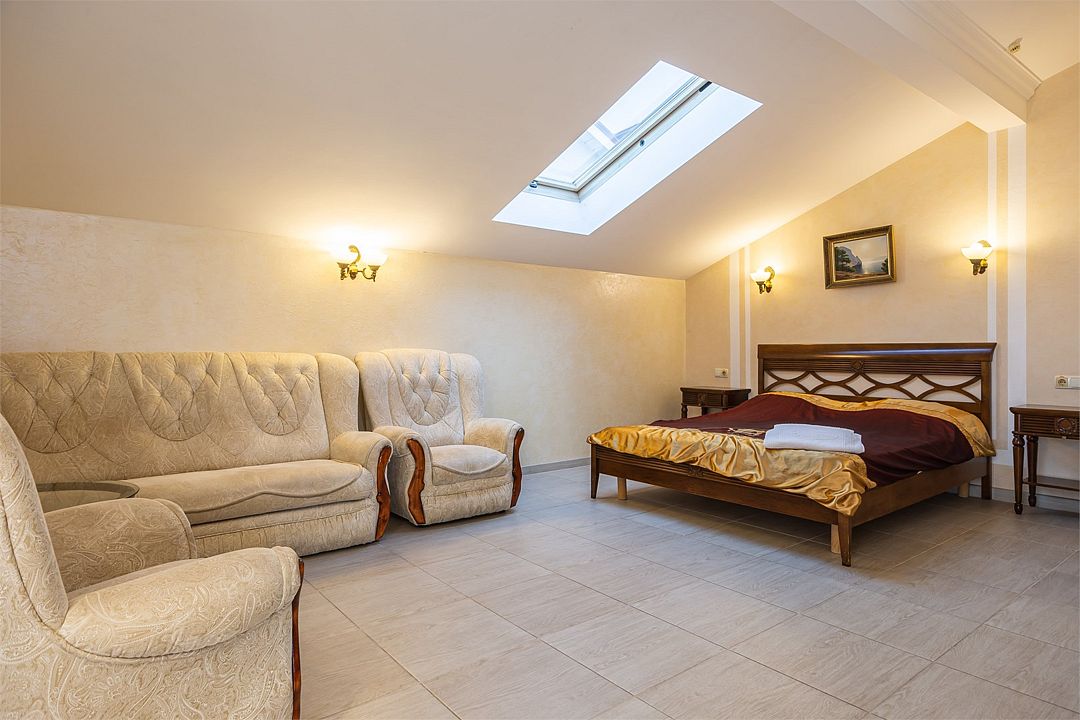Великолепно оборудованные и отделанные апартаменты, на 5 этаже площадью 80 м.кв. В пентхаусе двуспальная кровать 180х200, большой угловой диван 200х200,раскладной диван 145х200, телевизор,холодильник,сейф,чайник, обеденный стол,микроволновка,гардеробная,горка с посудой для еды,Wi-Fi . Уборная с ванной и окном на потолке для отдыха в ванной и лицезрения звезд. Огромная терасса 32м2 с шикарным видом на море и уголком для отдыха.Номер рассчитан на проживание до 6 человек.Услуги и удобства