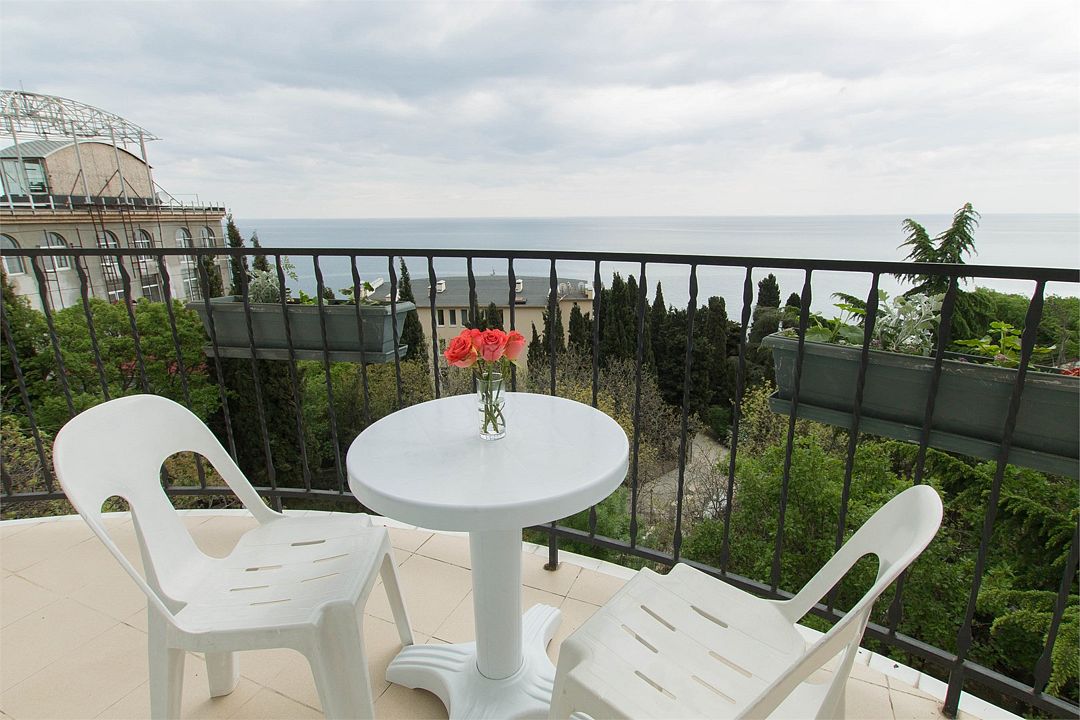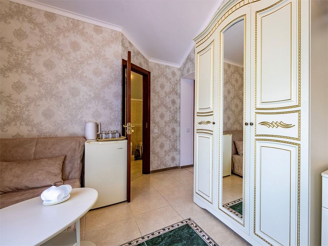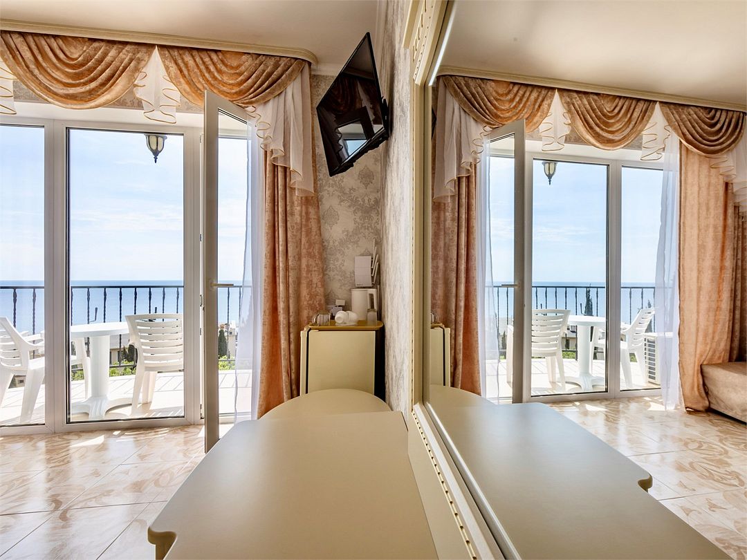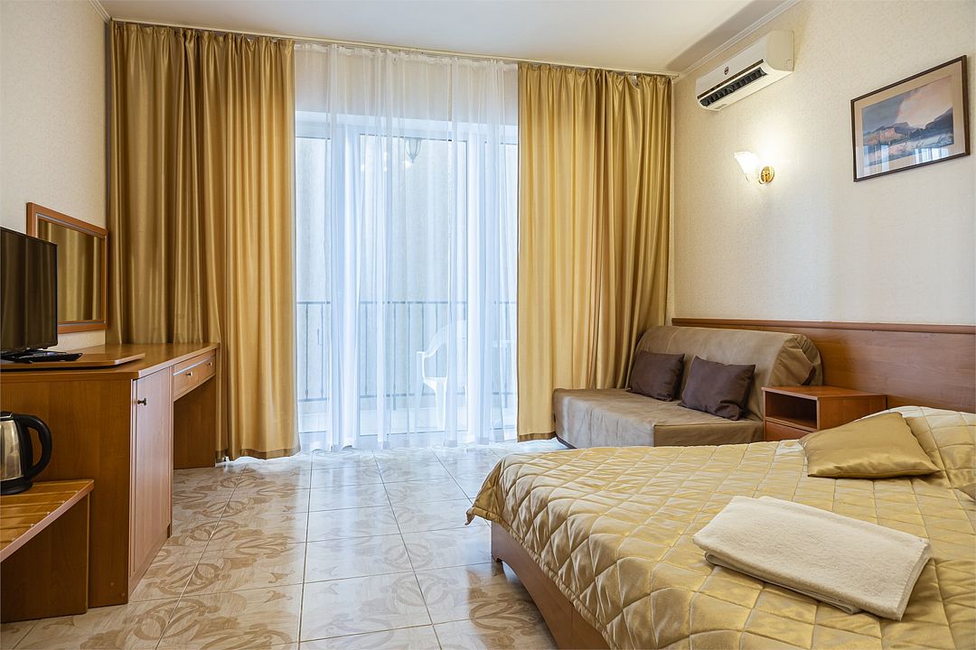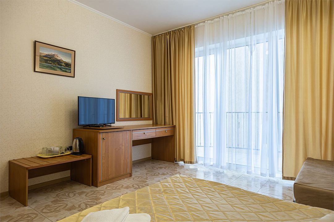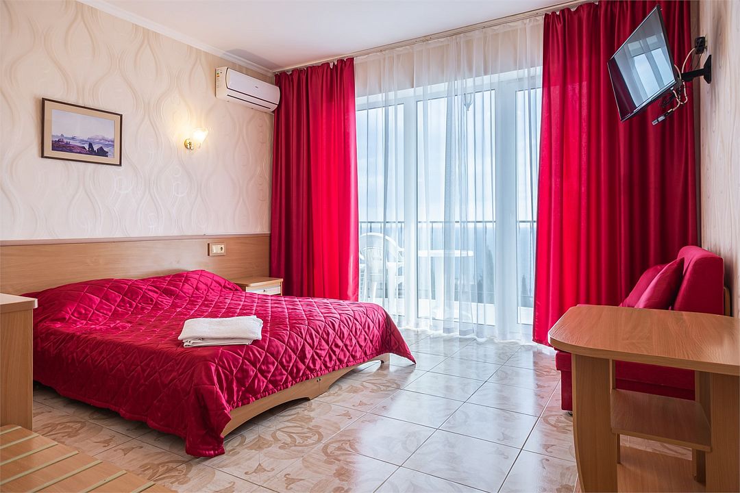 Номер на 5 этаже площадью 22 м.кв. с открытой террасой 9 м.кв БАЛКОНс боковым видом на море и прямым видом на горы. В номере 1на двухспальная кровать 160х200, раскладной диван кровать 80х200, ,телевизор,чайник,холодильник,шкаф для одежды,сейф,Wi-Fi . Ванная комната с душем,фен,туалетные принадлежности, горячая и холодная вода круглосуточно. Номер рассчитан на проживание до 3 человек.Услуги и удобства