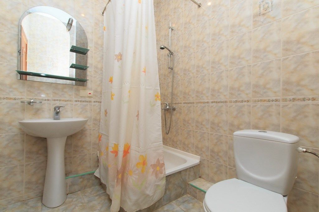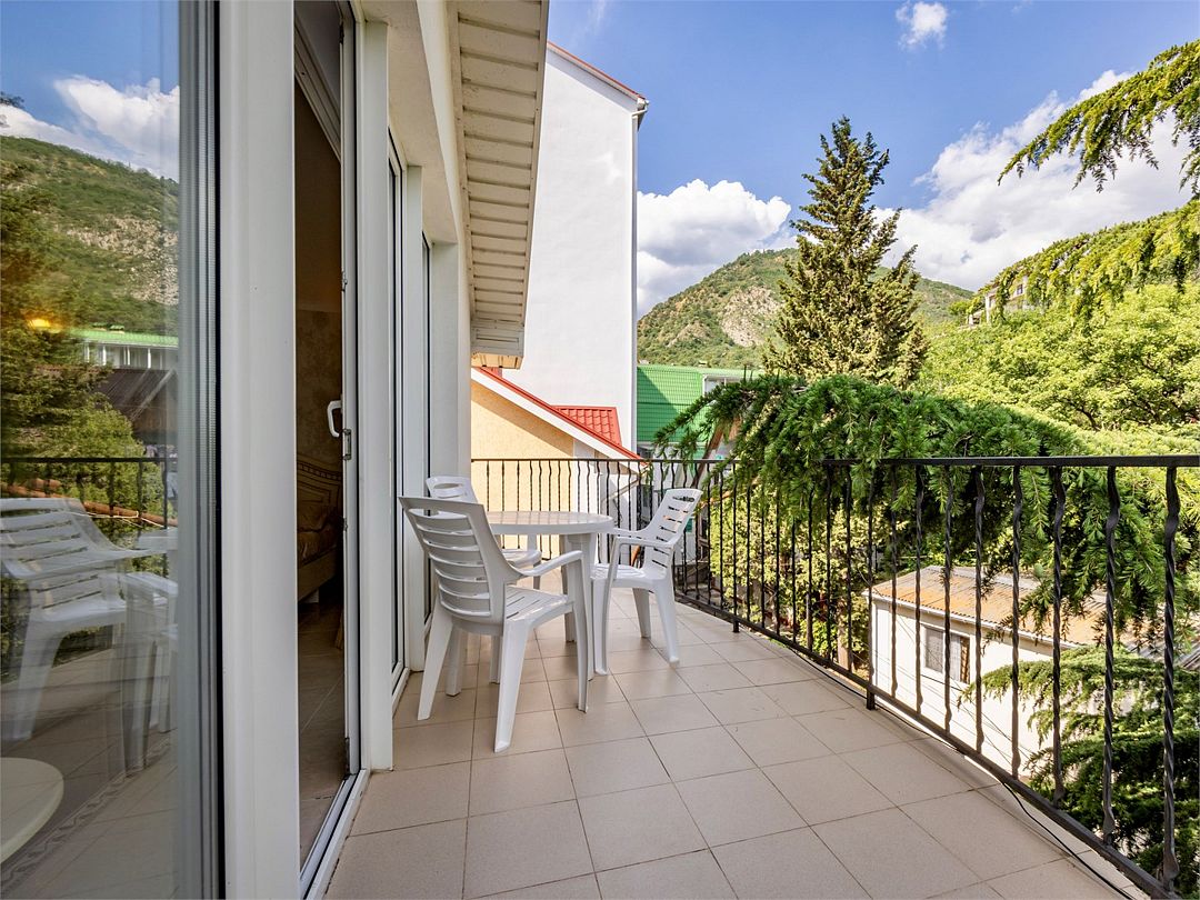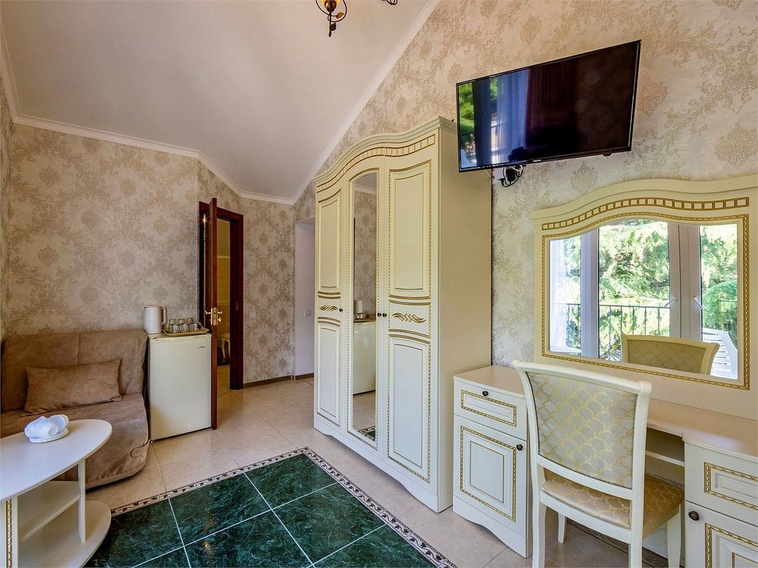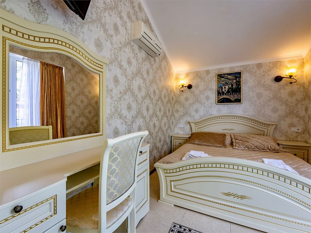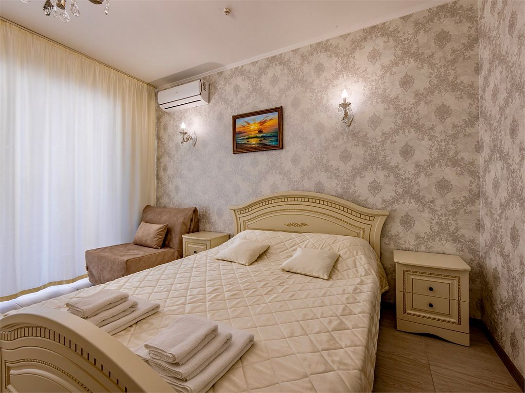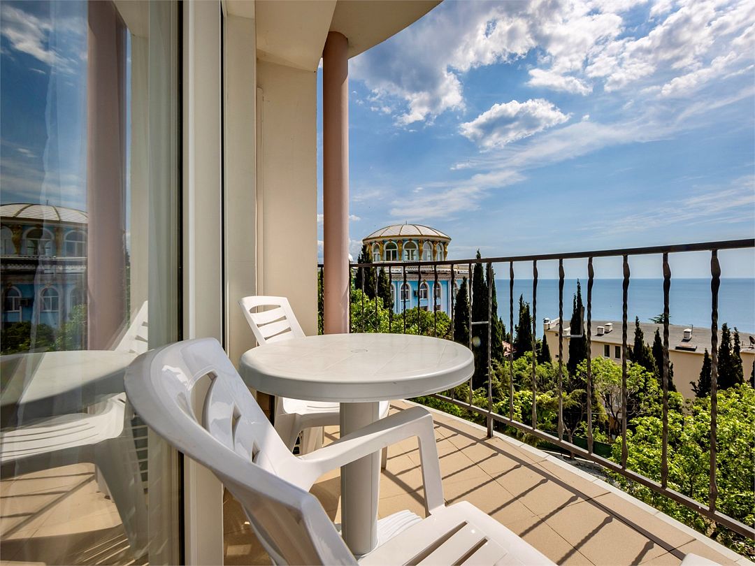 Номер на 5 этаже площадью 22 м.кв. с открытой террасой 9 м.кв БАЛКОНс боковым видом на море и прямым видом на горы. В номере 1на двухспальная кровать 160х200, раскладной диван кровать 80х200, ,телевизор,чайник,холодильник,шкаф для одежды,сейф,Wi-Fi . Ванная комната с душем,фен,туалетные принадлежности, горячая и холодная вода круглосуточно. Номер рассчитан на проживание до 3 человек.Услуги и удобства