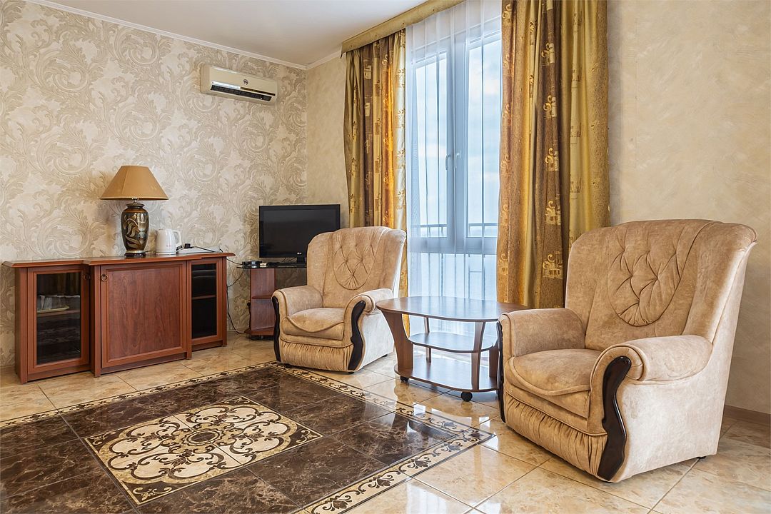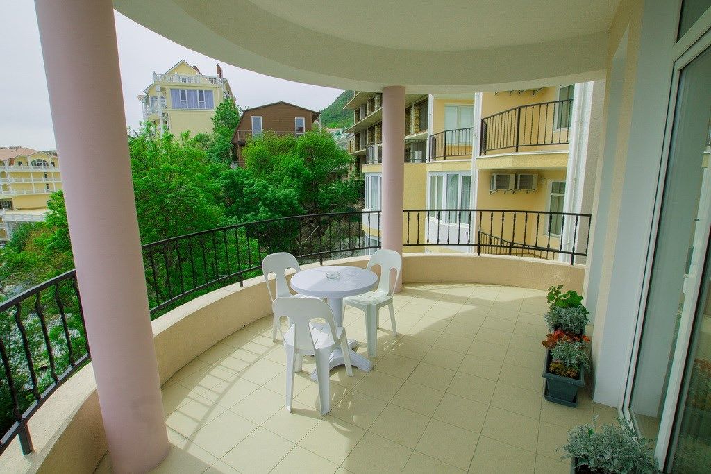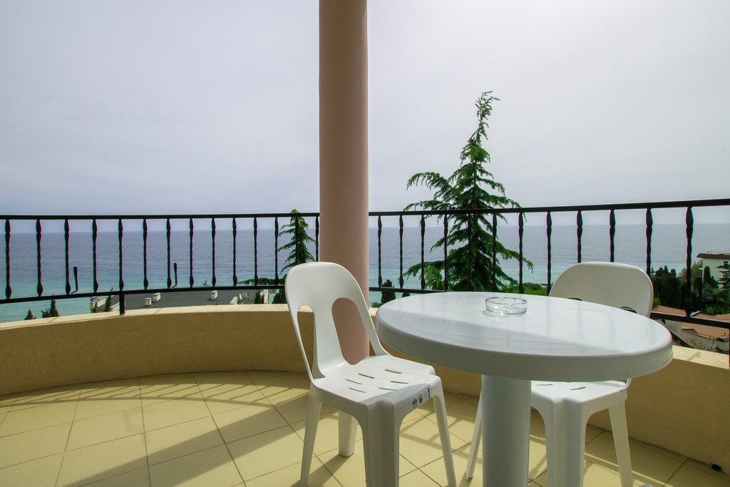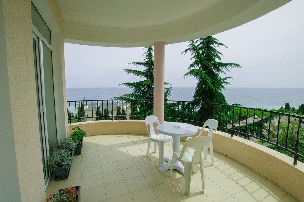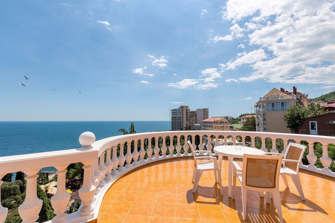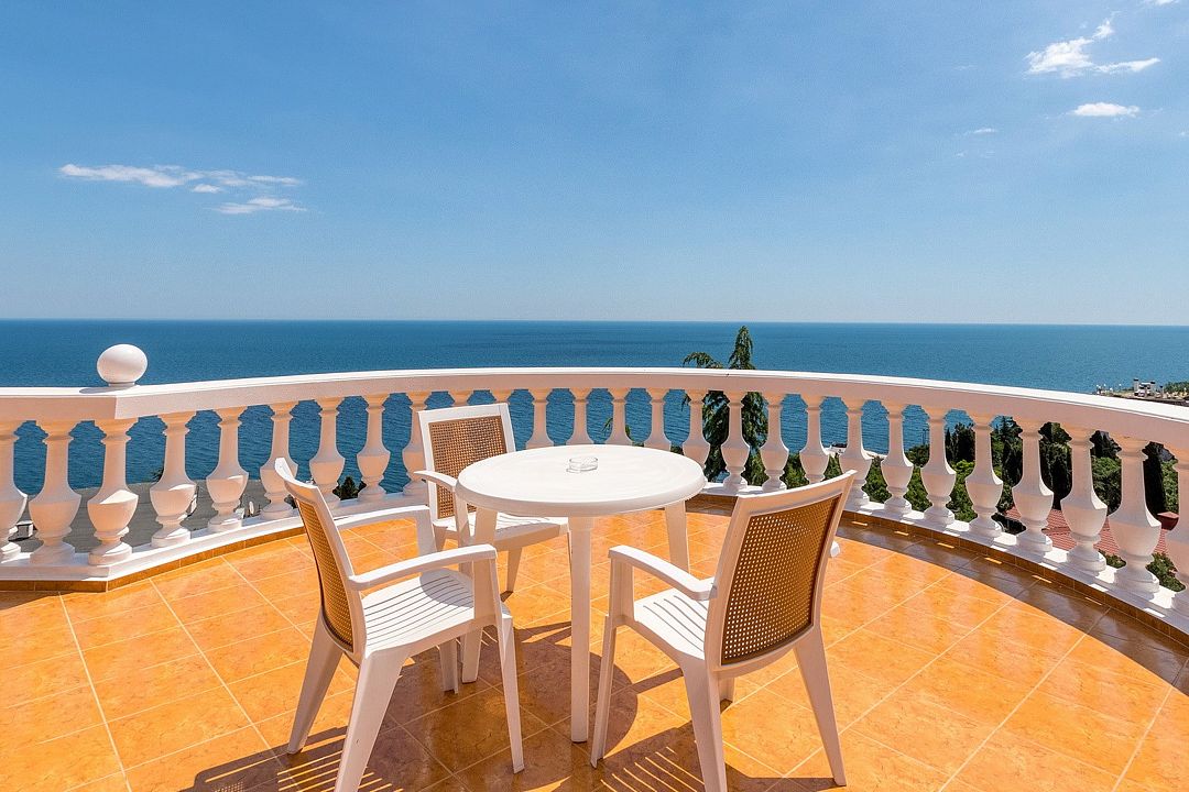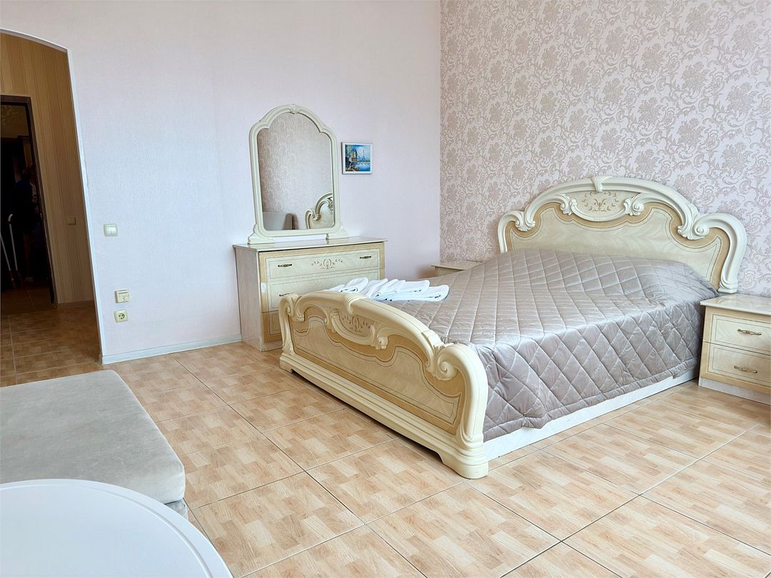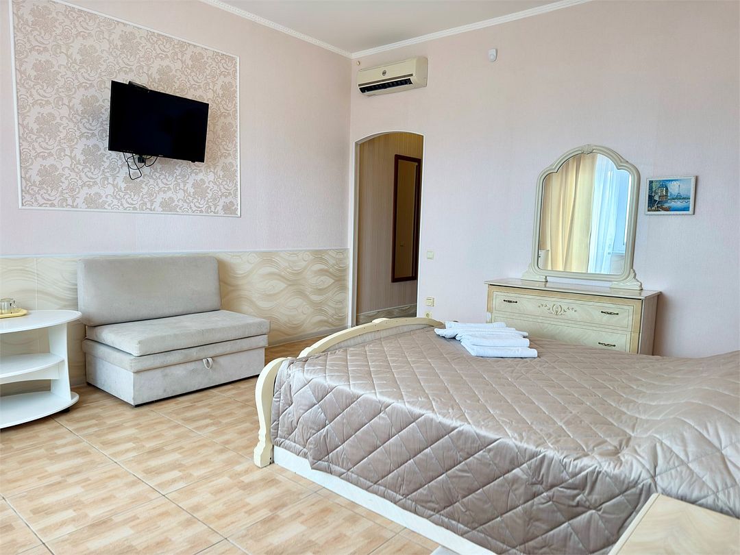 Двух комнатный номер на 2\3\4 этаже , 50 м.кв., с БАЛКОНОМ 16 м.кв. с прямым видом на море. В гостиной кондиционер,раскладной диван 145х200, два кресла,телевизор,холодильник,чайник,сейф,Wi-Fi . В спальне кондиционер, двухспальная кровать 160х200,шкаф для одежды,зеркало и пуфик для макияжа. Ванная комната с душевой кабинкой. Большой балкон со столиком,стульями,шезлонгами и ПРЯМЫМ видом на море.Номер рассчитан на проживание до 5 человек,5е доп место раскладное.Услуги и удобства