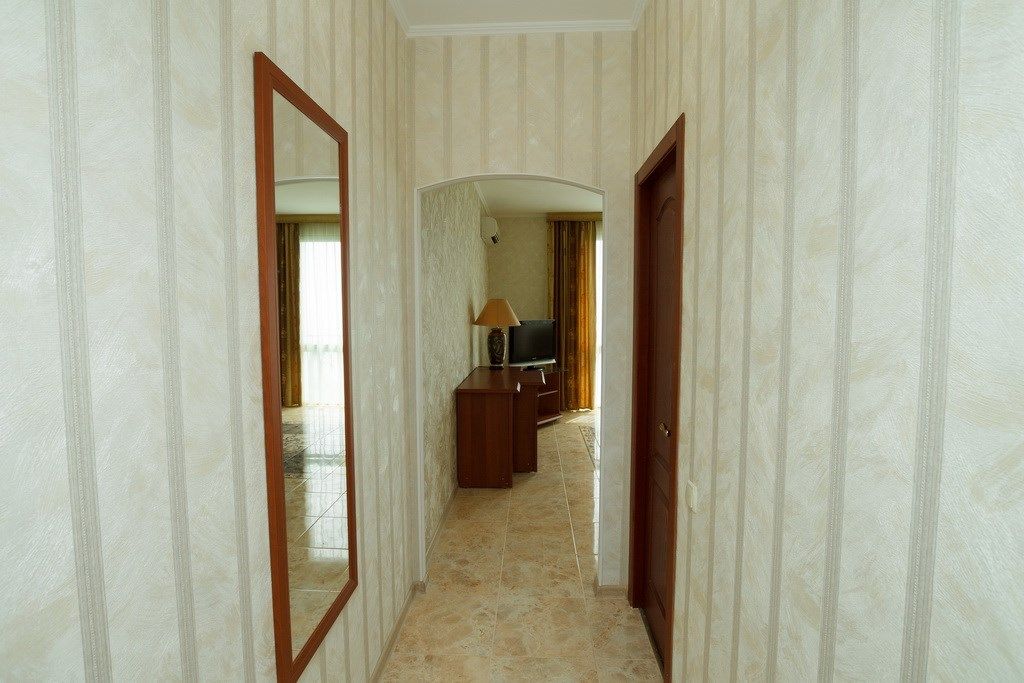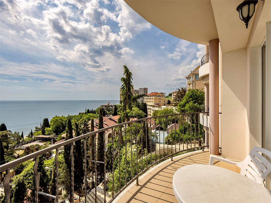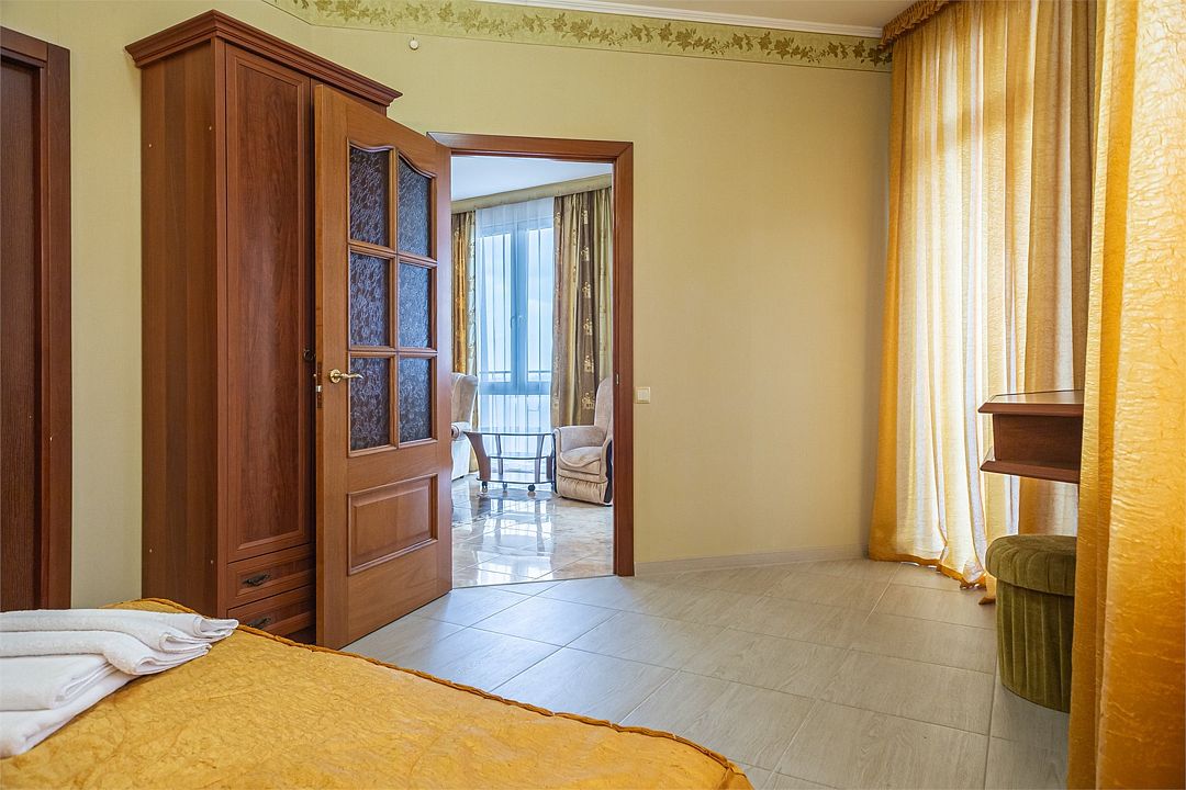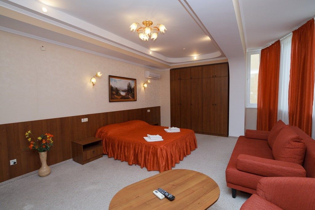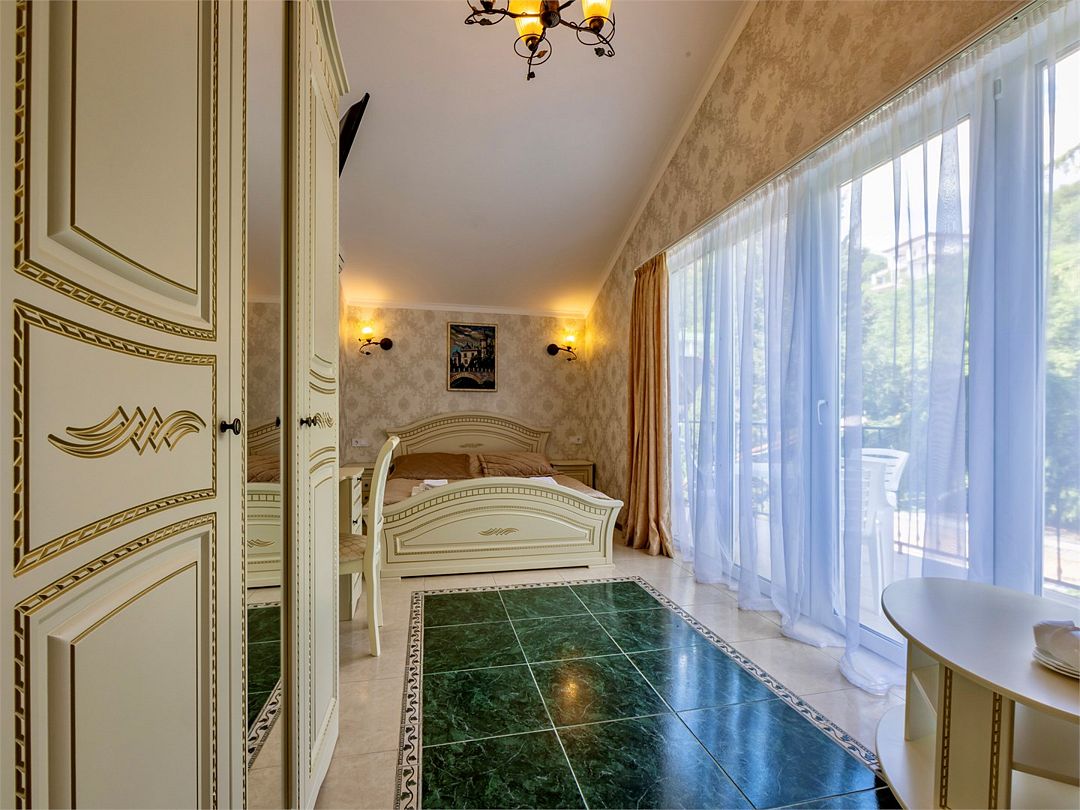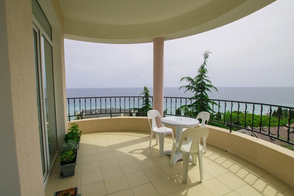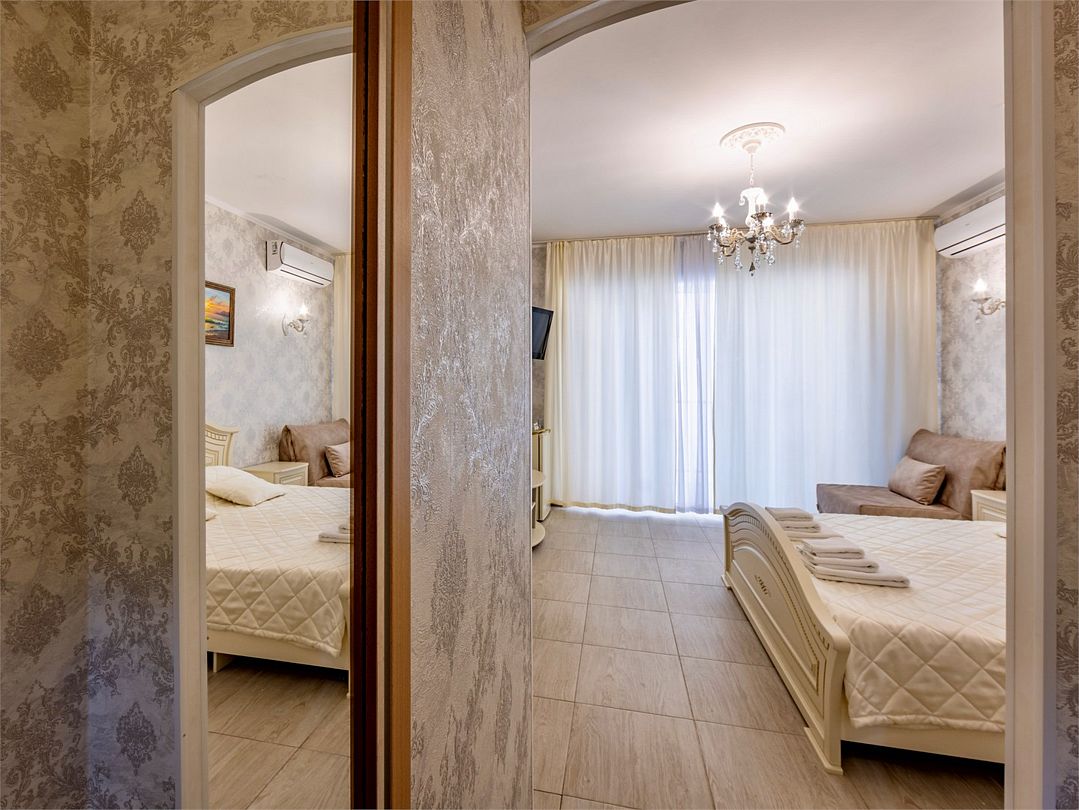Двух комнатный номер на 2\3\4 этаже , 50 м.кв., с БАЛКОНОМ 16 м.кв. с прямым видом на море. В гостиной кондиционер,раскладной диван 145х200, два кресла,телевизор,холодильник,чайник,сейф,Wi-Fi . В спальне кондиционер, двухспальная кровать 160х200,шкаф для одежды,зеркало и пуфик для макияжа. Ванная комната с душевой кабинкой. Большой балкон со столиком,стульями,шезлонгами и ПРЯМЫМ видом на море.Номер рассчитан на проживание до 5 человек,5е доп место раскладное.Услуги и удобства