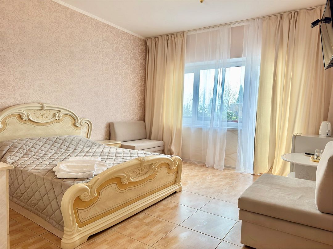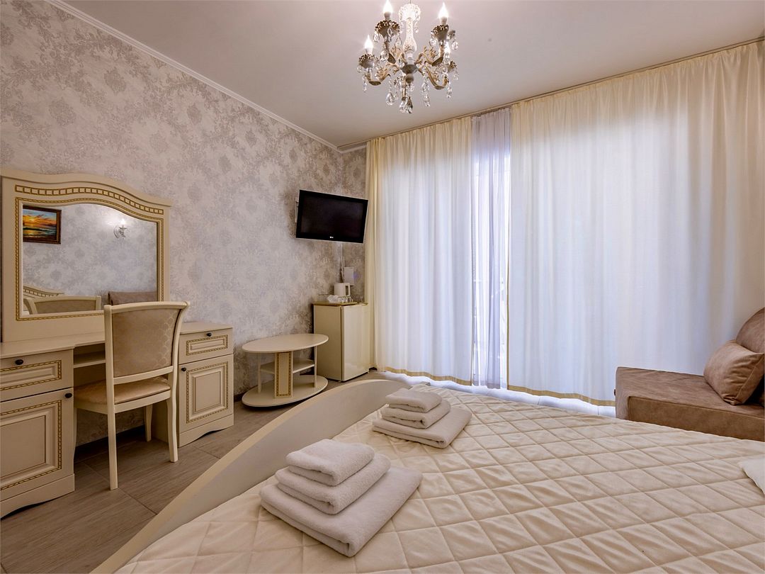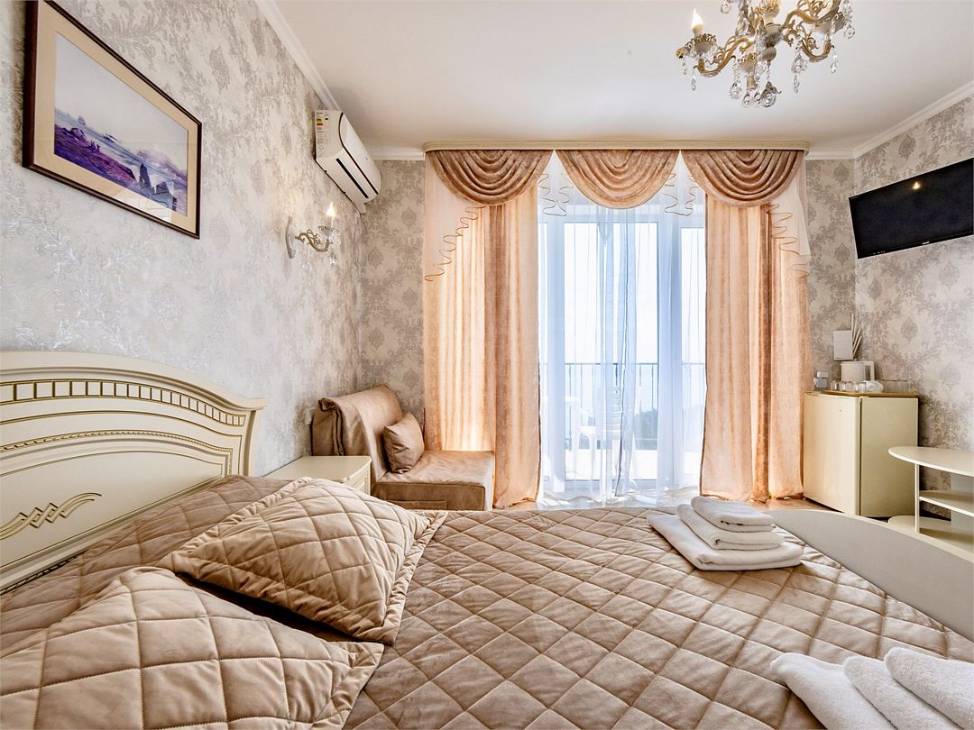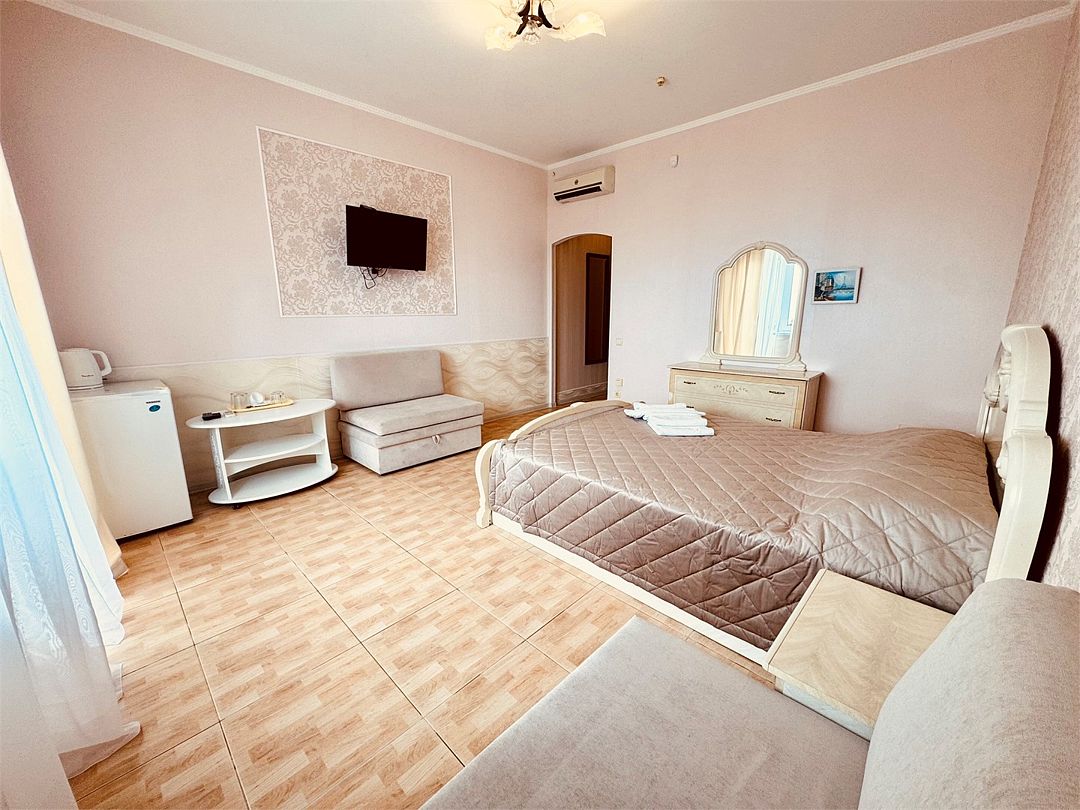Номер на 2\3\4 этаже с видом на море, 26 м.кв. с открытой террасой 9 м.кв. БАЛКОН с прямым видом на море В комнате двухспальная кровать 160х200, раскладной диван кровать 80х200, 4е доп место евро раскладушка, спутниковое телевидение,чайник, холодильник,шкаф для одежды, сейф,Wi-Fi . Ванная комната с душевой кабинкой,фен,туалетные принадлежности,горячая холодная вода круглосуточно.Номер рассчитан на проживание до 4 человек.4е место доставное.Услуги и удобства