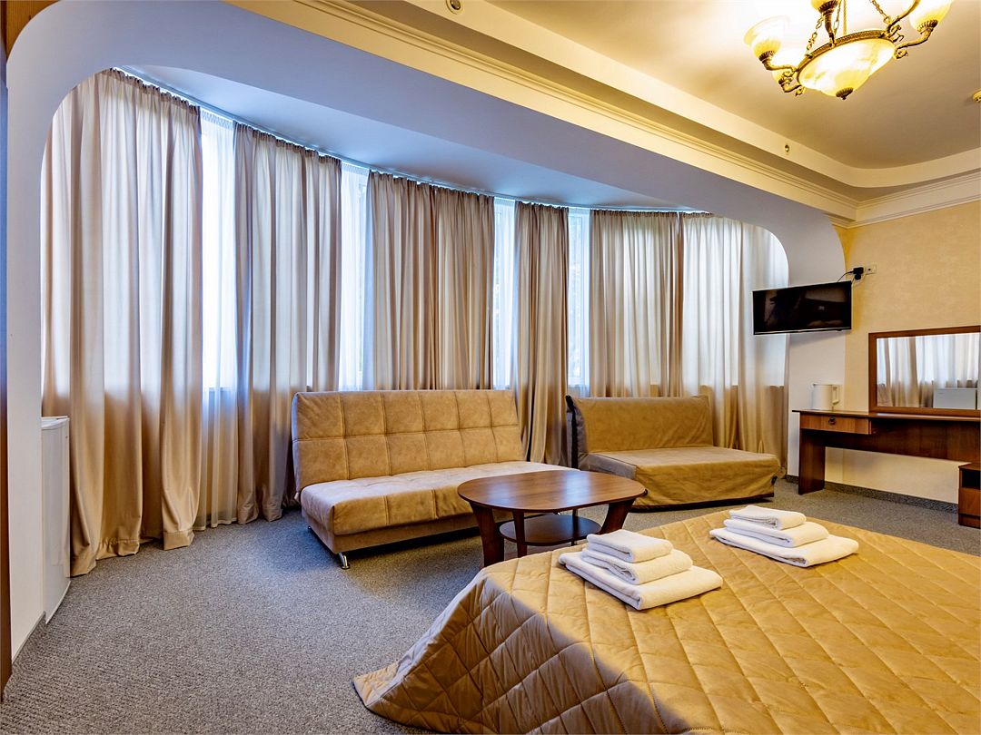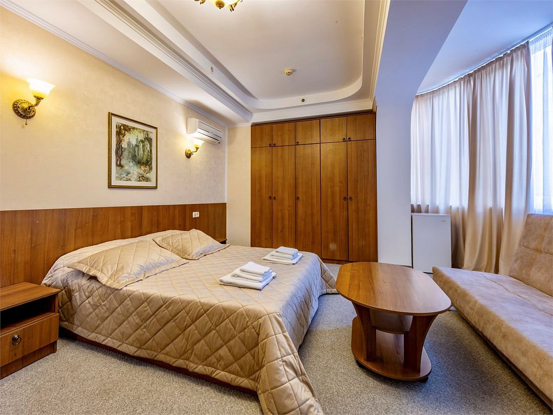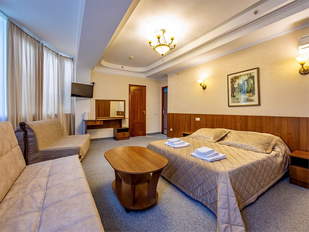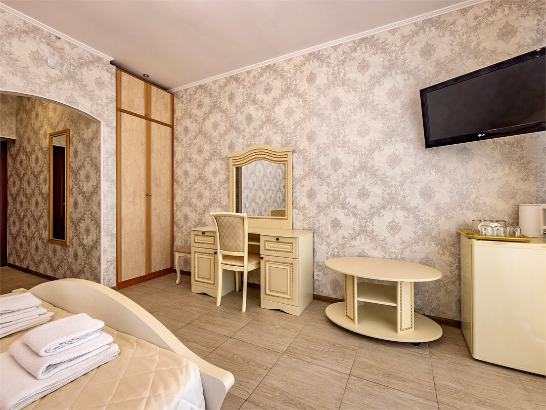 В каждом номере: удобная мягкая мебель, кондиционер, холодильник, спутниковое телевидение, сейф, санузел с душем, туалетом, круглосуточной подачей холодной и горячей воды