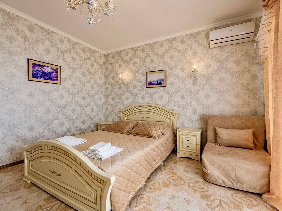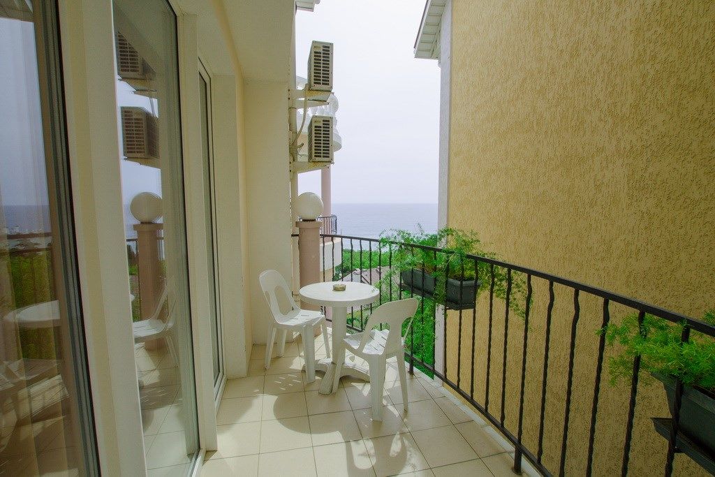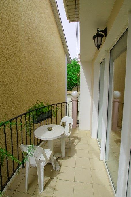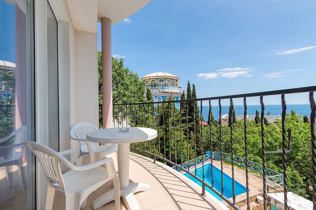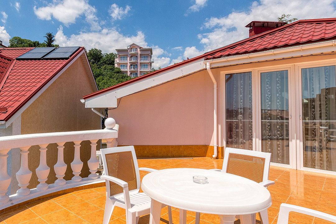 Номер на 2\3\4 этаже площадью 26 м.кв. с открытой террасой 9 м.кв. В номере двухспальная кровать 160х200, раскладной диван кровать 80х200,4е доп место евро раскладушка,телевизор,чайник,холодильник,шкаф для одежды,сейф,Wi-Fi . Ванная комната с душем, горячая и холодная вода круглосуточно. Балкон с боковым частичным видом на море. Номер рассчитан на проживание до 4 человек.4е место доставное.Услуги и удобства