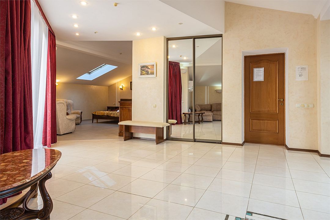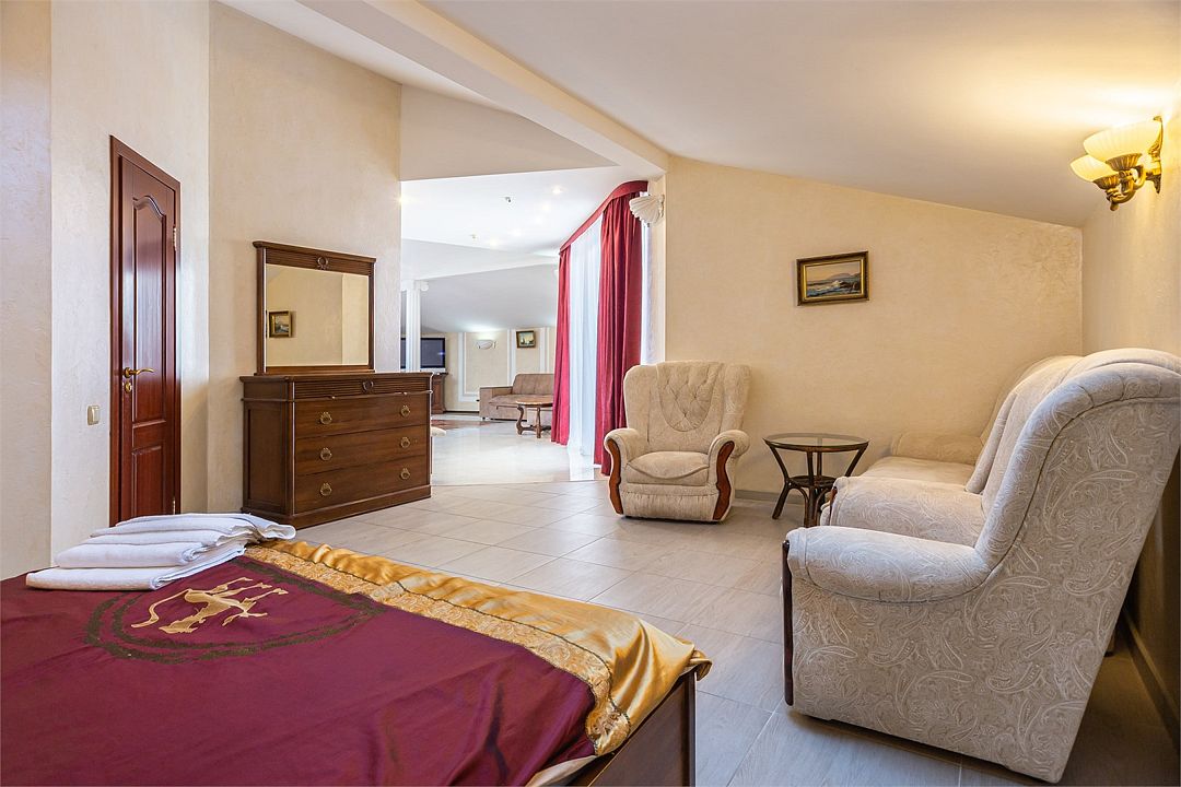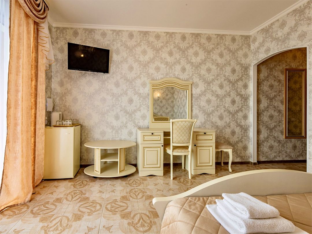 В каждом номере: удобная мягкая мебель, кондиционер, холодильник, спутниковое телевидение, сейф, санузел с душем, туалетом, круглосуточной подачей холодной и горячей воды. Открытая терраса на 32 кв. м.