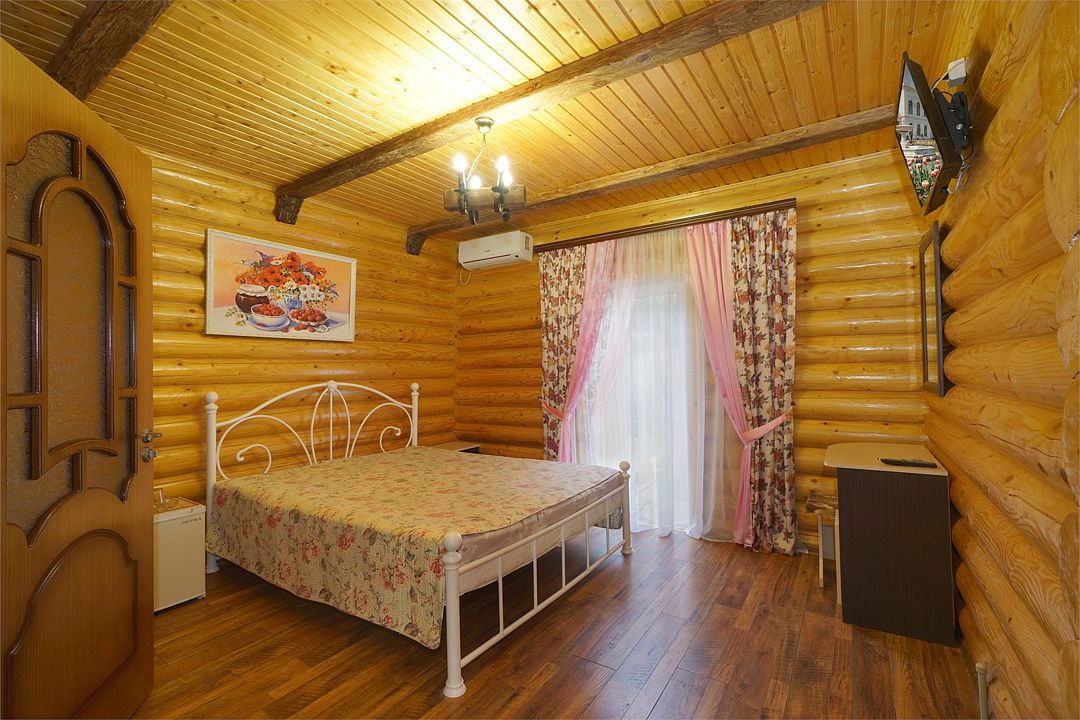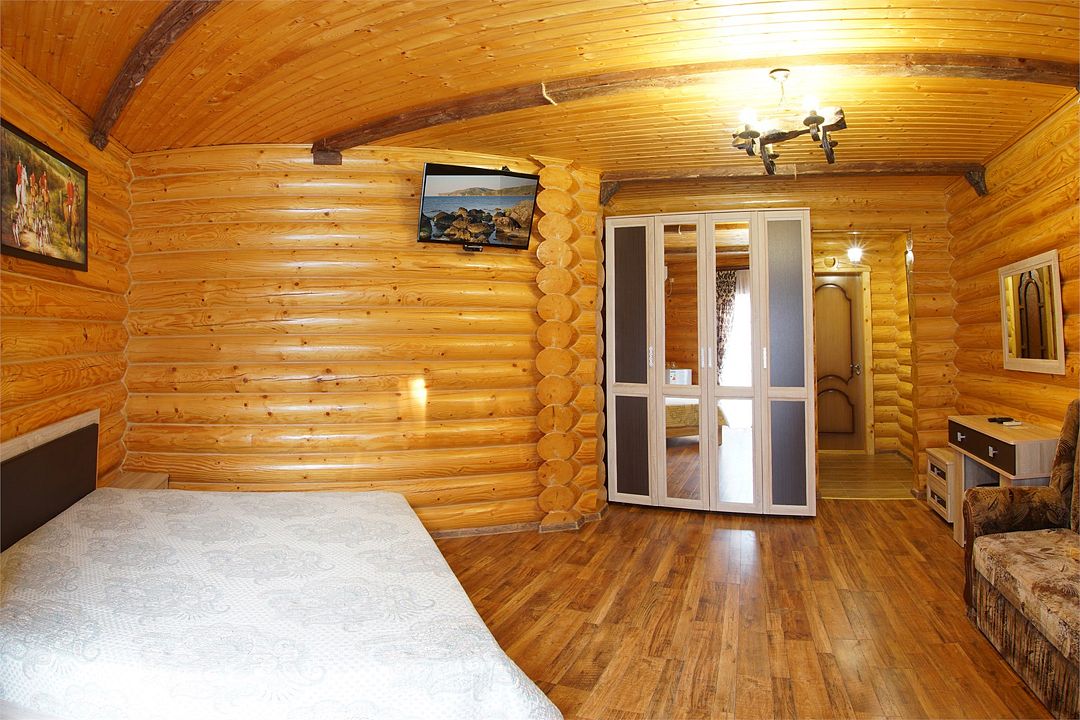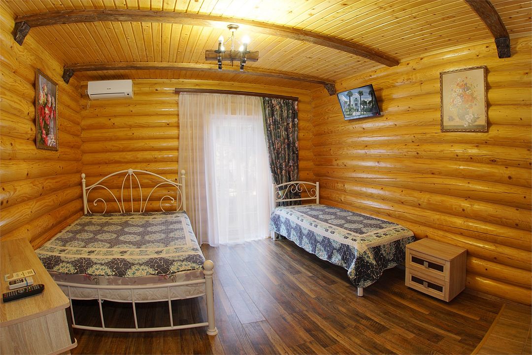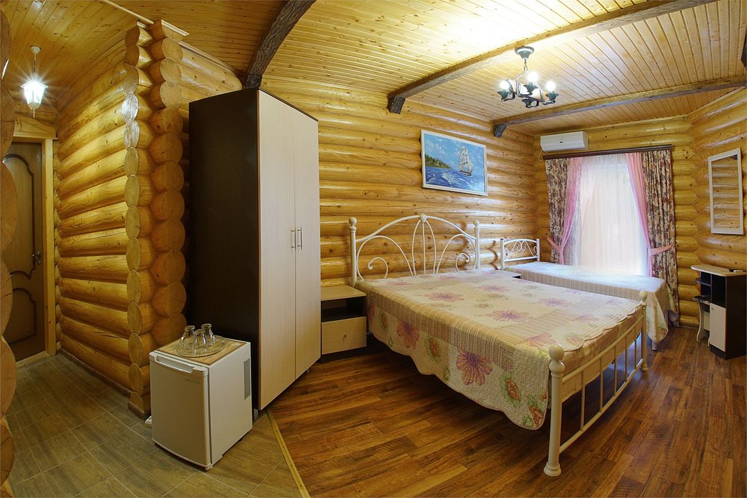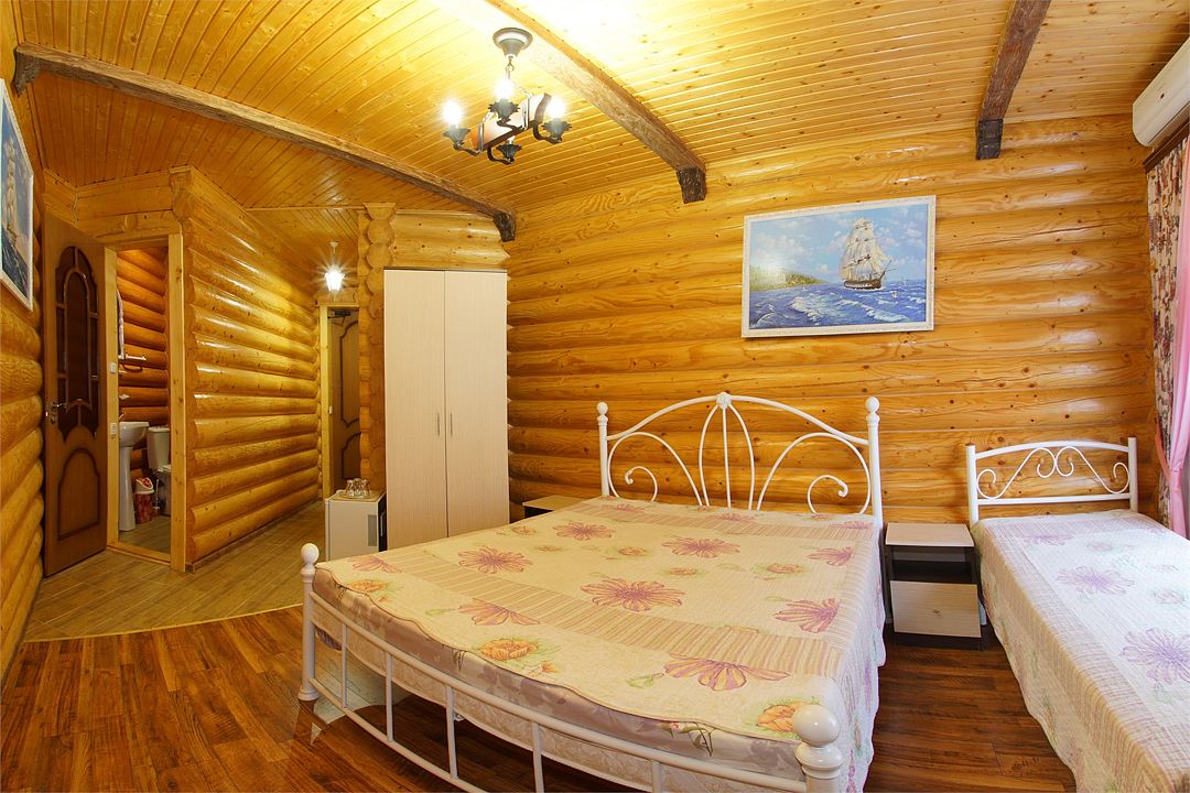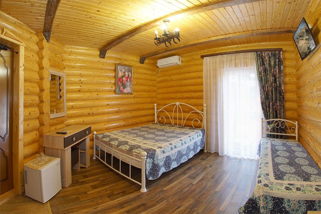 Номера полулюкс 3х-местные расположены в корпусе "сруб" на втором этаже. У номеров есть общая просторная терраса с сушилками для белья. В номере двуспальная кровать и односпальная.Услуги и удобства