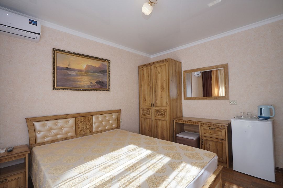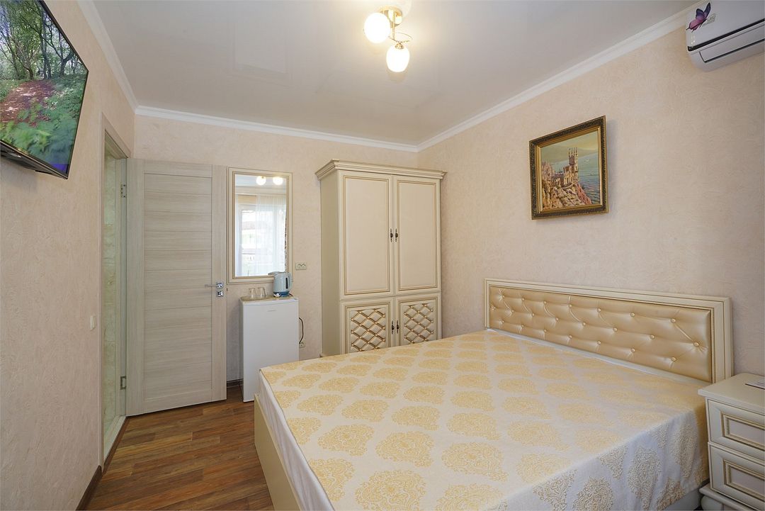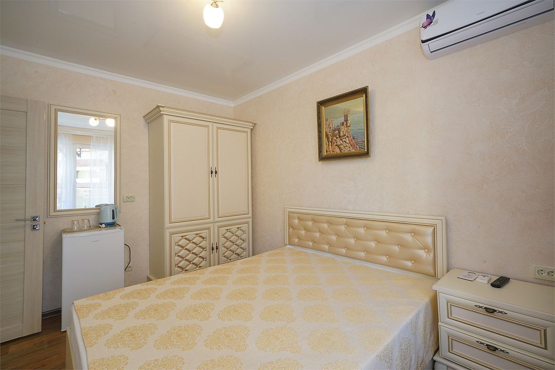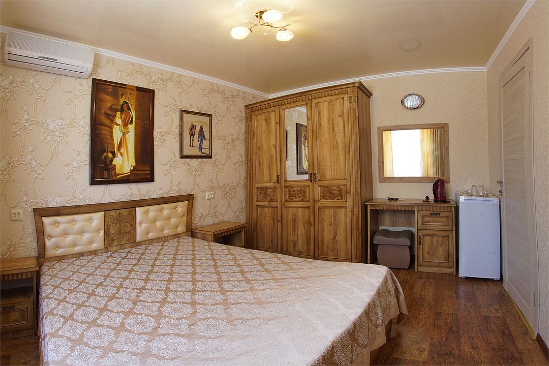 телевизор, Wi-Fi, холодильник, кондиционер, фен, санузел, банные полотенца, двуспальная кровать, тумбы, шкаф для одежды, зеркало, комод, сейф, чайник, раковина, душ, вид во двор, стаканы, туалетные средства, диван-кровать, москитная сетка, общественный бассейн, уборка номера, вешалки-плечики, мыло, вода из артезианской скважины, прачечная (за дополнительную плату), без питомцевВ гостиничном номере