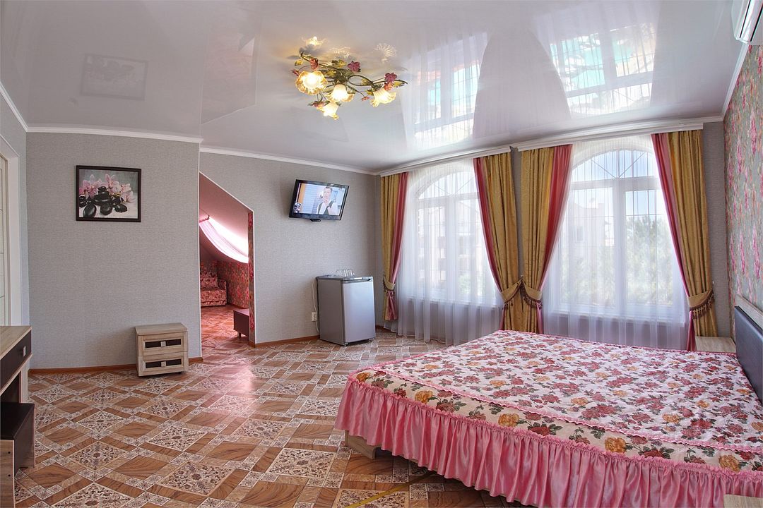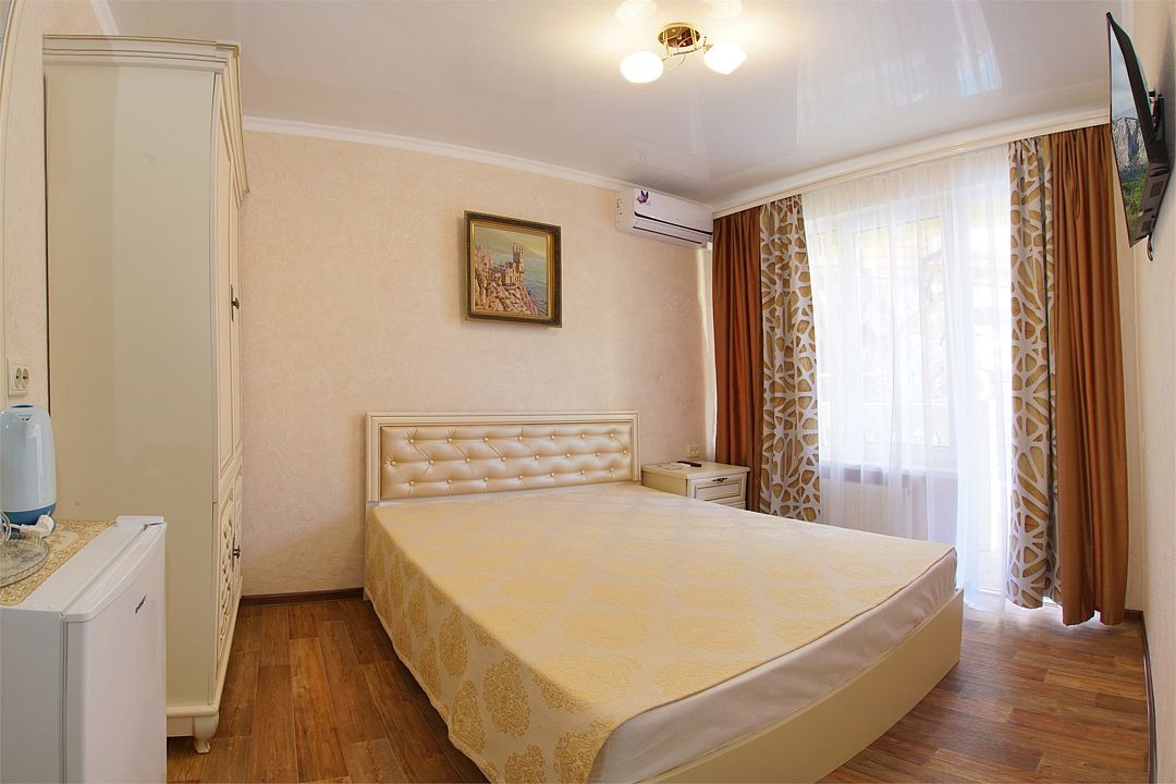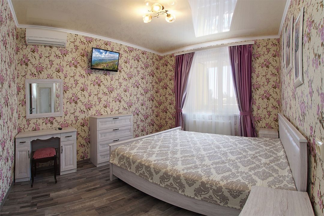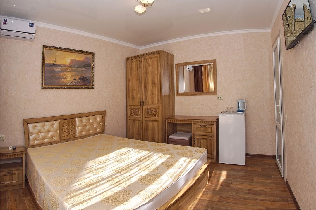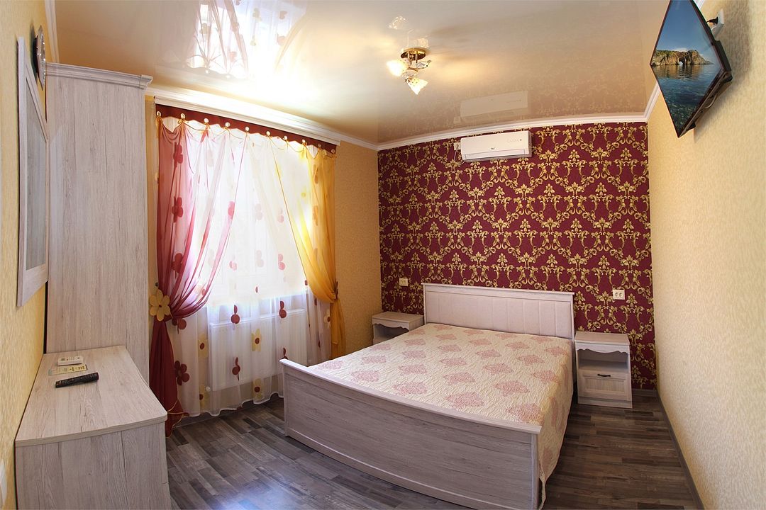 телевизор, Wi-Fi, холодильник, кондиционер, фен, санузел, банные полотенца, двуспальная кровать, тумбы, шкаф для одежды, зеркало, комод, сейф, чайник, раковина, душ, вид во двор, стаканы, туалетные средства, диван-кровать, москитная сетка, общественный бассейн, уборка номера, вешалки-плечики, мыло, вода из артезианской скважины, прачечная (за дополнительную плату), без питомцевВ гостиничном номере