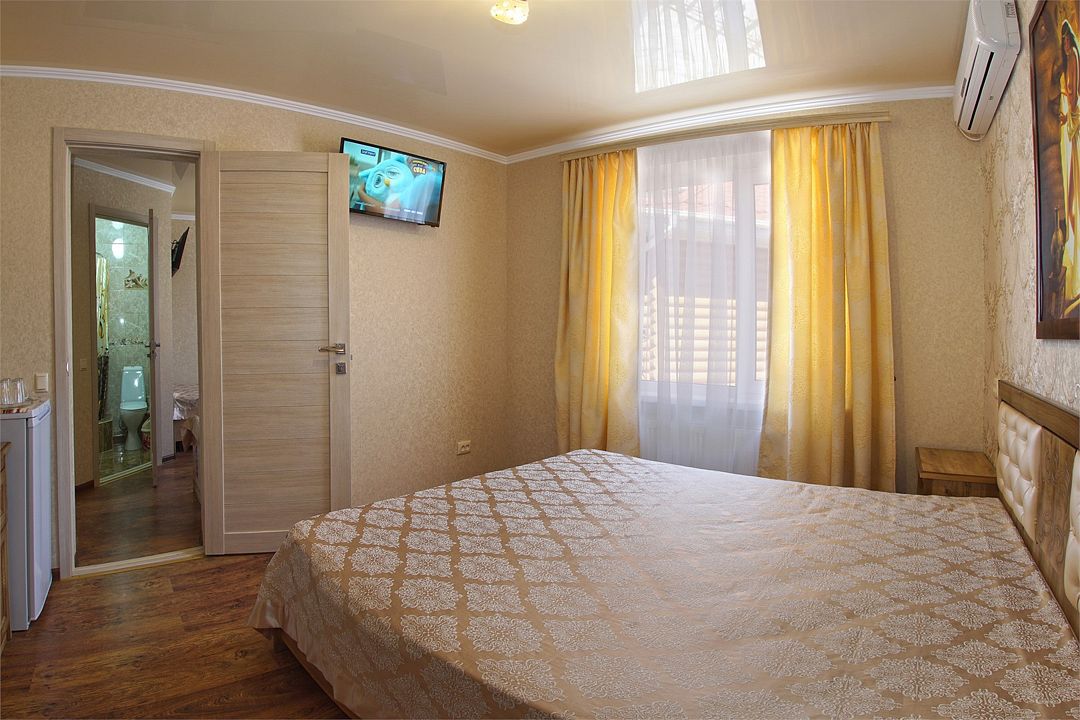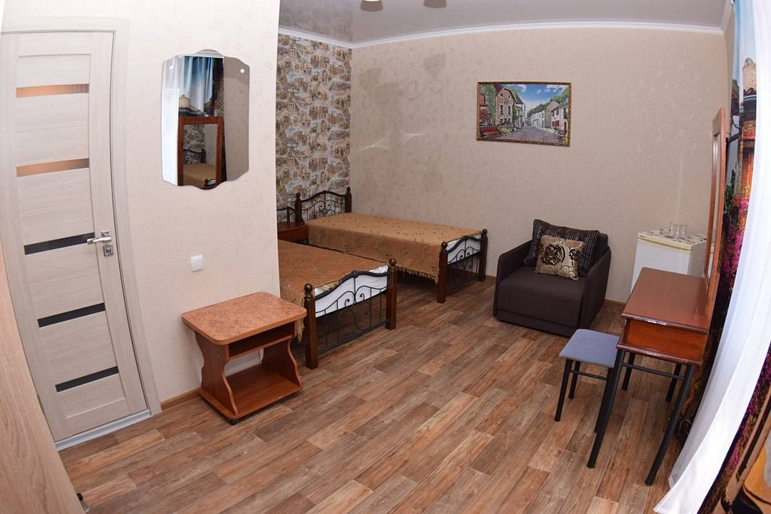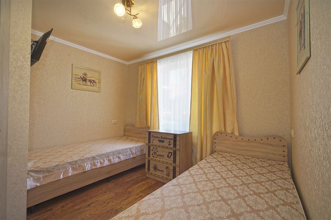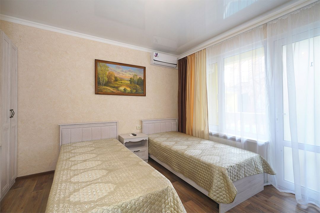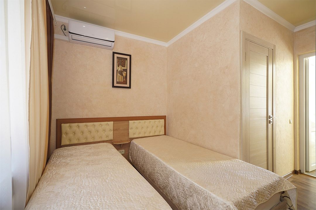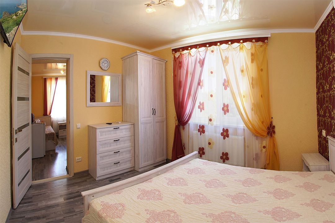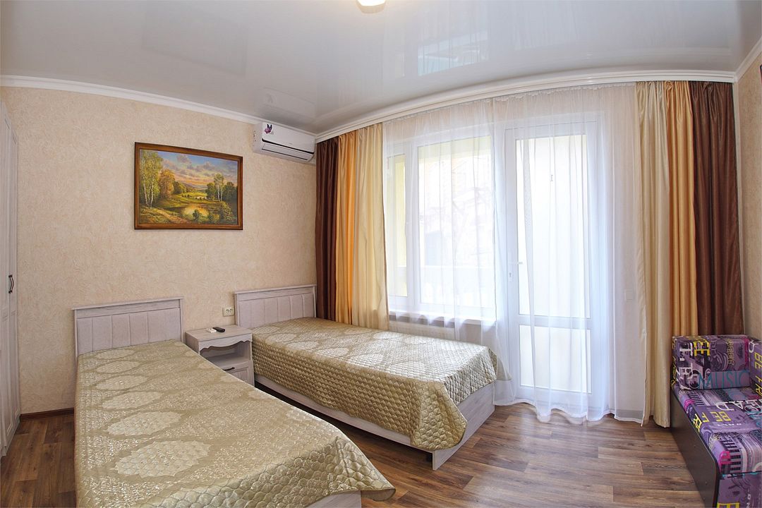 Просторный семейные номера из двух комнат, без межкомнатных дверей. Номера расположены на 3м этаже, без балкона, есть общая терраса с сушилками для белья. В номерах двуспальная кровать и раскладной диван-кровать 140 на 200 м.Услуги и удобства