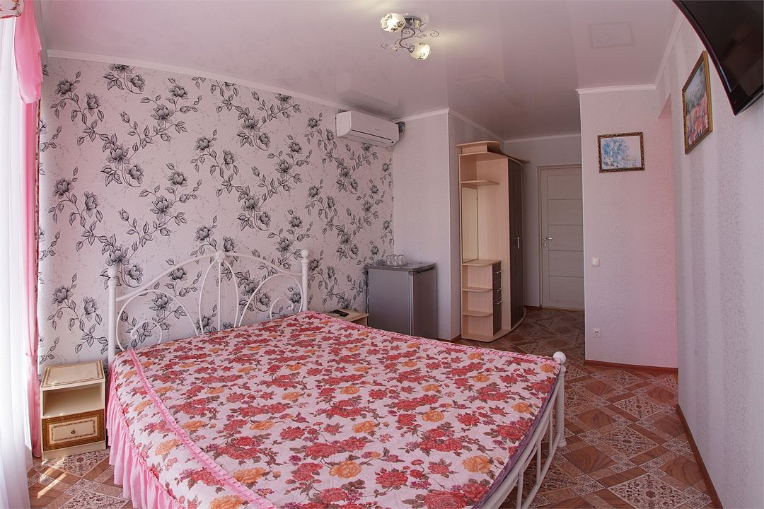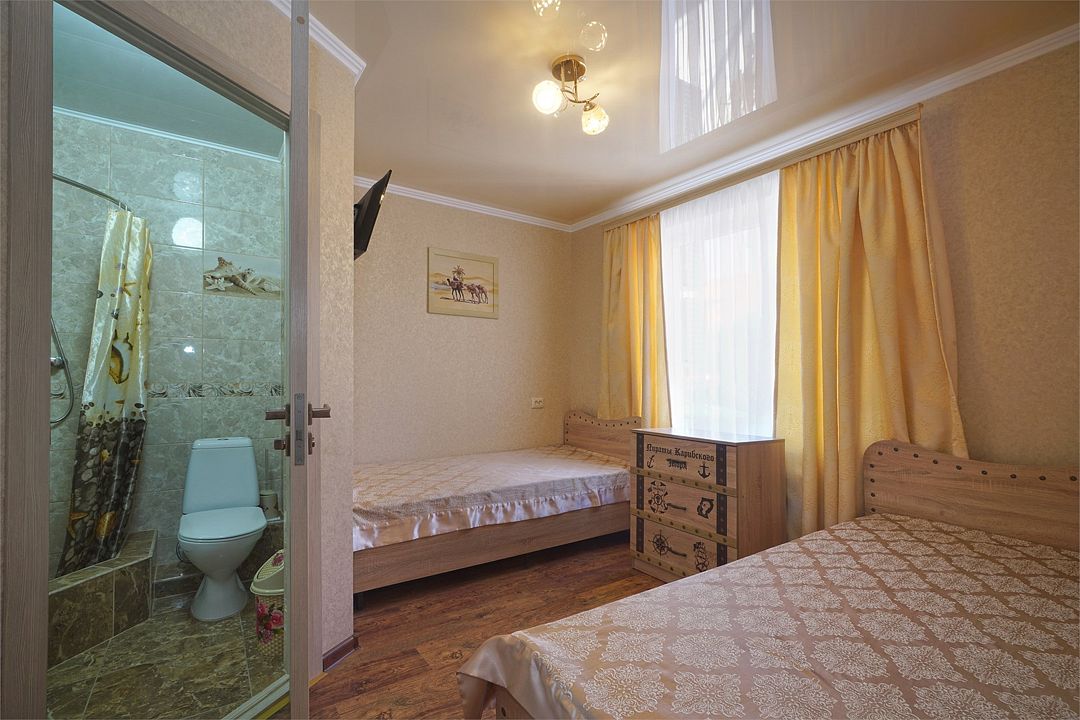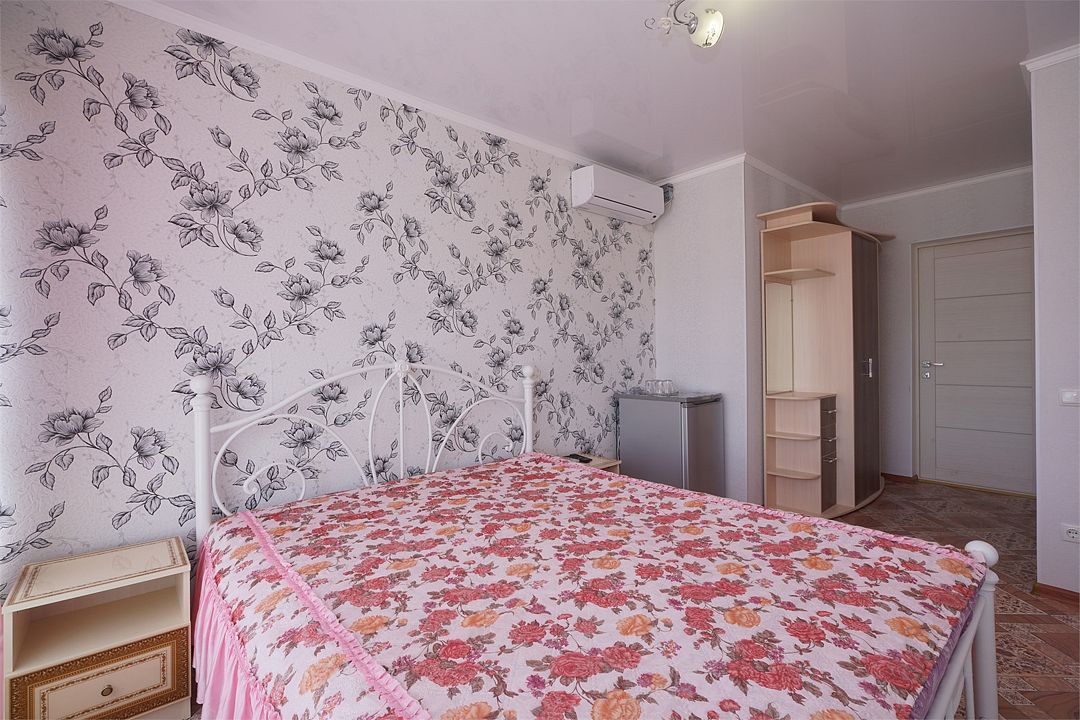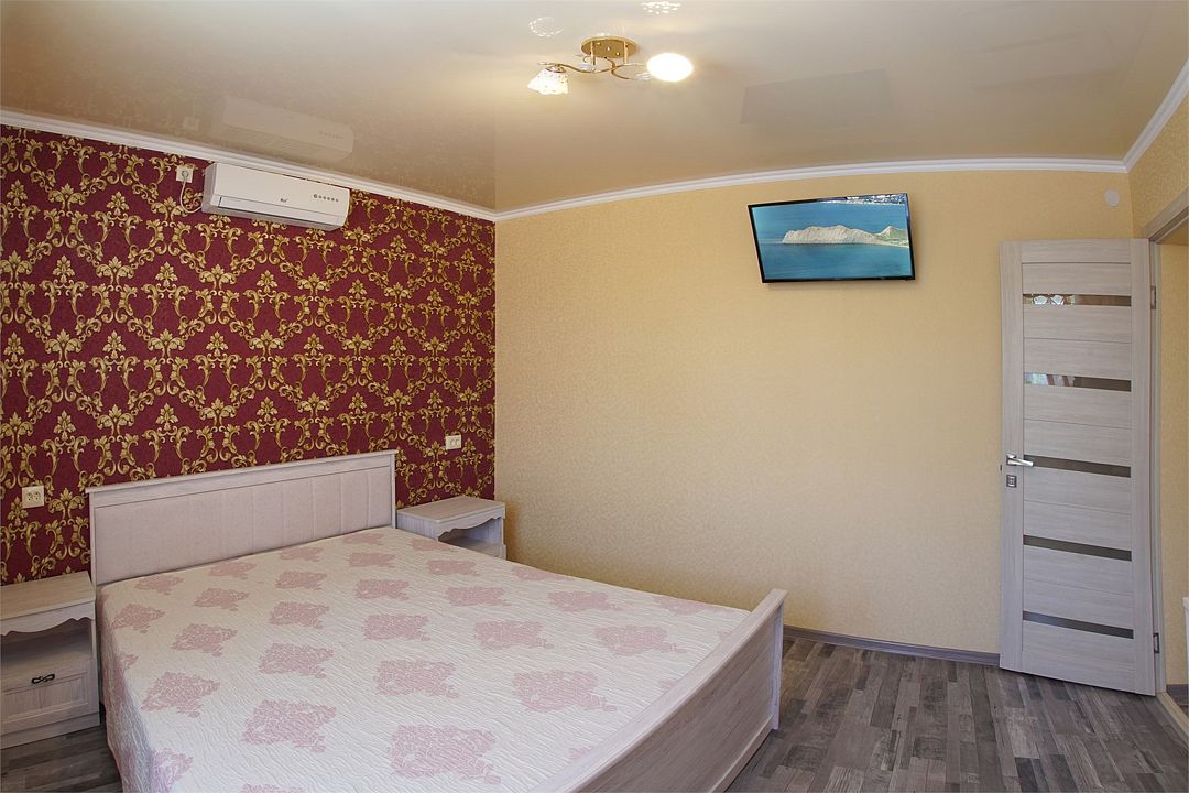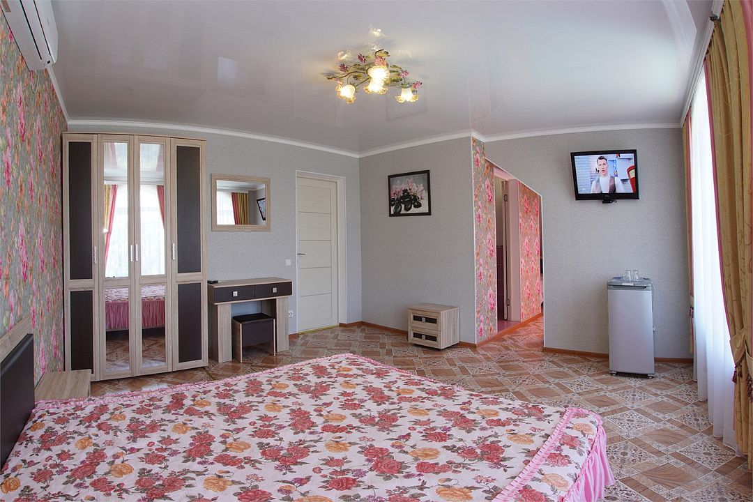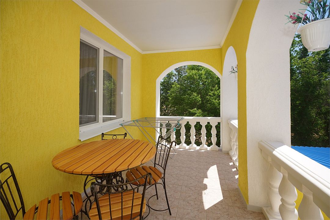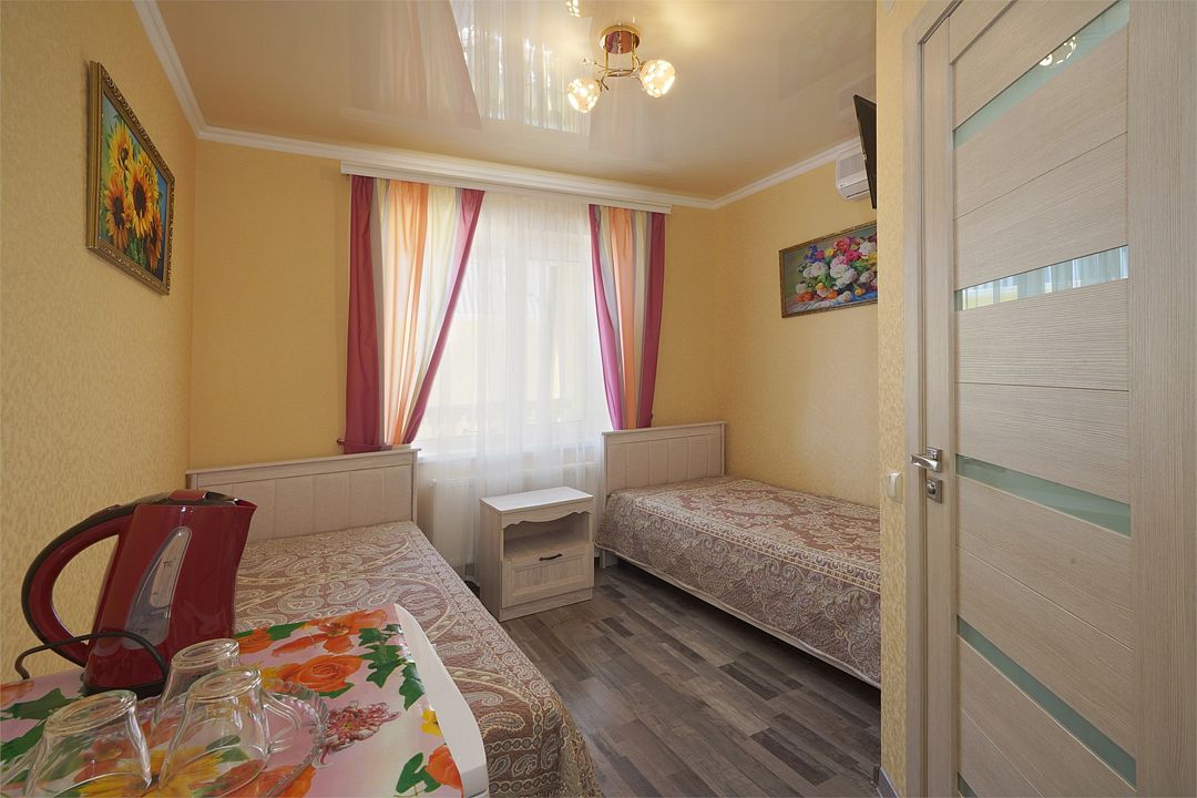 Просторный семейные номера из двух комнат, без межкомнатных дверей. Номера расположены на 3м этаже, без балкона, есть общая терраса с сушилками для белья. В номерах двуспальная кровать и раскладной диван-кровать 140 на 200 м.Услуги и удобства