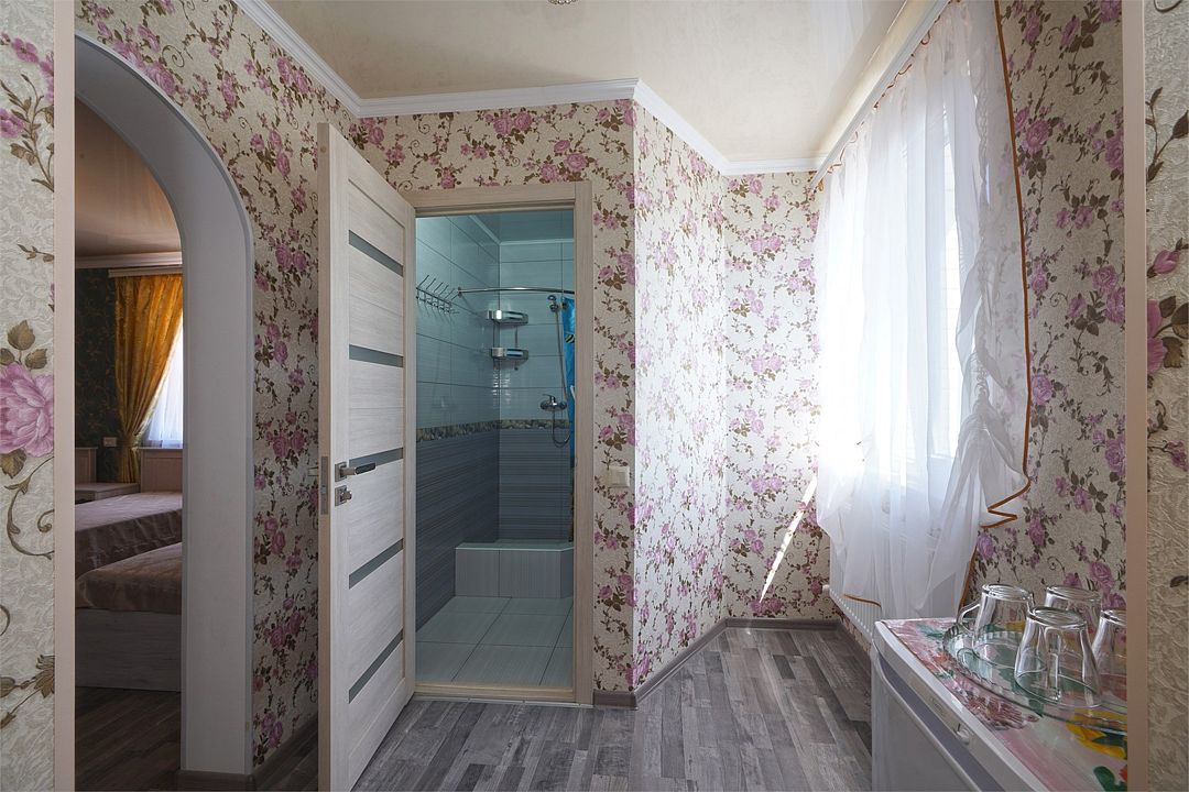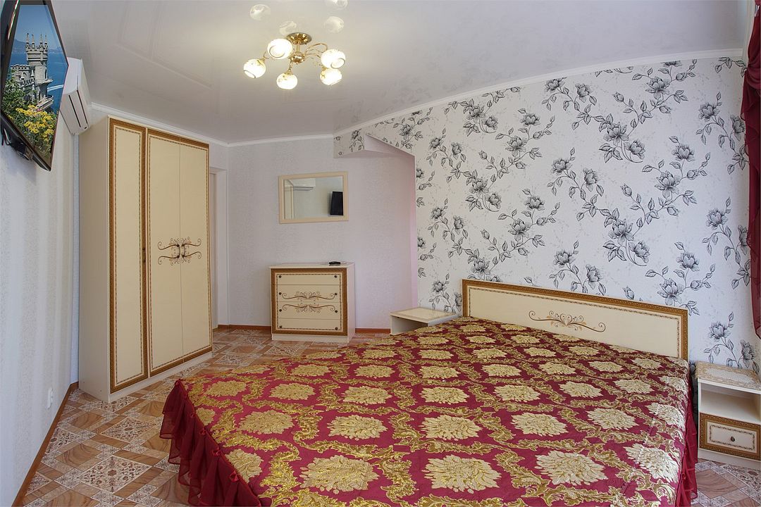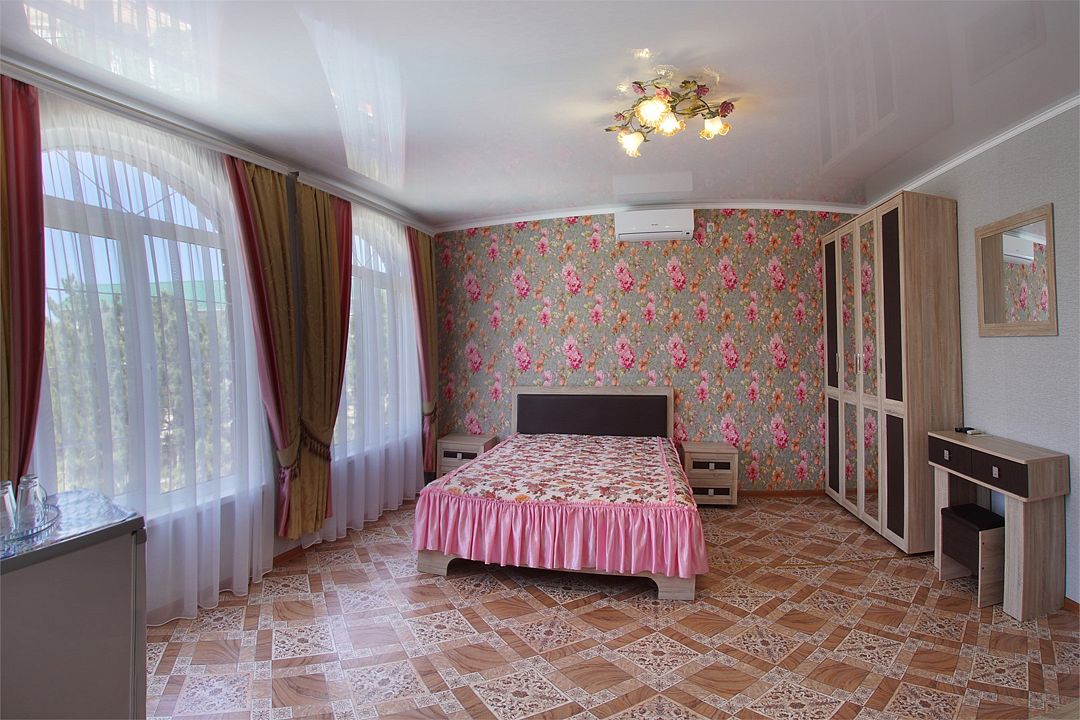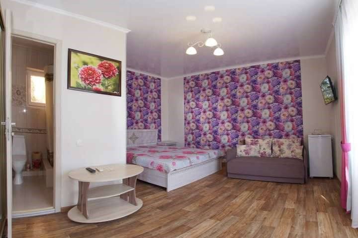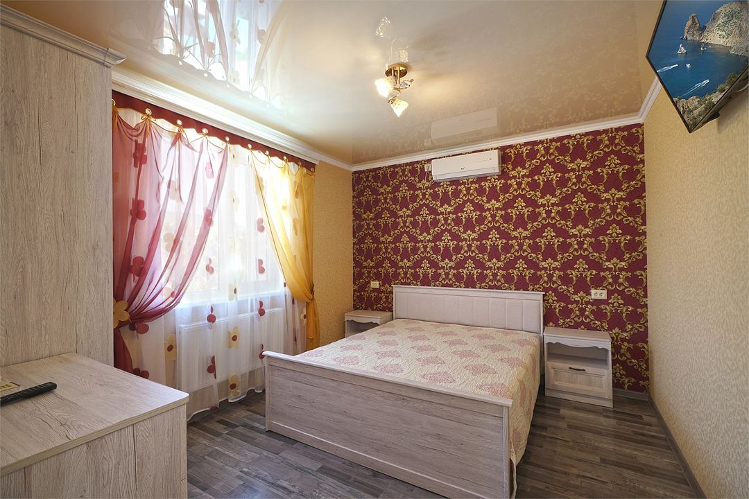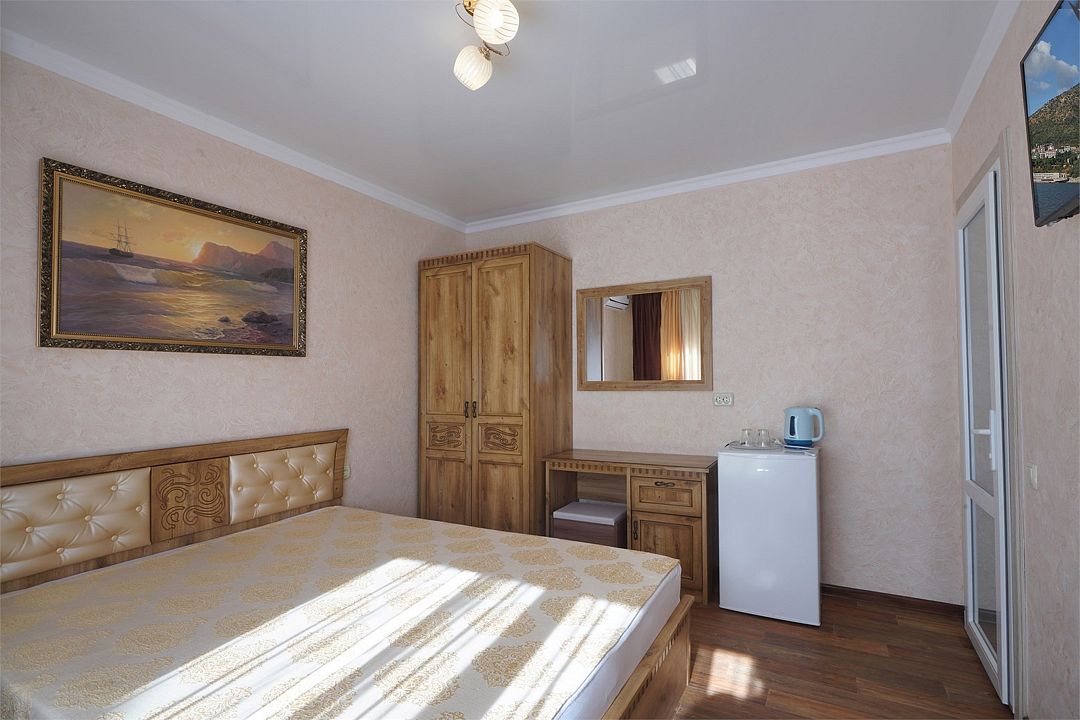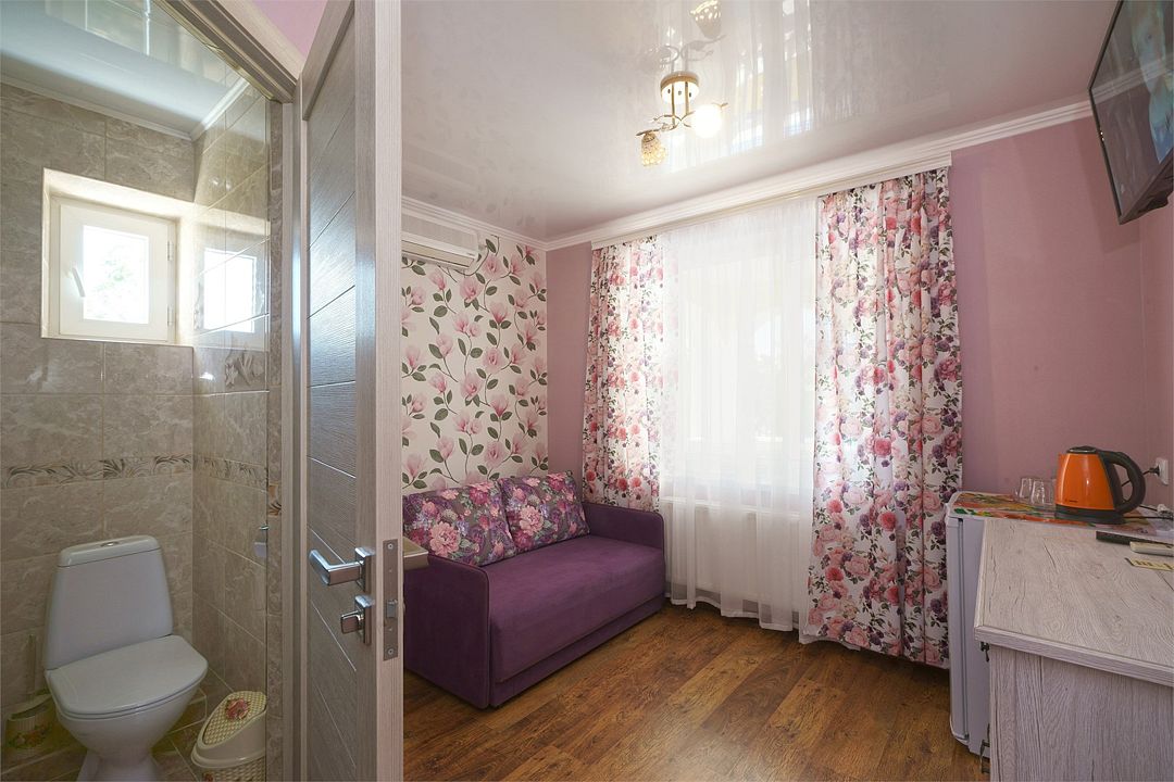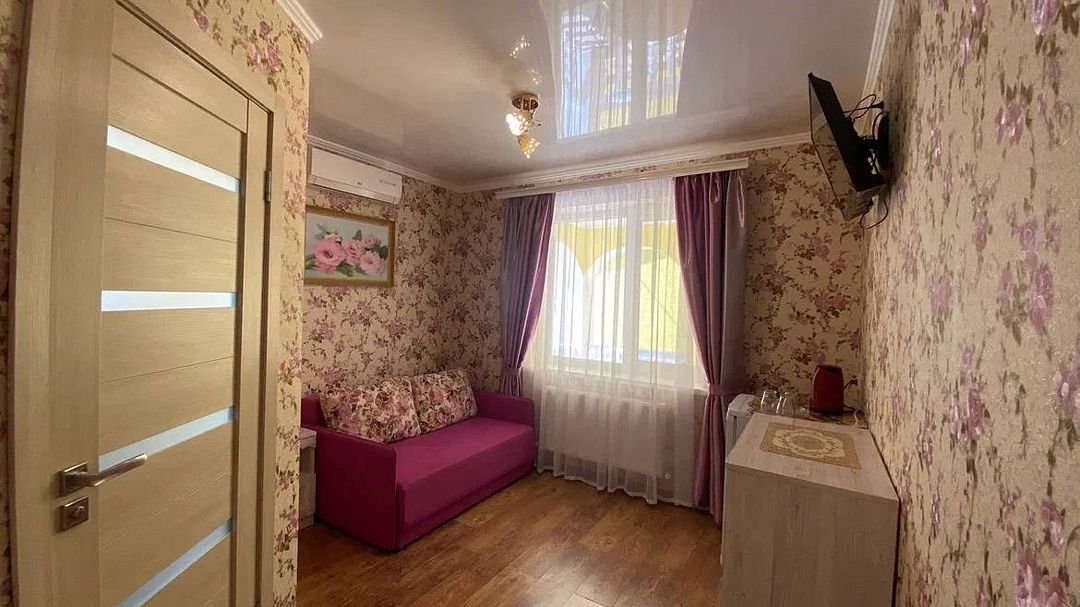 Просторный семейные номера из двух комнат, без межкомнатных дверей. Номера расположены на 3м этаже, без балкона, есть общая терраса с сушилками для белья. В номерах двуспальная кровать и раскладной диван-кровать 140 на 200 м.Услуги и удобства