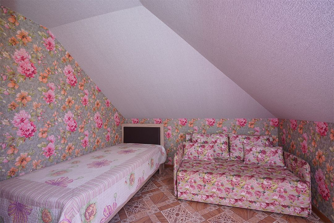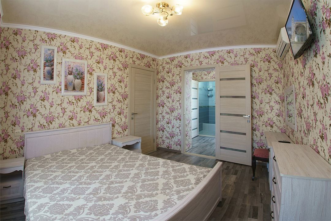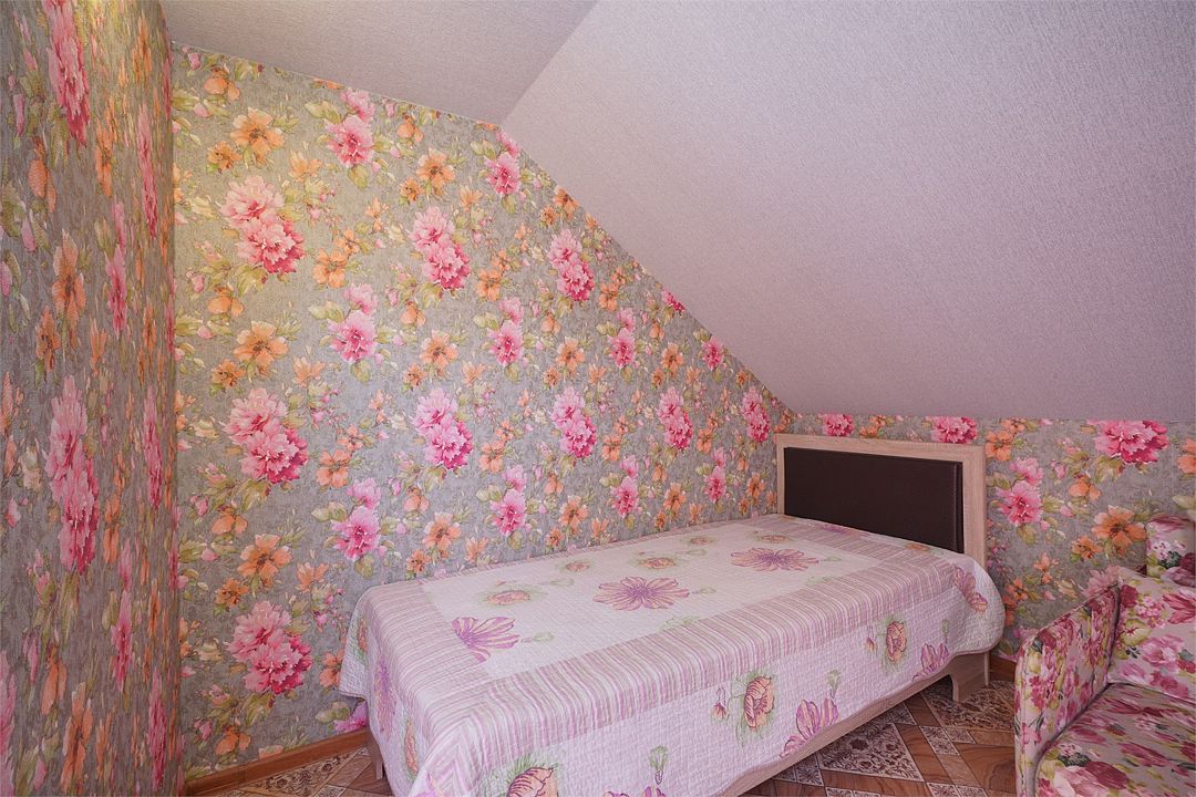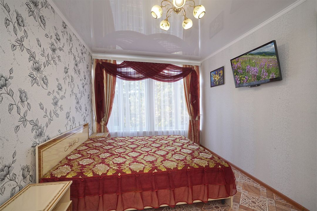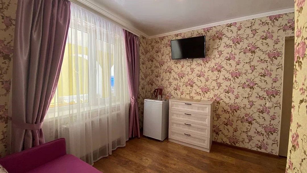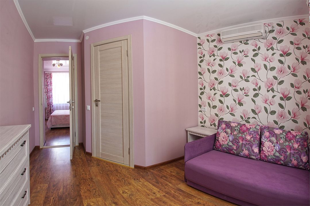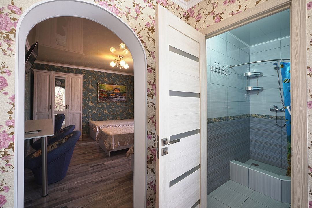 Просторный семейные номера из двух комнат, без межкомнатных дверей. Номера расположены на 3м этаже, без балкона, есть общая терраса с сушилками для белья. В номерах двуспальная кровать и раскладной диван-кровать 140 на 200 м.Услуги и удобства