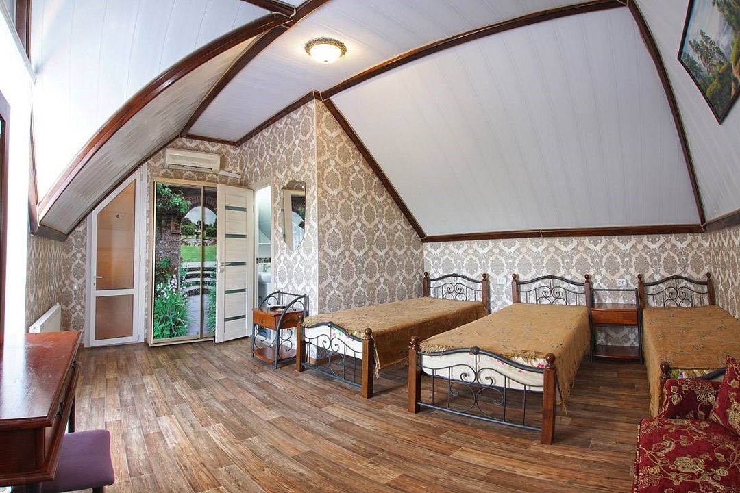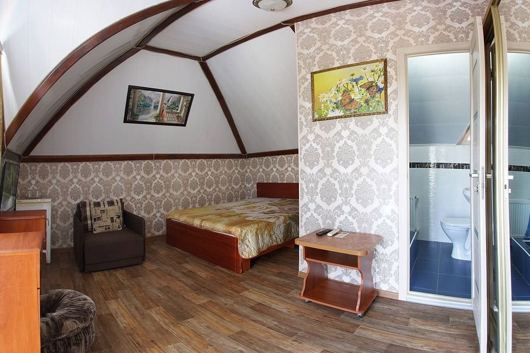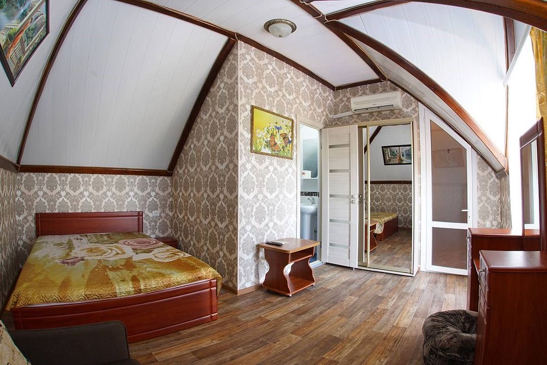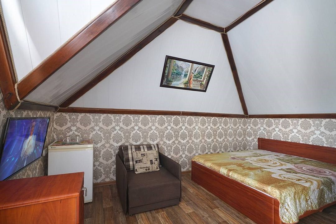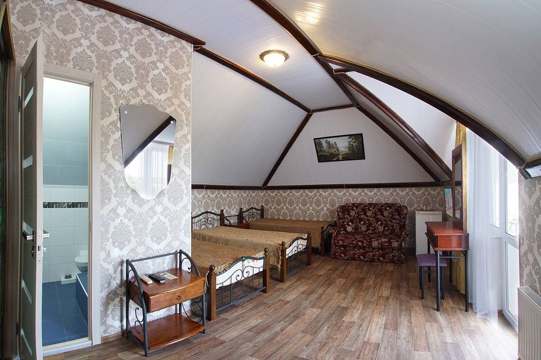 телевизор, Wi-Fi, холодильник, кондиционер, фен, санузел, банные полотенца, двуспальная кровать, тумбы, шкаф для одежды, зеркало, комод, сейф, чайник, раковина, душ, стаканы, стол, туалетные средства, диван-кровать, мансардные окна, общественный бассейн, уборка номера, вешалки-плечики, мыло, вода из артезианской скважины, прачечная (за дополнительную плату), без питомцевВ гостиничном номере