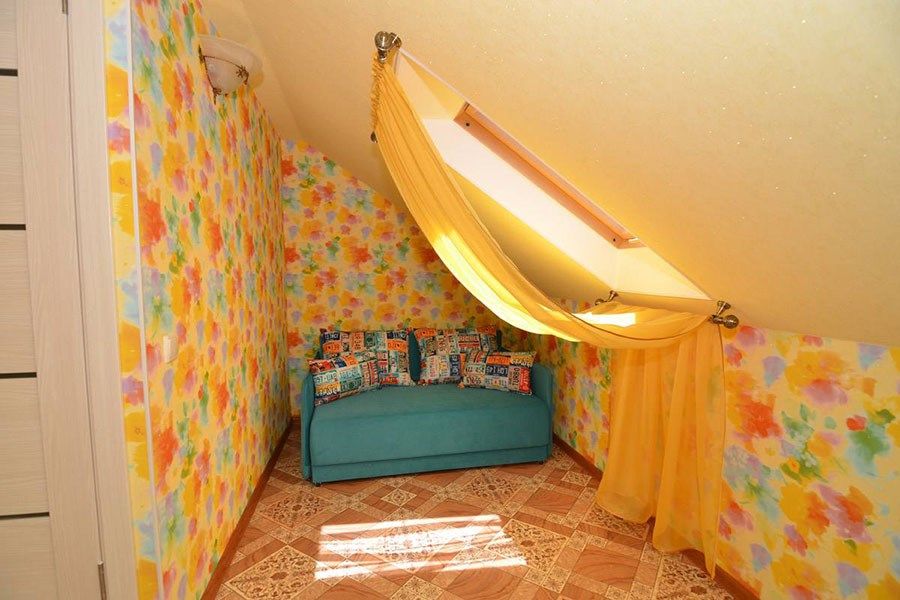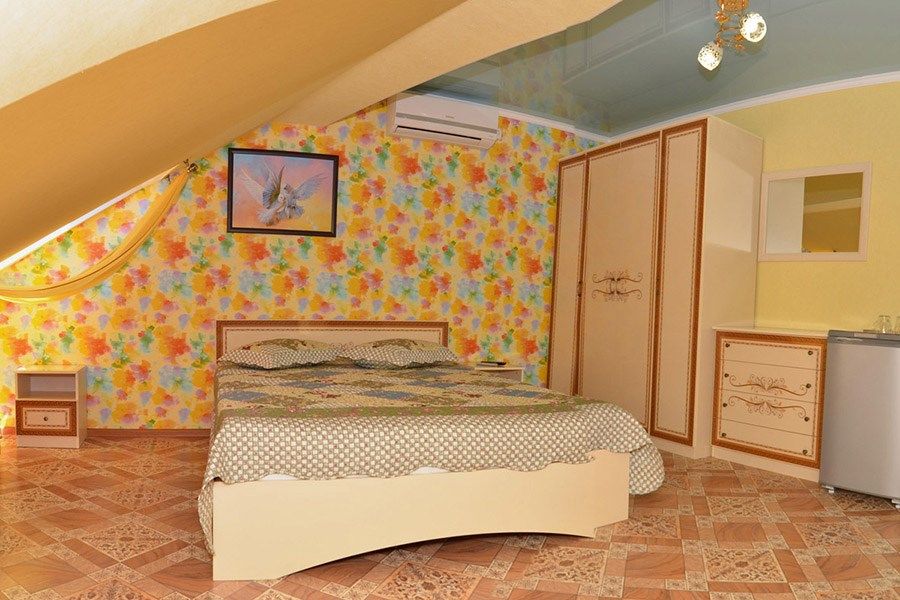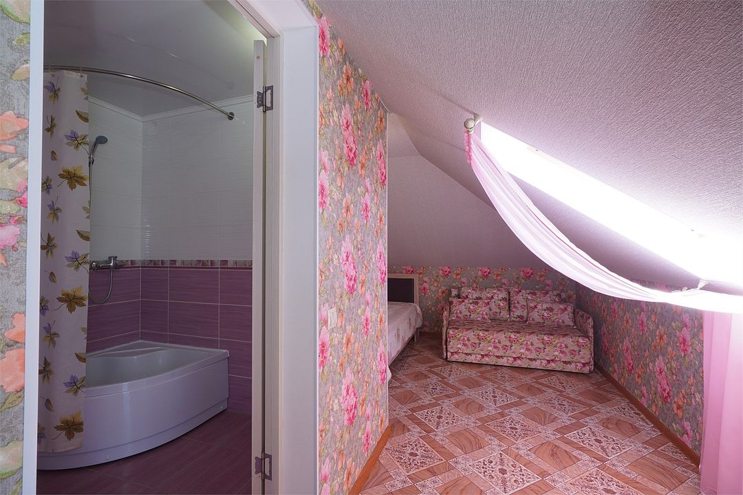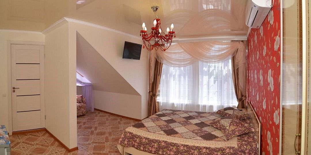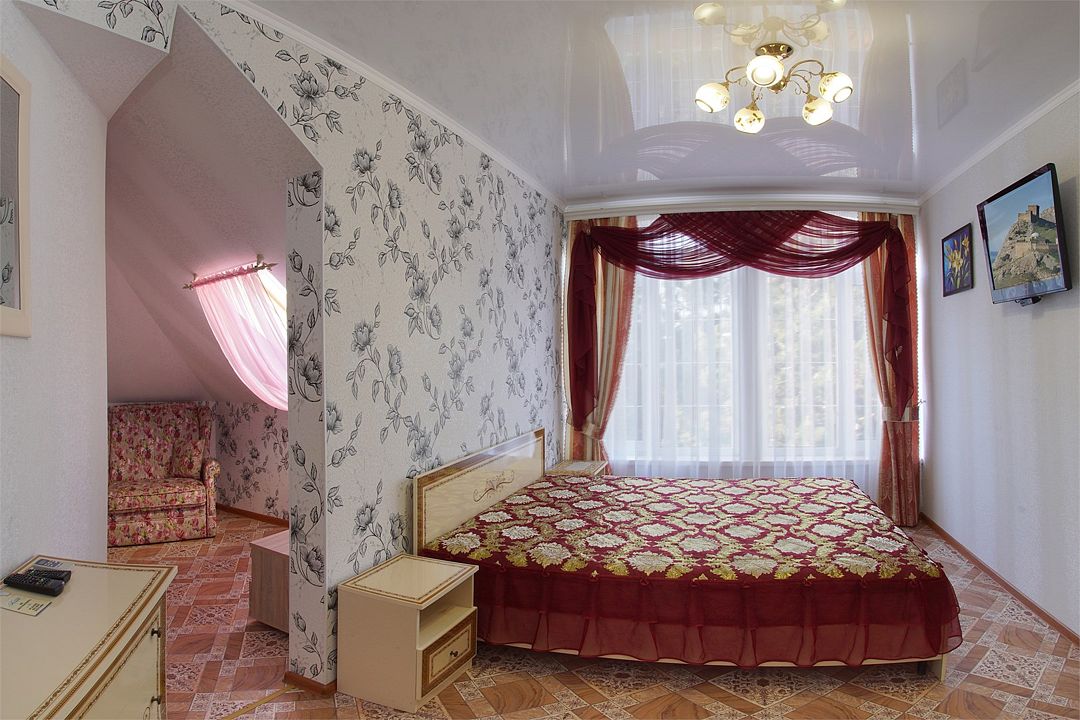 телевизор, Wi-Fi, холодильник, кондиционер, фен, санузел, банные полотенца, двуспальная кровать, тумбы, шкаф для одежды, зеркало, комод, сейф, чайник, раковина, душ, стаканы, стол, туалетные средства, диван-кровать, мансардные окна, общественный бассейн, уборка номера, вешалки-плечики, мыло, вода из артезианской скважины, прачечная (за дополнительную плату), без питомцевВ гостиничном номере