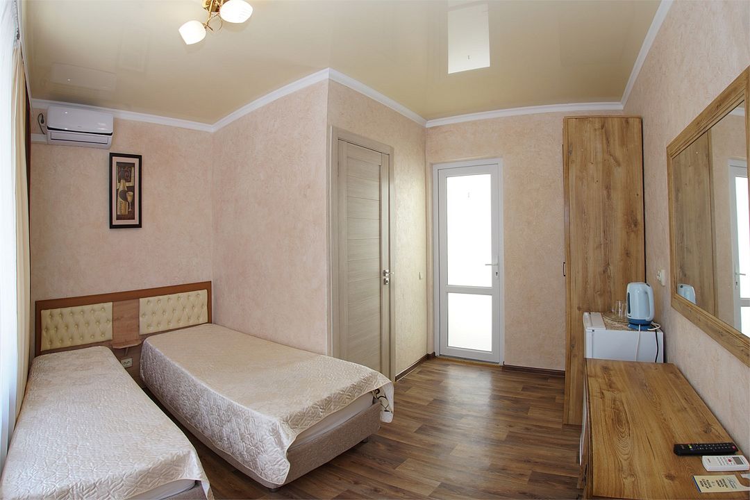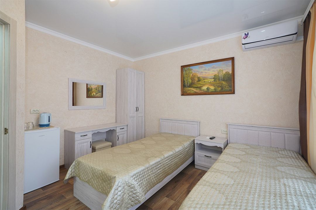 телевизор, Wi-Fi, холодильник, кондиционер, фен, санузел, банные полотенца, терраса, две односпальные кровати, стулья, шкаф для одежды, зеркало, сейф, чайник, раковина, отдельный вход в номер, душ, стаканы, туалетный столик, стол, тумба, туалетный столик, туалетные средства, сушилка для белья, москитная сетка, пуфик, общественный бассейн, уборка номера, услуги прачечной (платно), вешалки-плечики, мыло, затемняющая штора, вода из артезианской скважины, без питомцевВ гостиничном номере